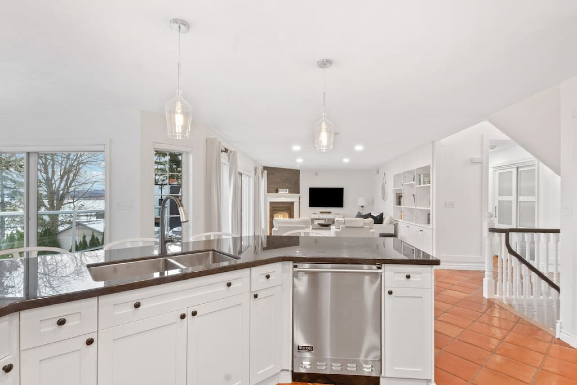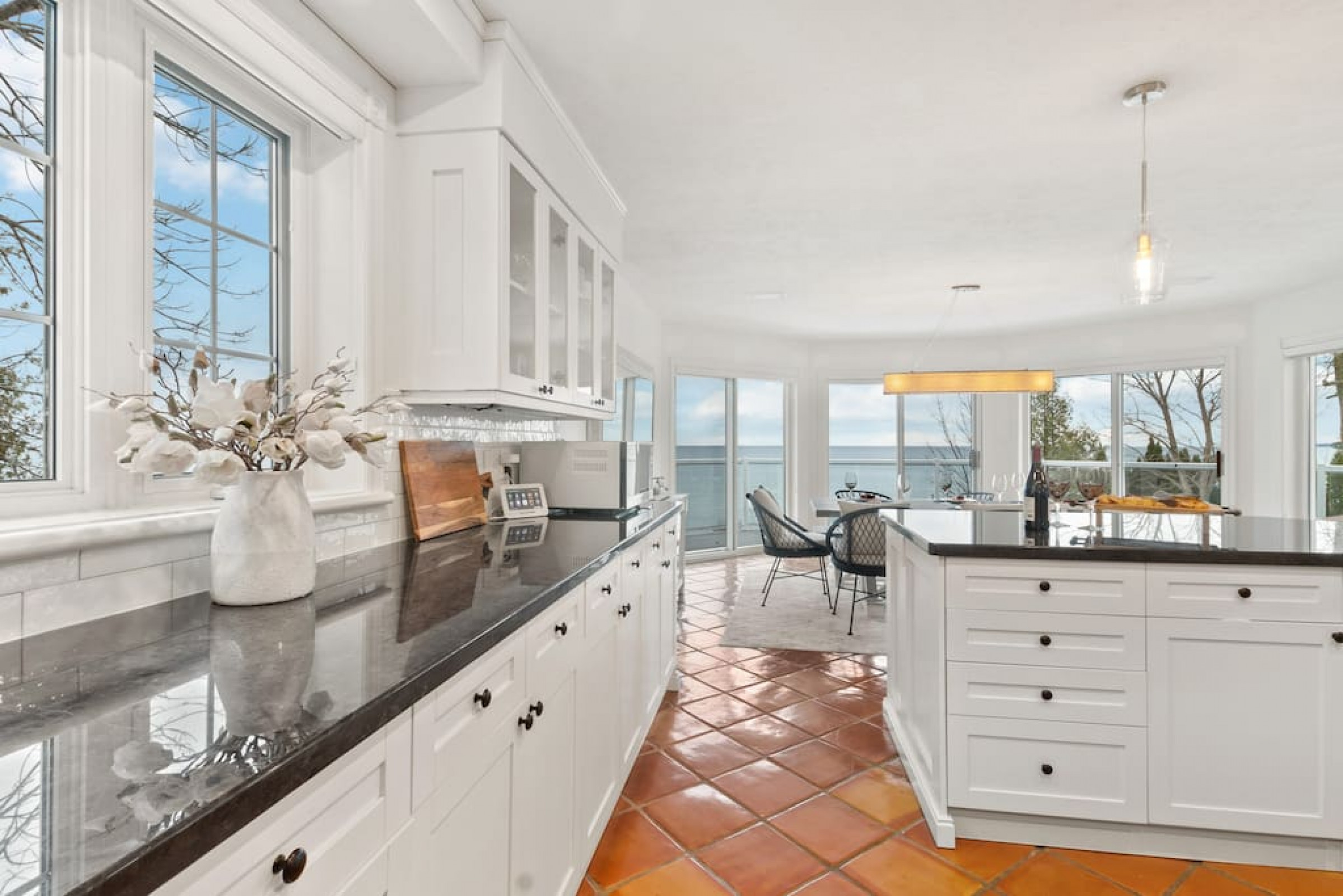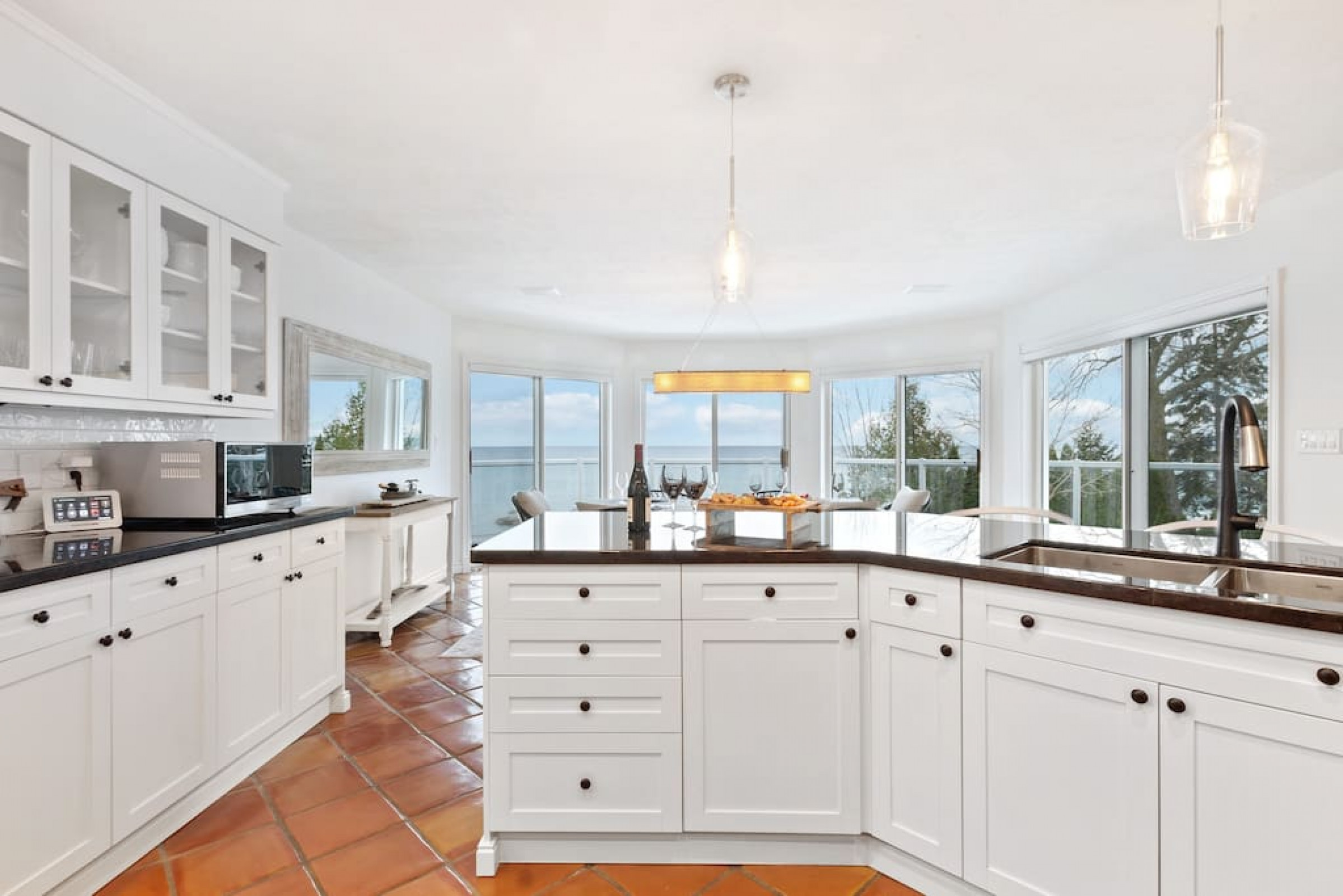 The cottage features a lovely kitchen with granite countertops, custom cabinetry, and stainless steel appliances. Enjoy your morning coffee on the wrap-around deck with panoramic water views. The dining area provides the perfect setting for meals with a view. You’ll find cookware, bakeware, cutlery, utensils, and BBQ tools to use during your stay. All you need to bring is your food, spices, and coffee!