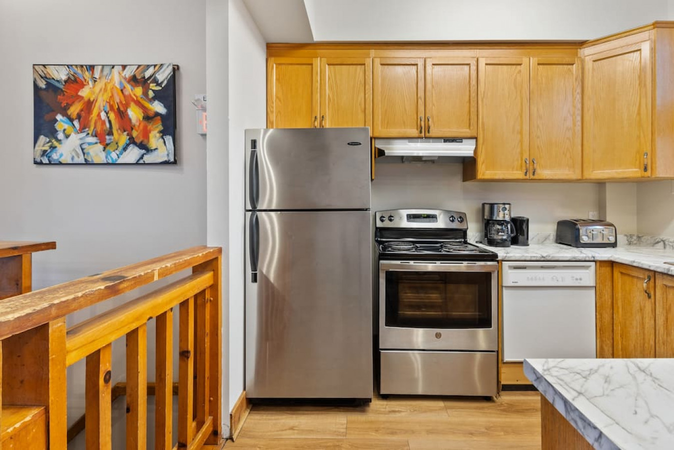 You’ll only need to bring your food and spices -cookware, bakeware, and cutlery are available during your stay. Delight in the mountain views as you make breakfast on the stove and make use of the dishwasher to make cleaning a breeze. The kitchen features ample cupboard space for storage, a coffee maker, a microwave and fridge.