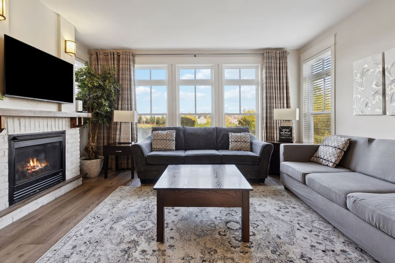 The spacious living room is perfect for relaxation. You will have a view of the Monterra Golf Course in the backyard. The living room features a Queen pull out sofa bed.