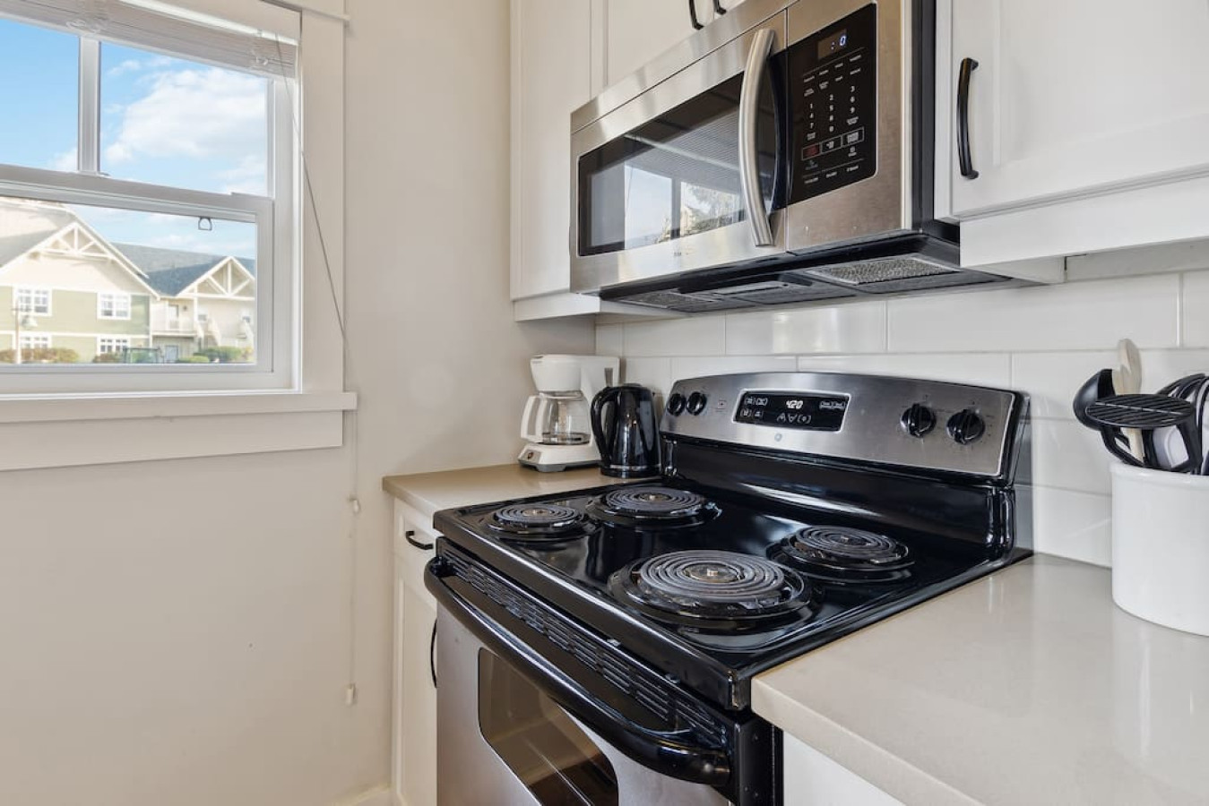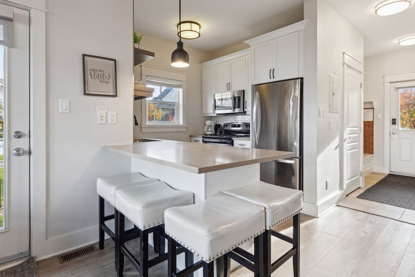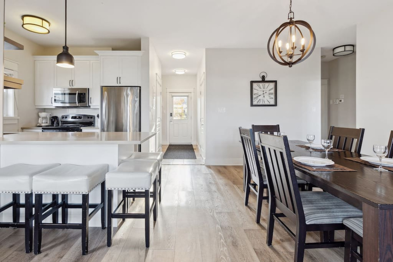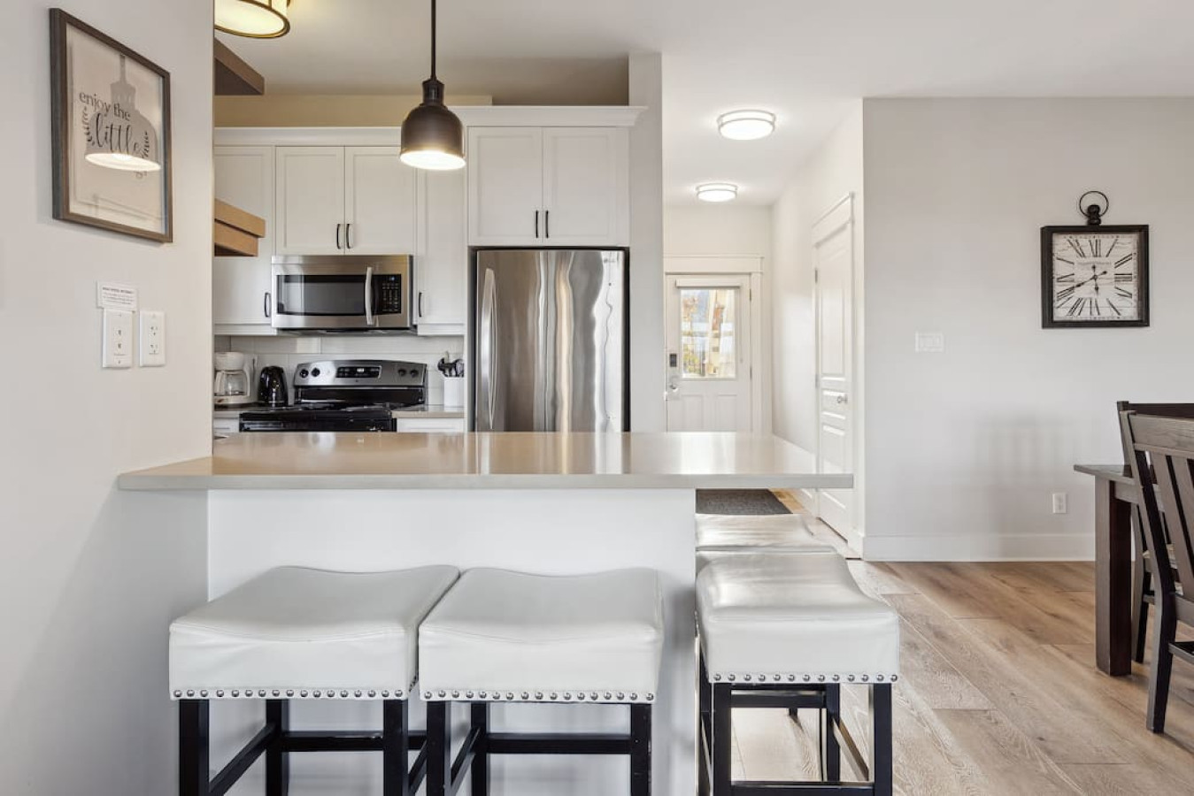 A fully equipped kitchen is ready for your culinary adventures. No need to bring your own cutlery or bakeware! It's a great place for conversation and cooking in an open layout.