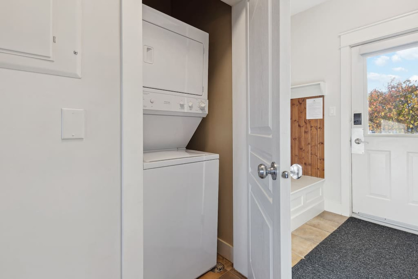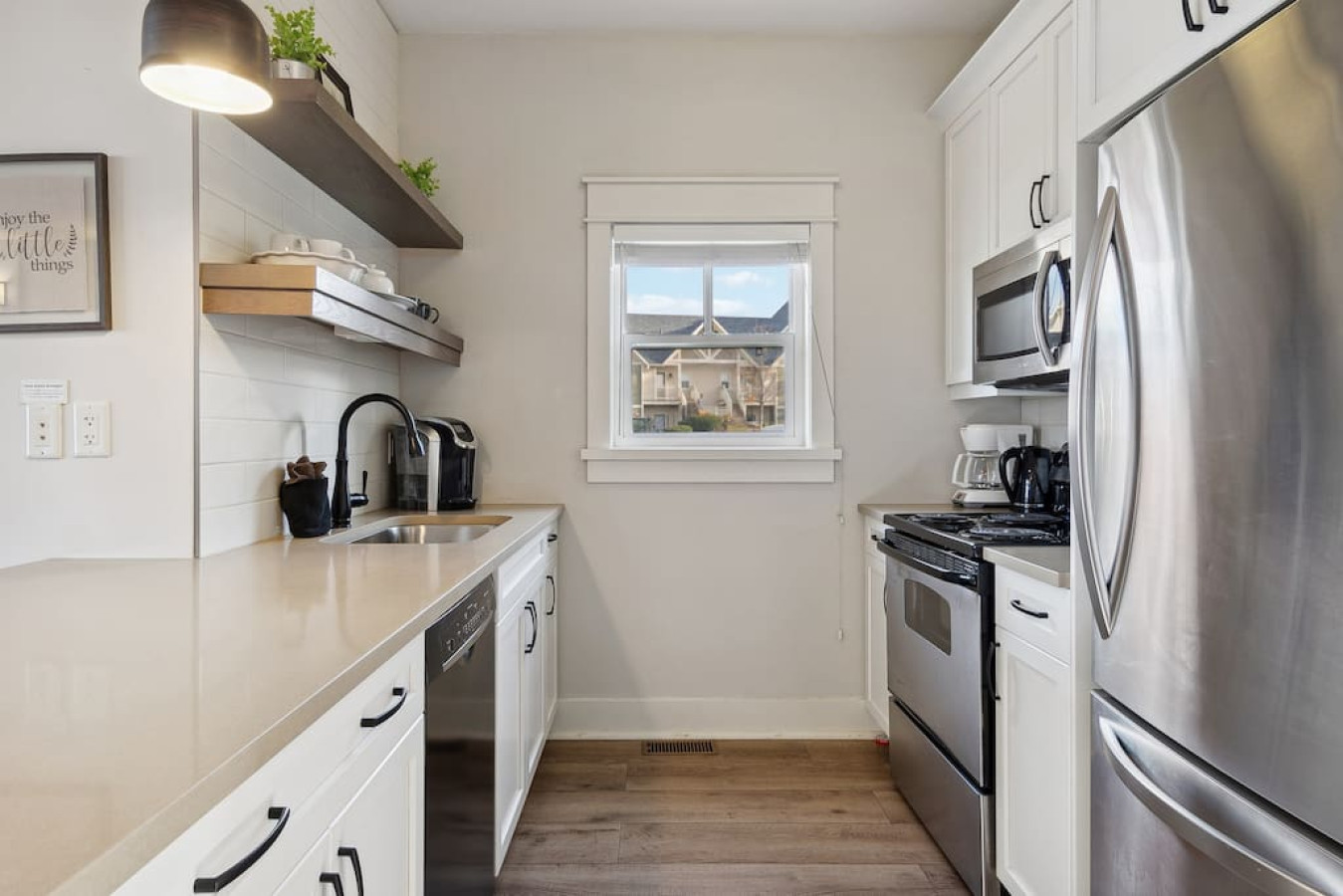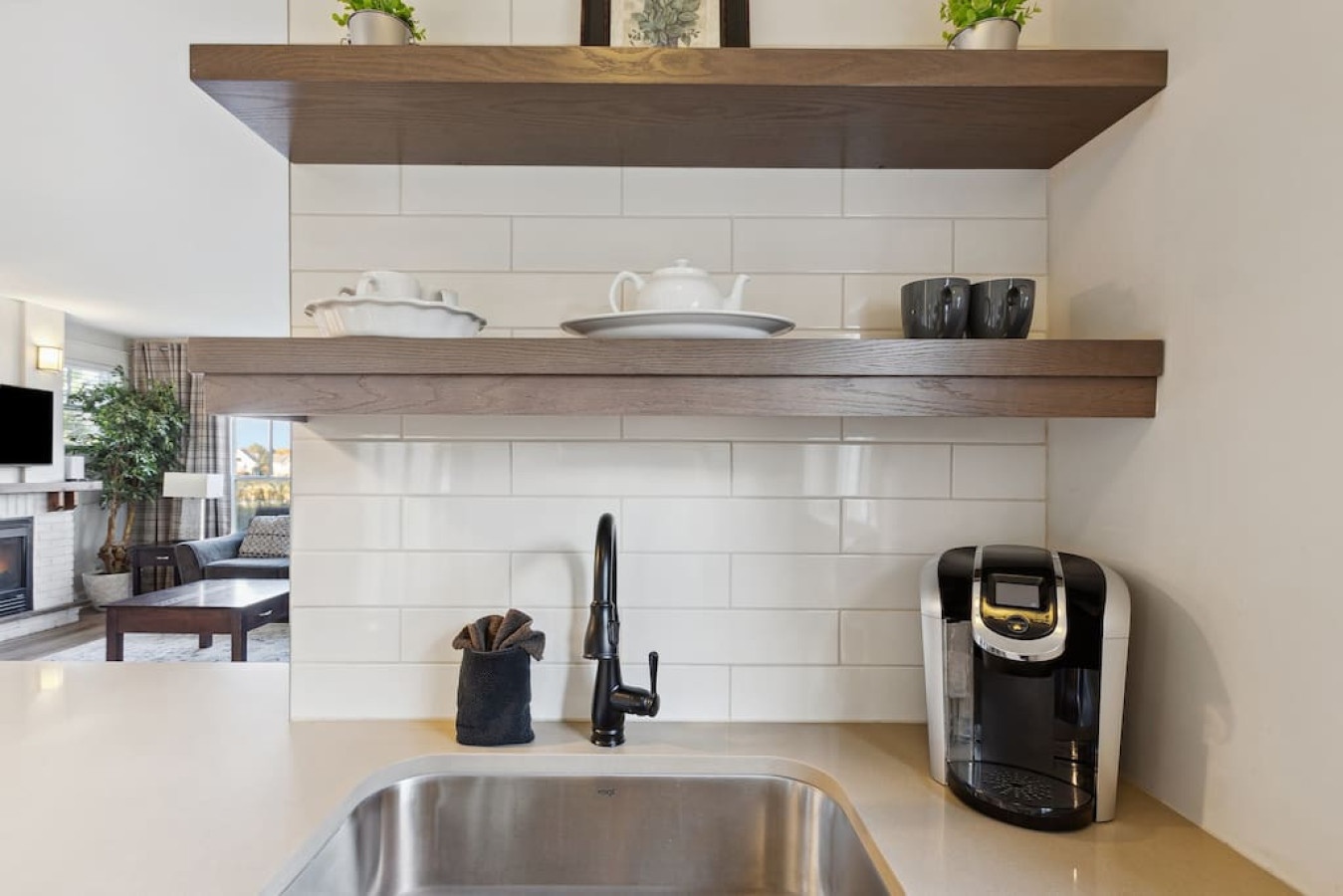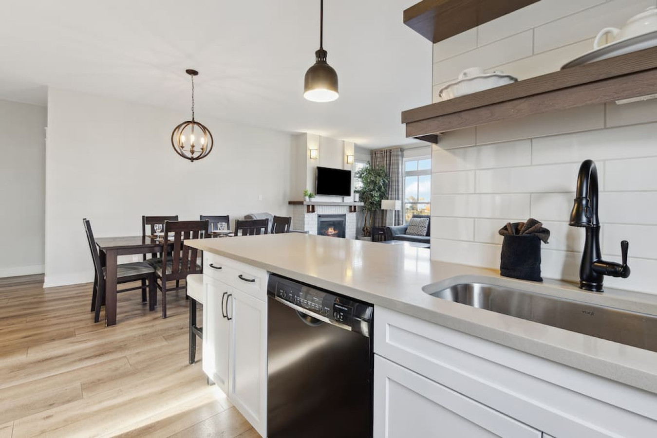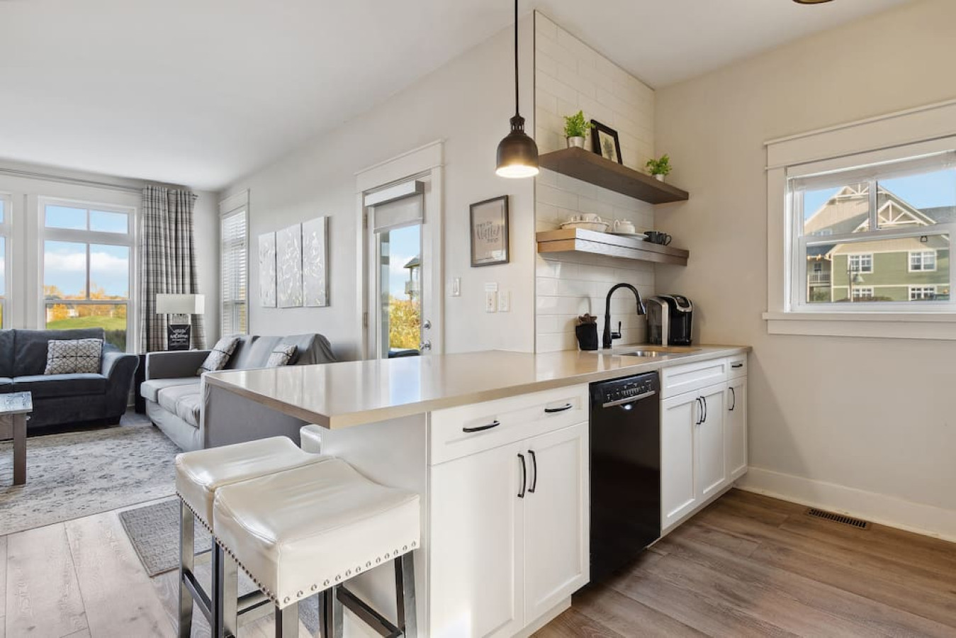A fully equipped kitchen is ready for your culinary adventures. No need to bring your own cutlery or bakeware! It's a great place for conversation and cooking in an open layout.