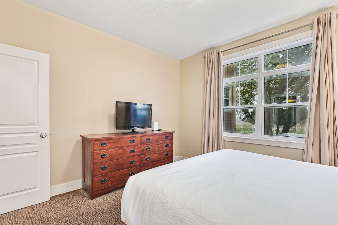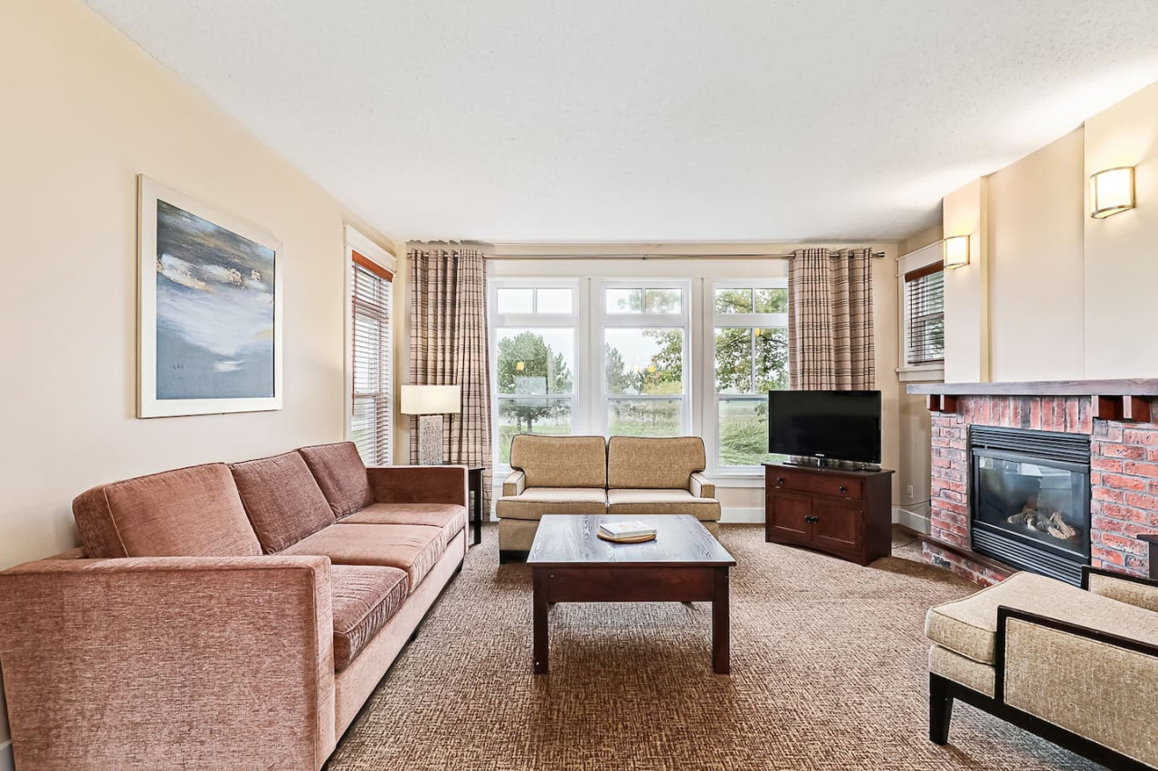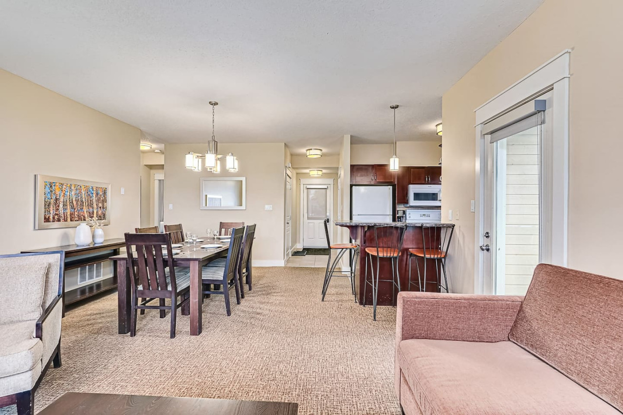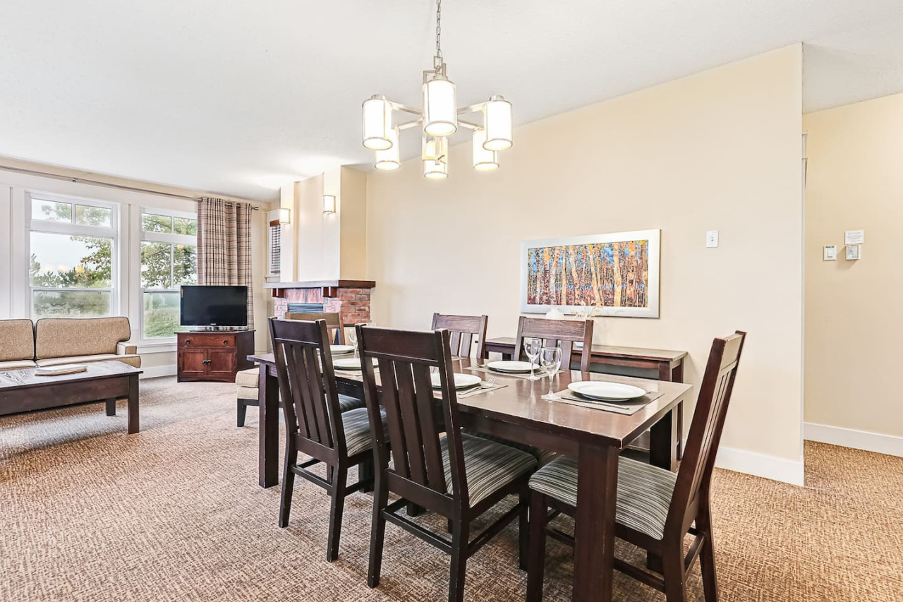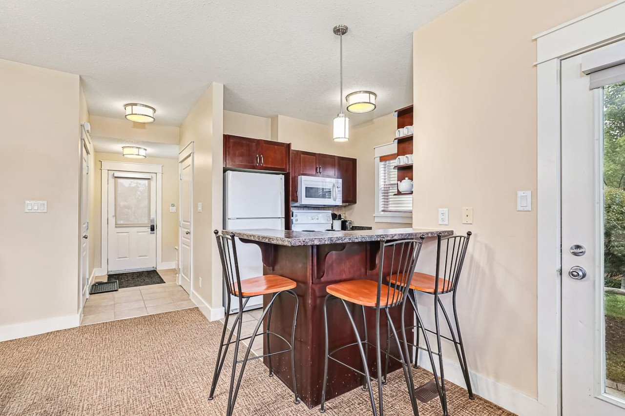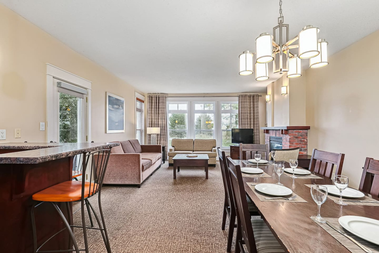 As you walk through the door, you’ll arrive in the open concept living area with comfortable seating facing the gas fireplace and cable TV. The large windows provide bright natural light and views of the mountain and the Monterra Golf Course. Sliding glass doors provide easy access to the private patio, complete with a BBQ and outdoor furniture for warmer days.