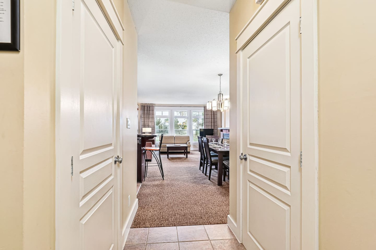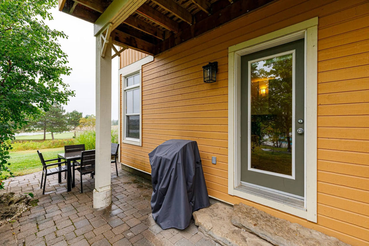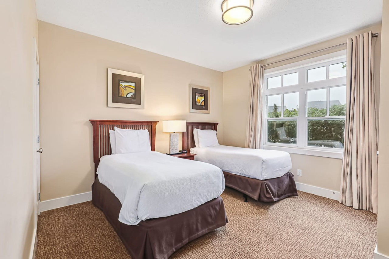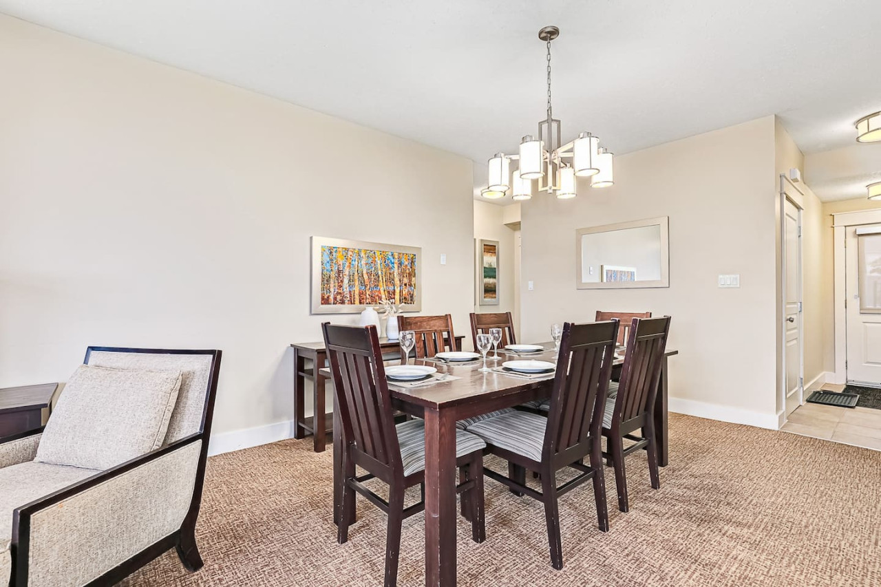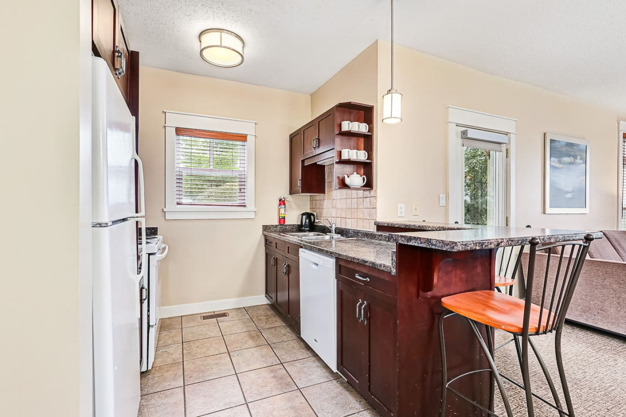 As you walk through the door, you’ll arrive in the open concept living area with comfortable seating facing the gas fireplace and cable TV. The large windows provide bright natural light and views of the mountain and the Monterra Golf Course. Sliding glass doors provide easy access to the private patio, complete with a BBQ and outdoor furniture for warmer days.