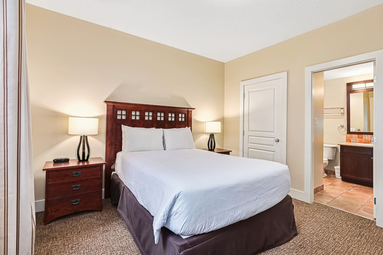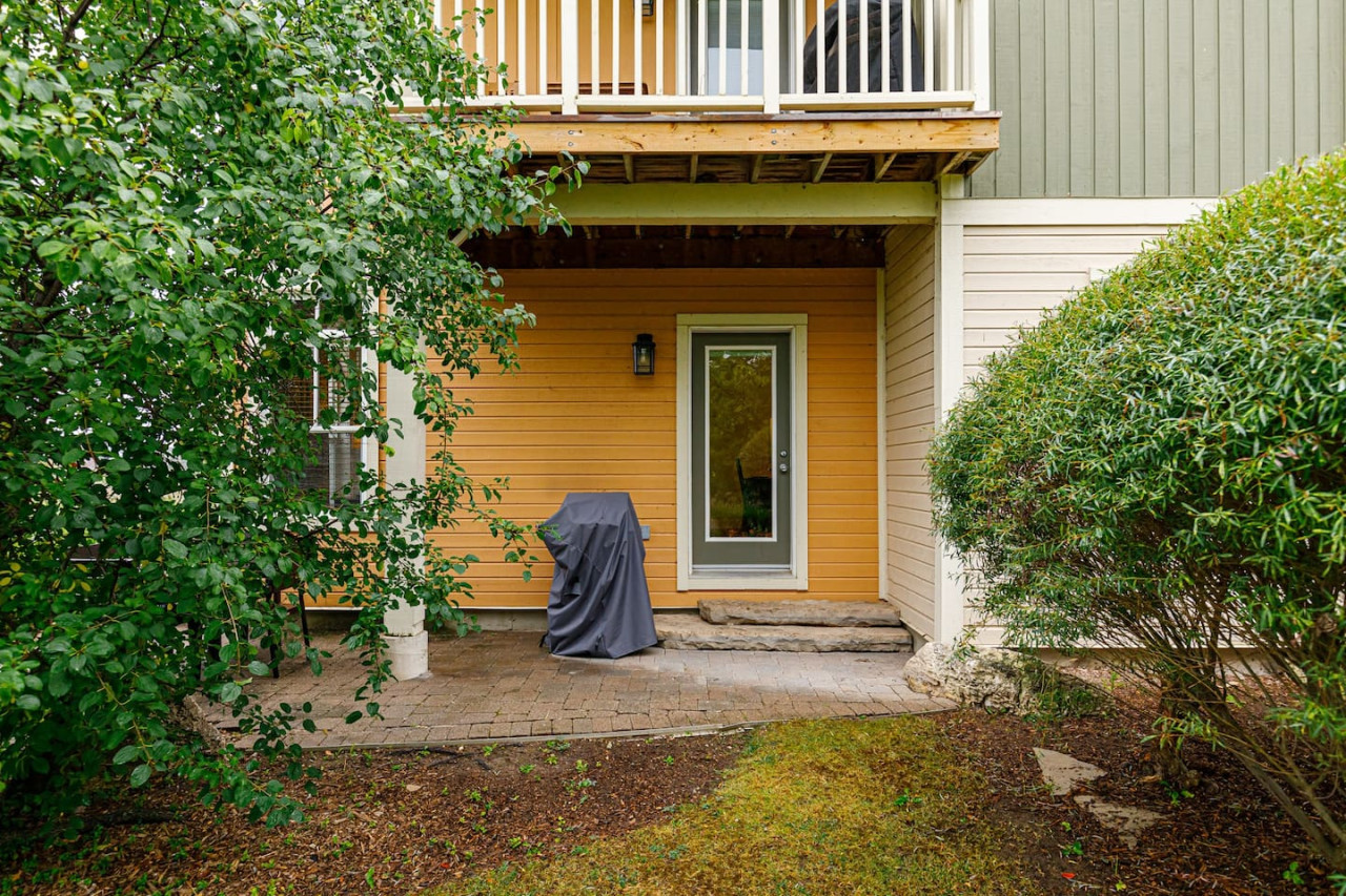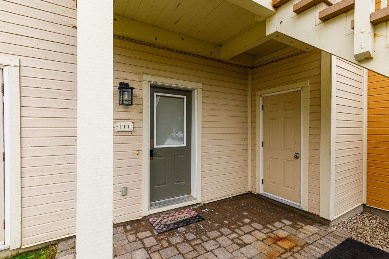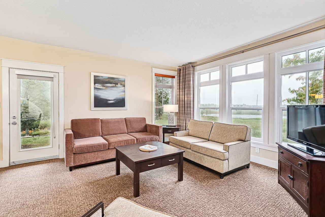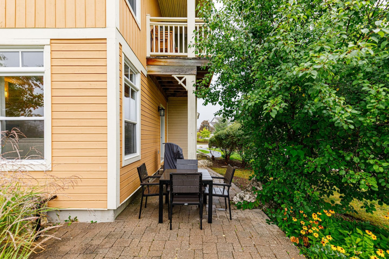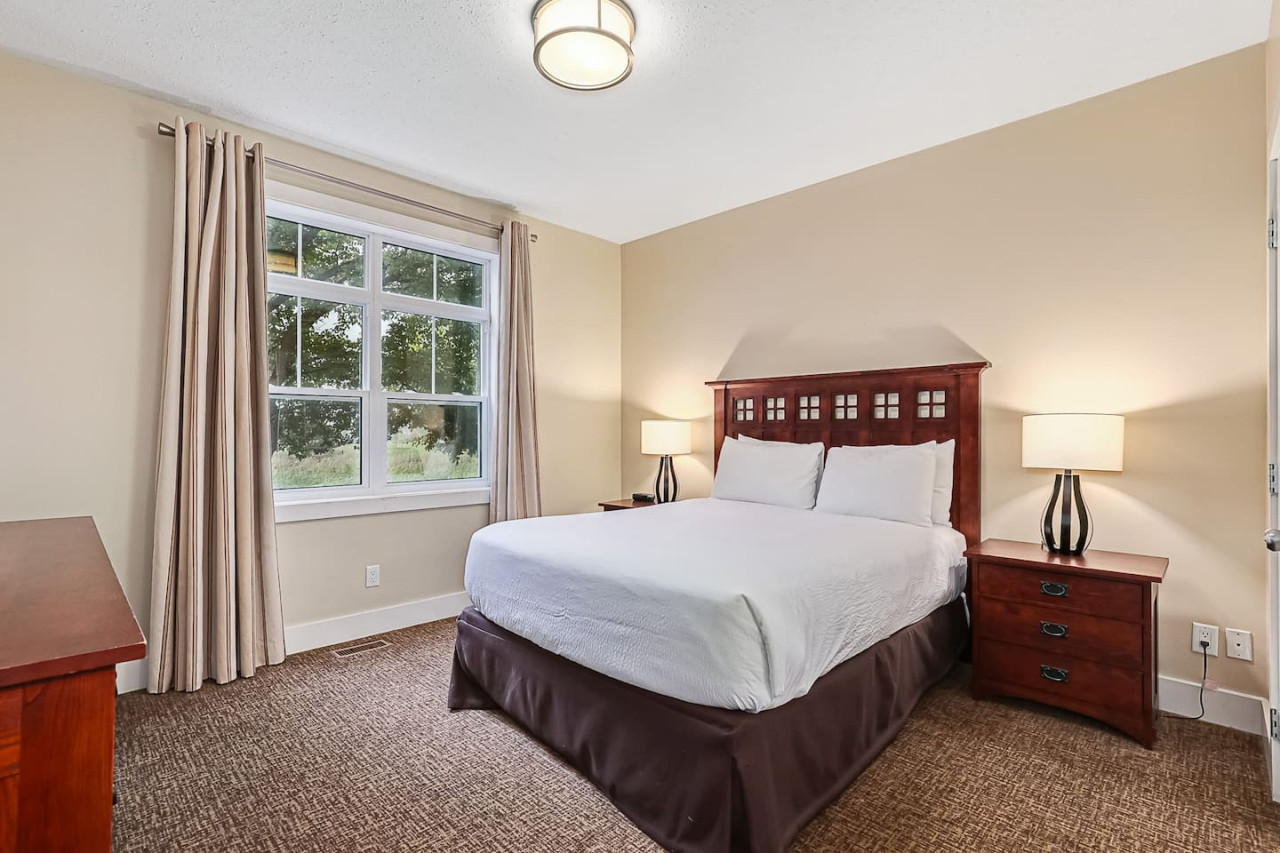 As you walk through the door, you’ll arrive in the open concept living area with comfortable seating facing the gas fireplace and cable TV. The large windows provide bright natural light and views of the mountain and the Monterra Golf Course. Sliding glass doors provide easy access to the private patio, complete with a BBQ and outdoor furniture for warmer days.