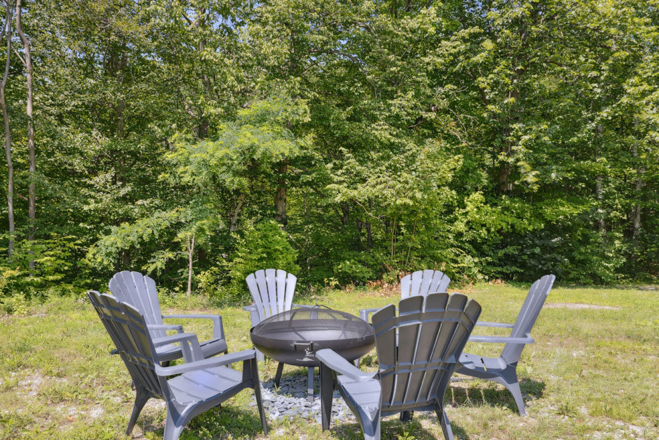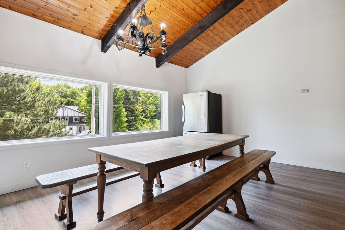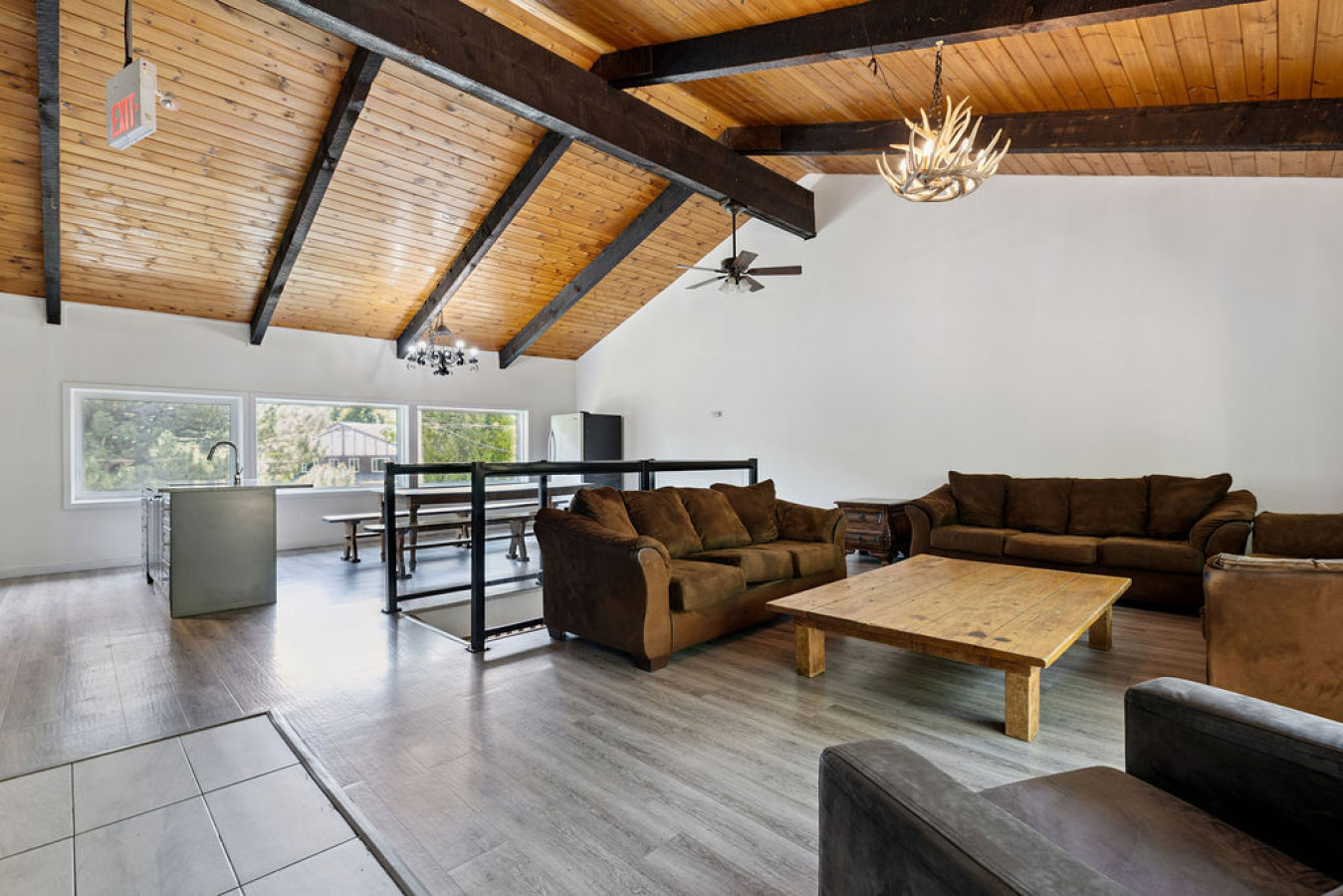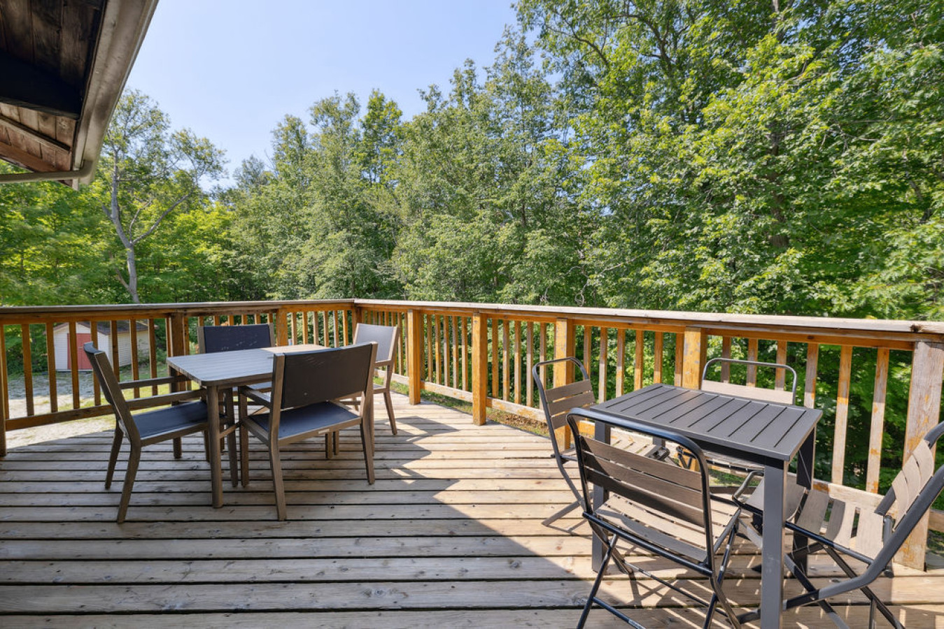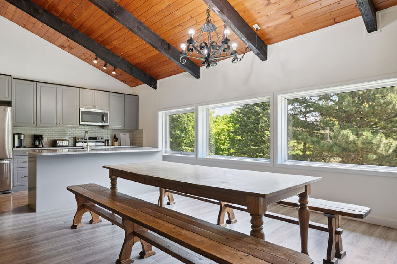 Gather with friends in the great room on the top floor. The big windows allow for lots of natural light, while the surrounding forest maintains privacy. Wood ceilings and beams along with exposed brick make this a rustic chalet-style atmosphere for apres ski. On the top floor there’s comfortable seating, a wood-burning fireplace, and Cable TV. *Bring your own firewood to enjoy the fireplace or outdoor fire pit.