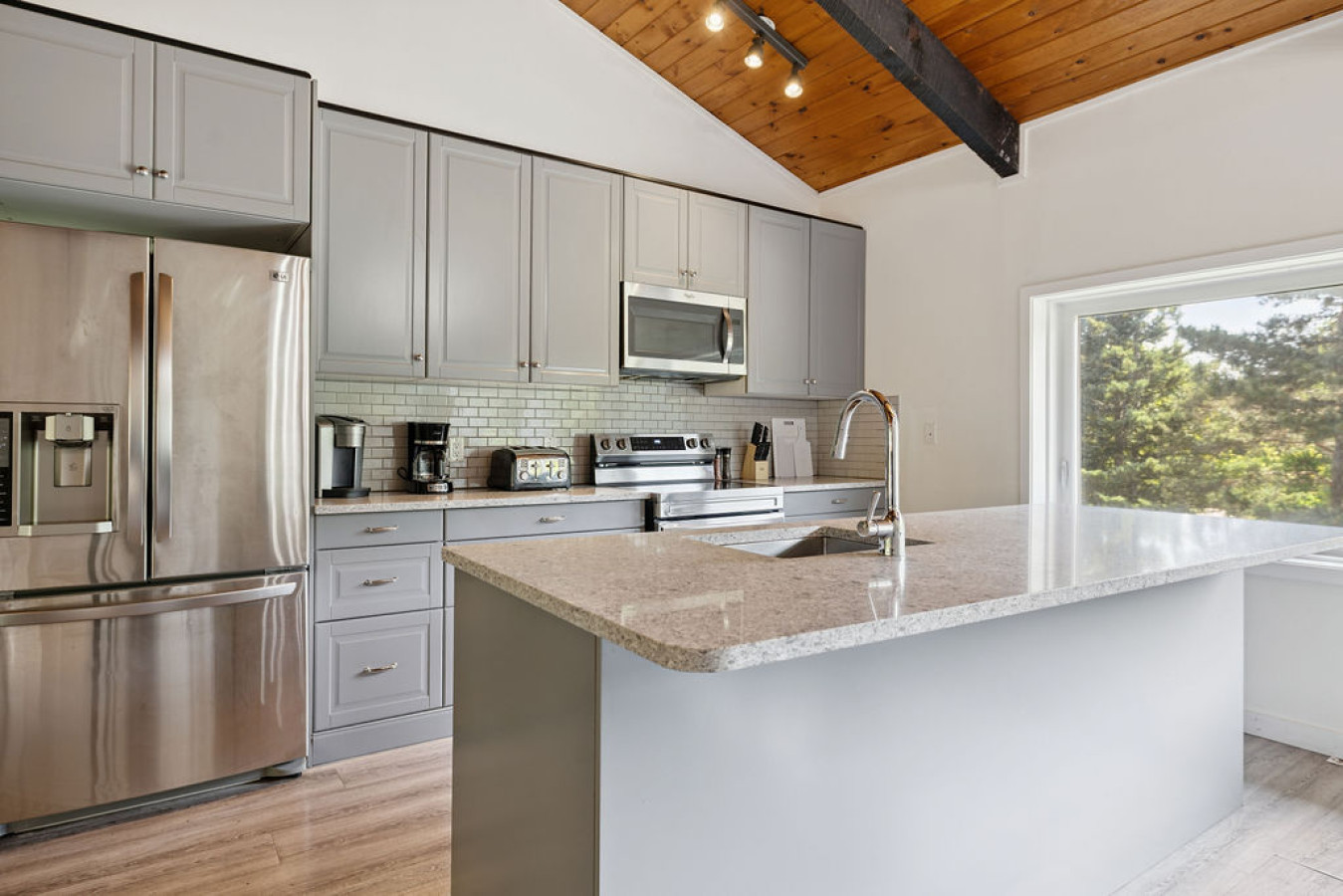 The kitchen is equipped with appliances and cooking basics, convenient for when you're not dining at one of the popular local restaurants. Enjoy your meals in the connected dining area or on the patio. This home includes basic cookware, bakeware, cutlery, utensils, and both a drip and Keurig coffee maker. Just bring your food, coffee, and spices! Garbage bags, paper towels, dish soap and towels, etc will be supplied. The outdoor deck includes seating and a propane BBQ.