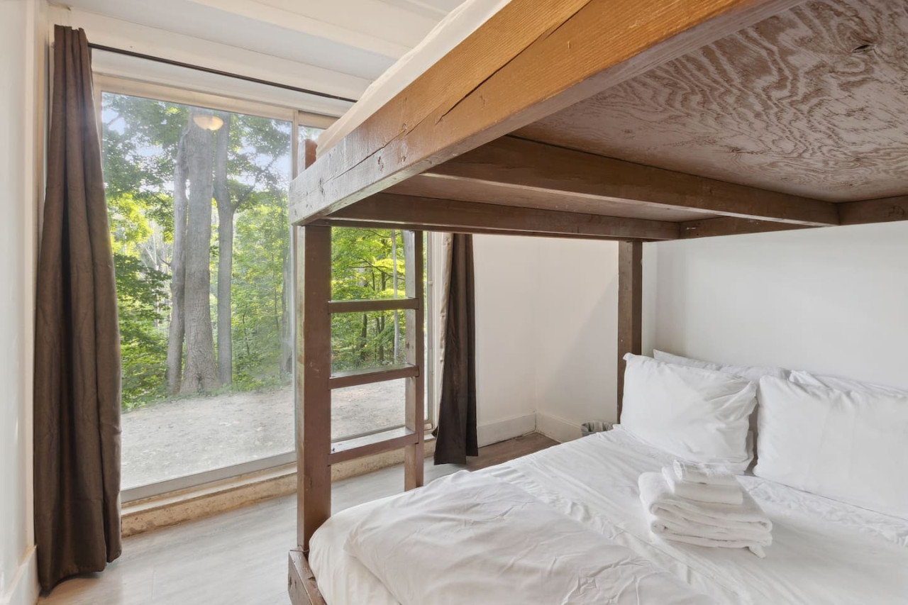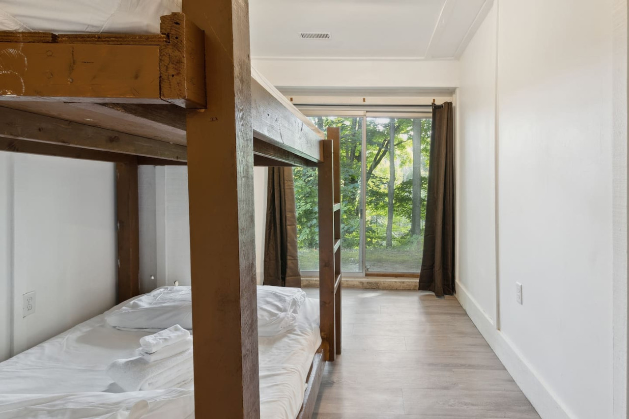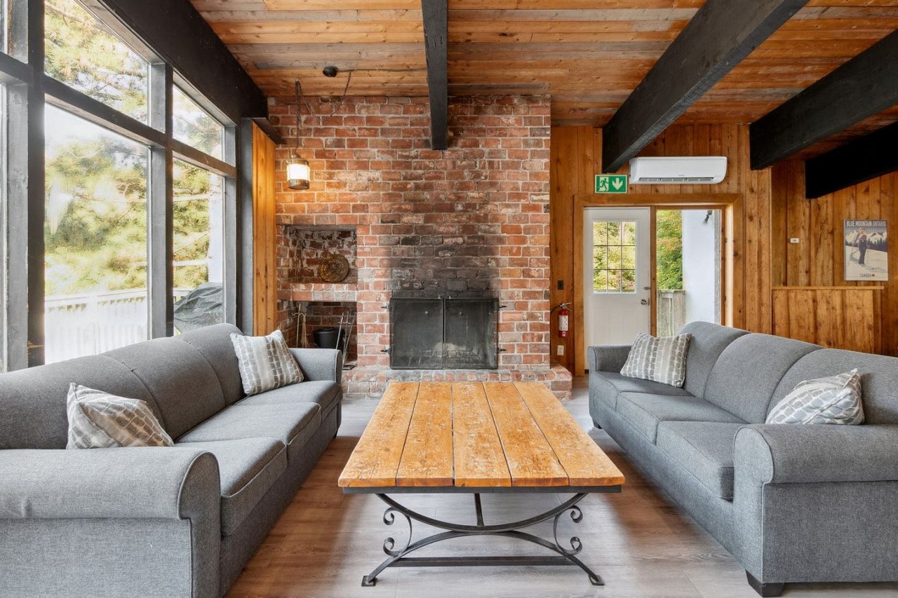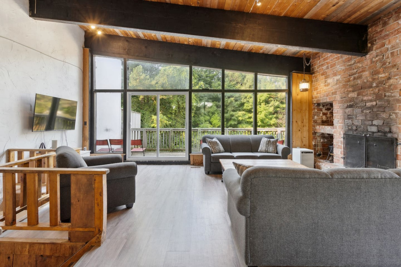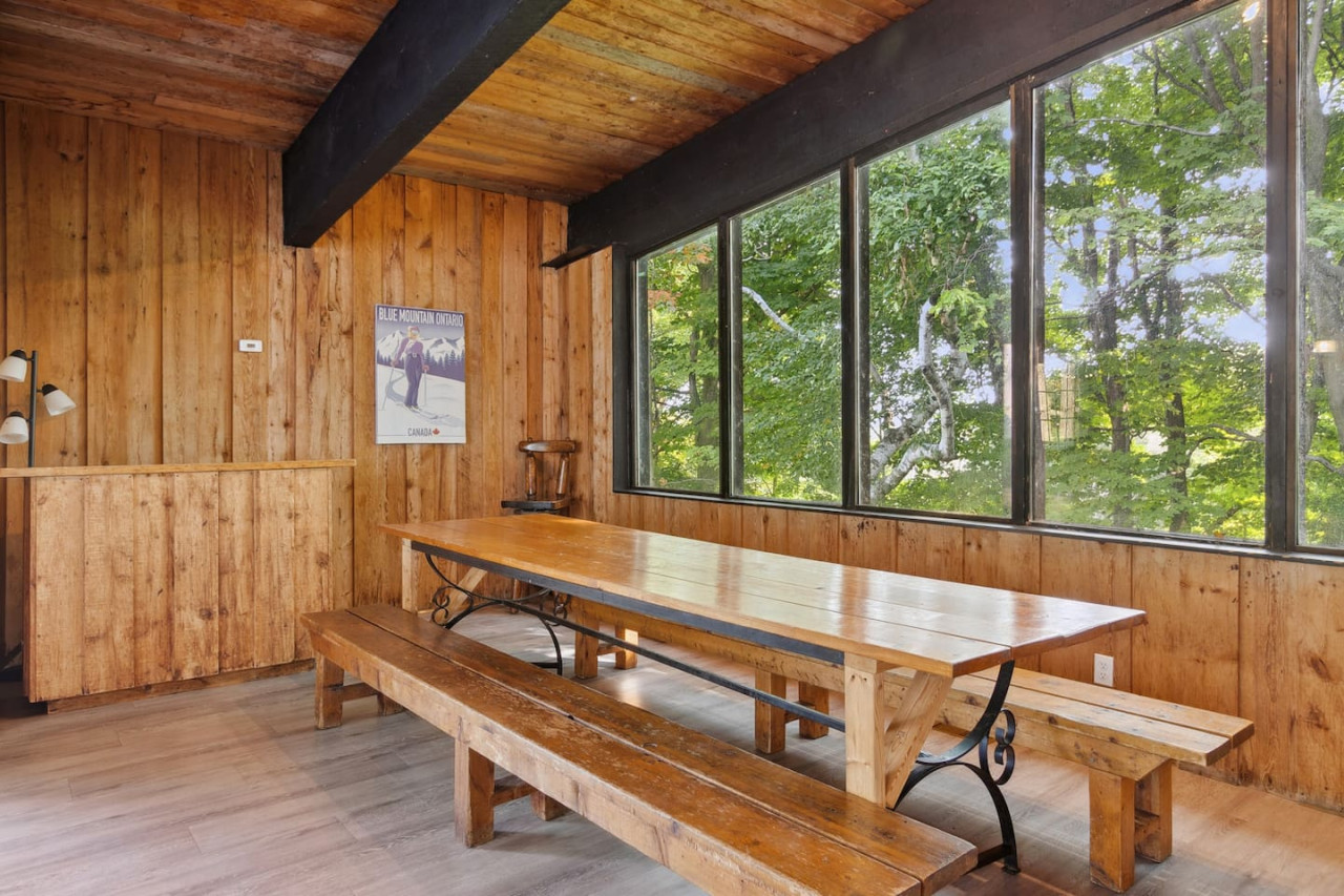 Gather with friends in the great room on the top floor. The big windows allow for lots of natural light, while the surrounding forest maintains privacy. Wood ceilings and beams along with exposed brick make this a rustic chalet-style atmosphere for après ski. On the top floor there’s comfortable seating and a Smart TV along with a wood burning fireplace. Please bring your own firewood if you plan to use the fireplace!
