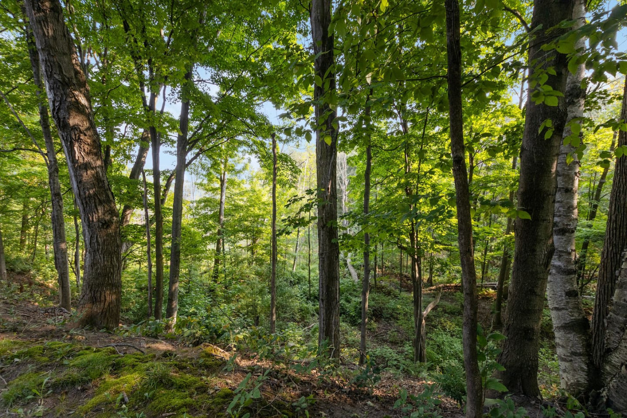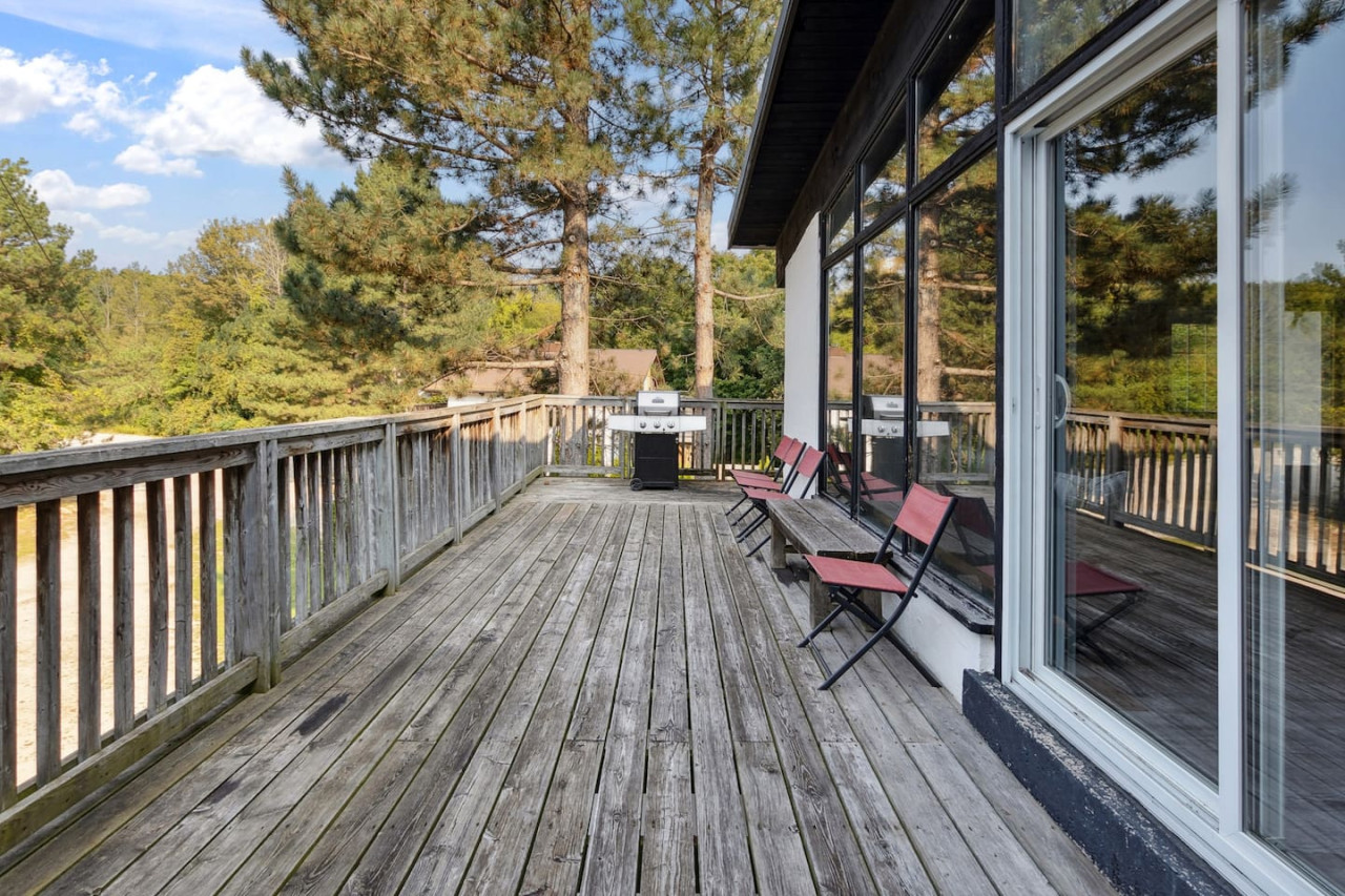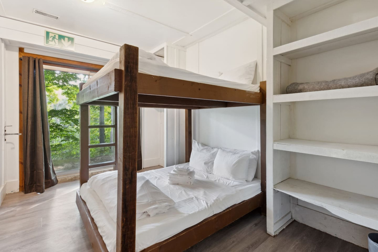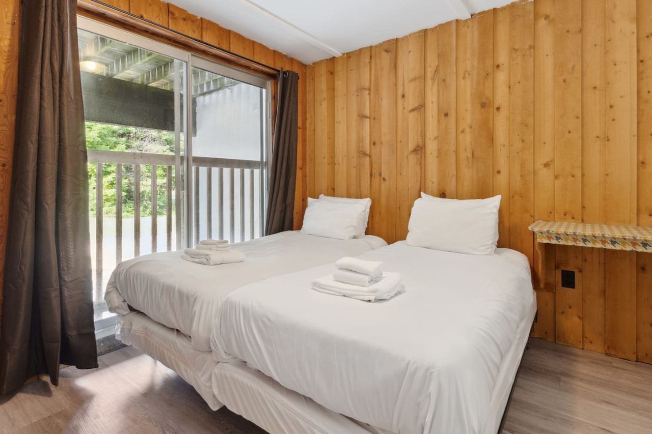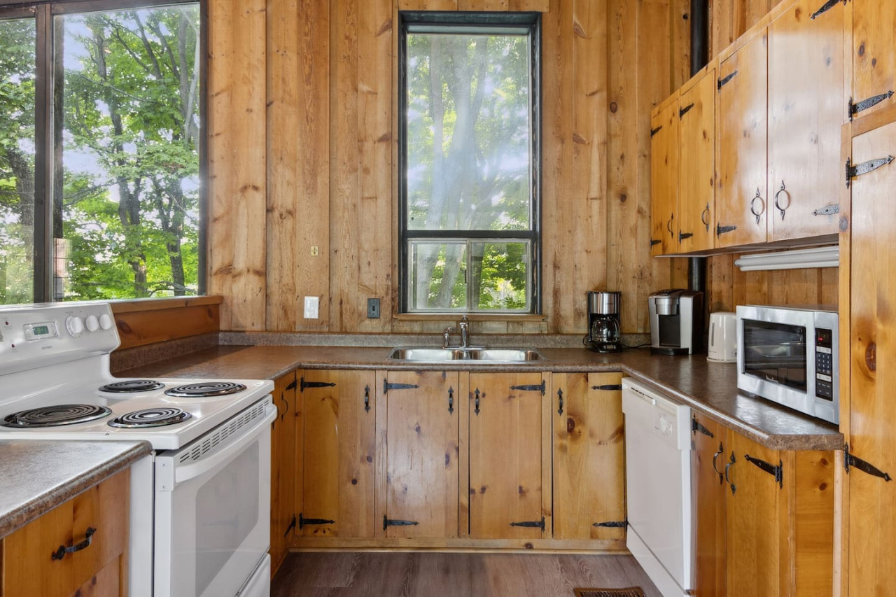Gather with friends in the great room on the top floor. The big windows allow for lots of natural light, while the surrounding forest maintains privacy. Wood ceilings and beams along with exposed brick make this a rustic chalet-style atmosphere for après ski. On the top floor there’s comfortable seating and a Smart TV along with a wood burning fireplace. Please bring your own firewood if you plan to use the fireplace!