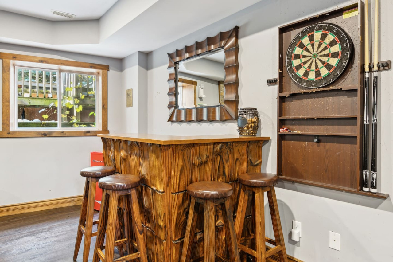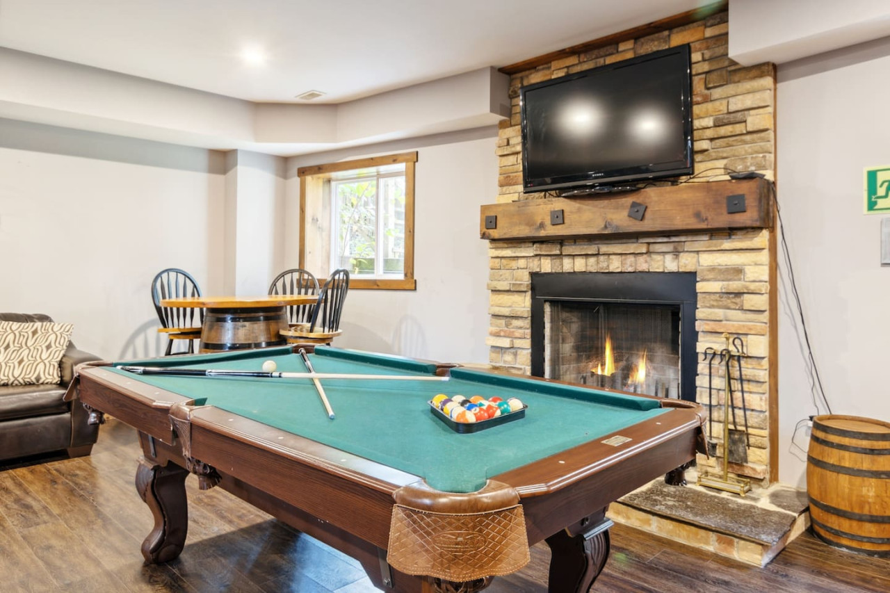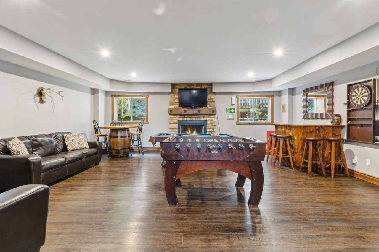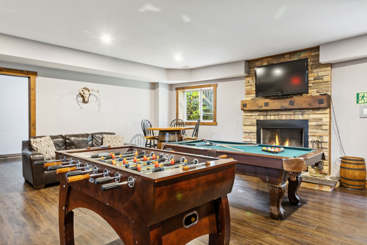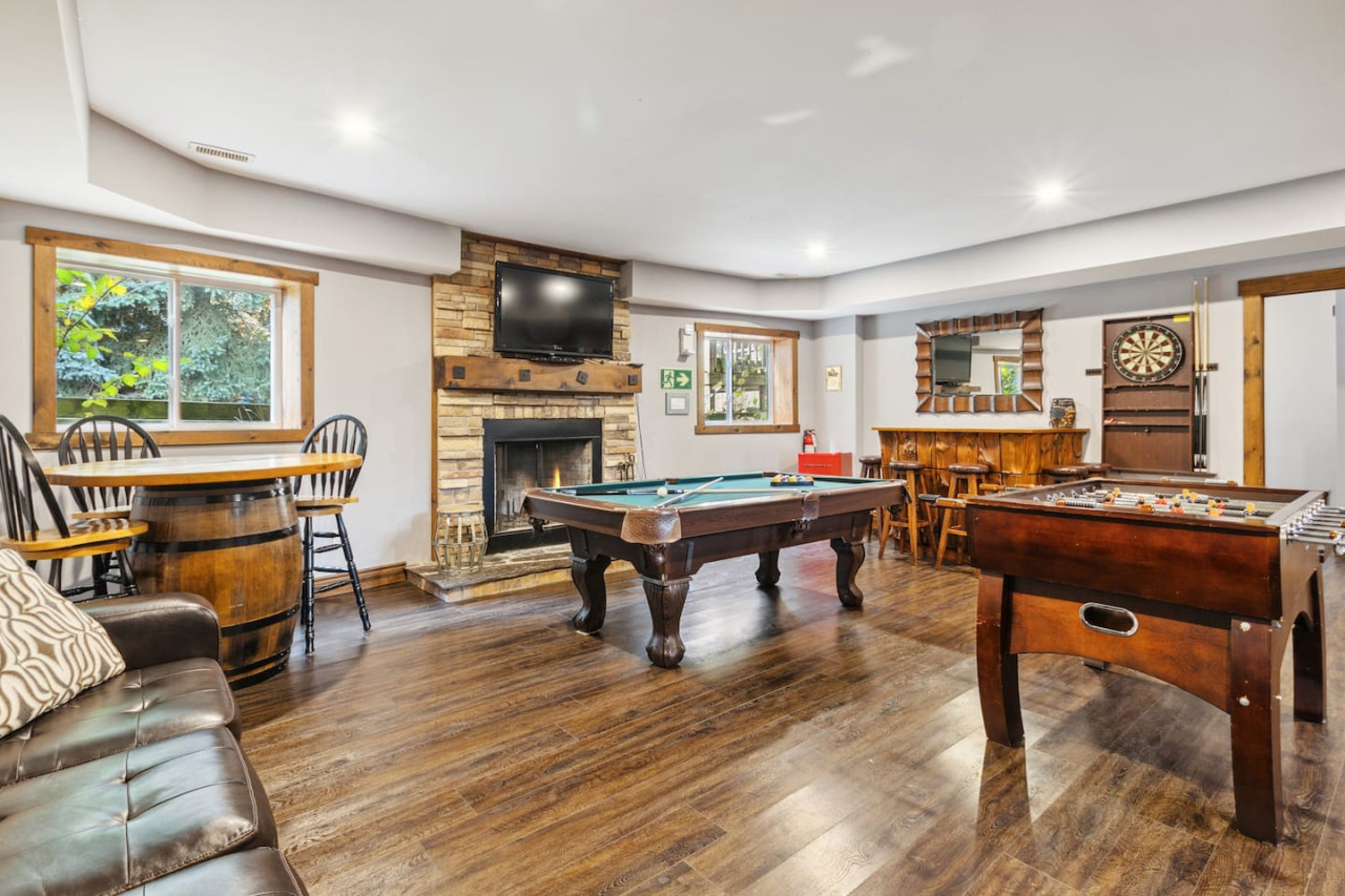 Unwind among the cozy decor, including a gorgeous antler chandelier overlooking the main living area, furnished with a large sectional couch facing 1 of the 2 wood burning fireplaces (bring your own firewood) and a Smart TV. Upstairs, in the loft, you’ll find 2 additional chaise lounges. In the basement living area, you can enjoy the games area with the pool table, foosball, and darts surrounding the bar and second wood burning fireplace.