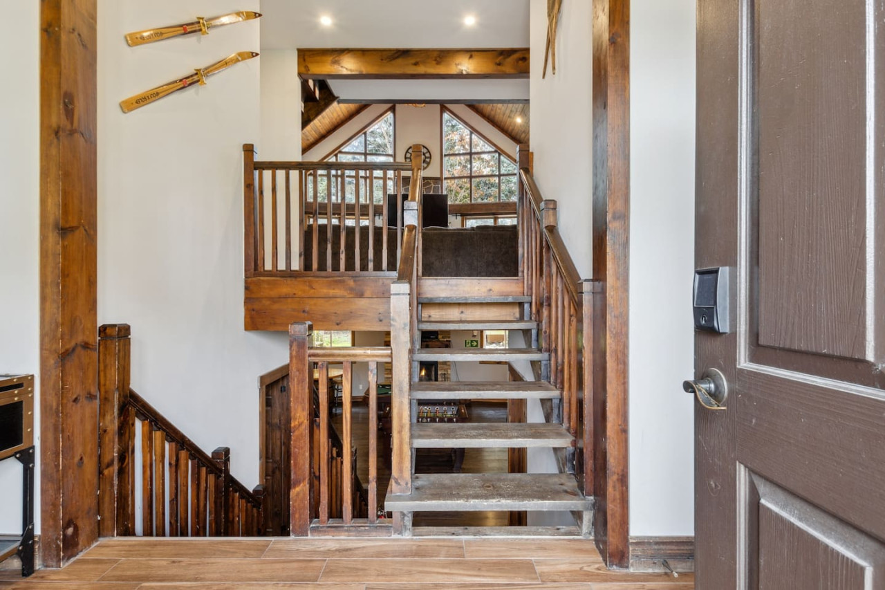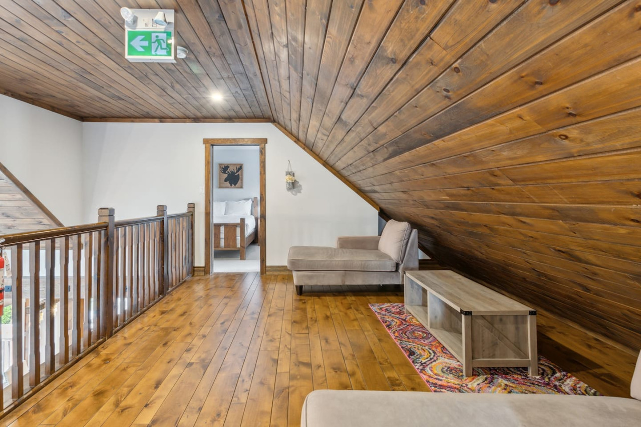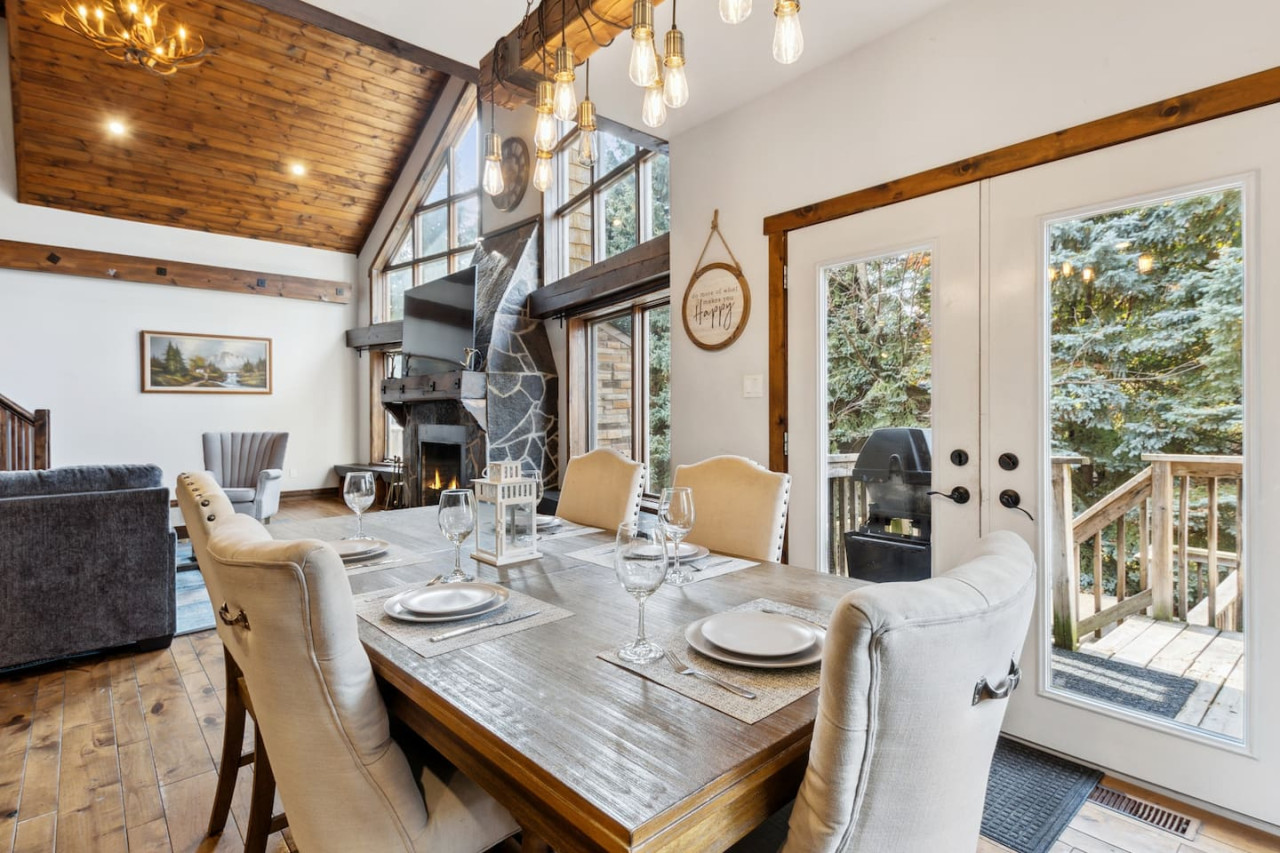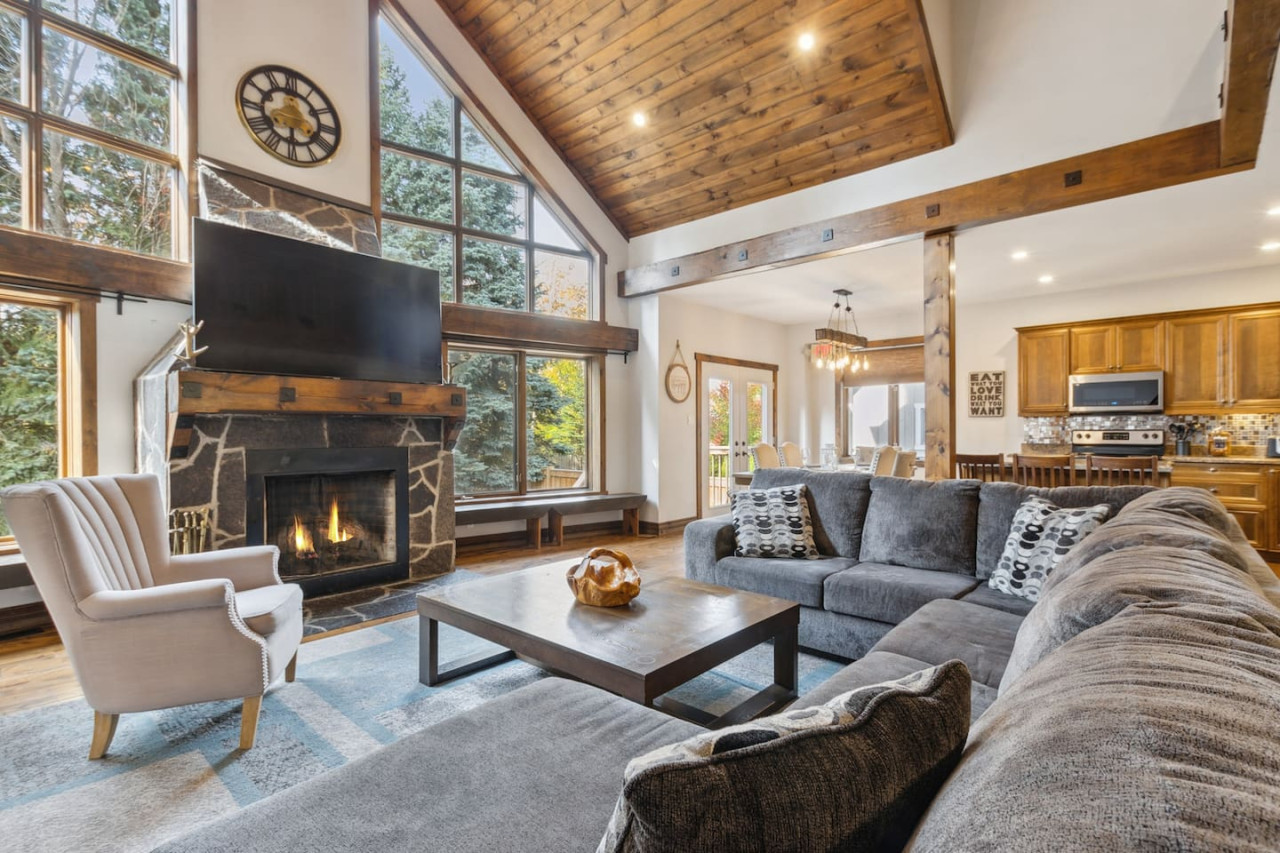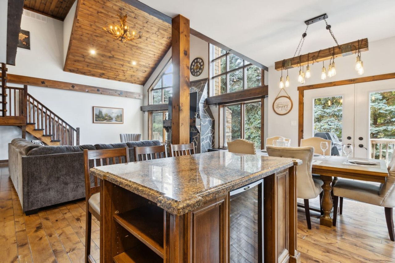 Unwind among the cozy decor, including a gorgeous antler chandelier overlooking the main living area, furnished with a large sectional couch facing 1 of the 2 wood burning fireplaces (bring your own firewood) and a Smart TV. Upstairs, in the loft, you’ll find 2 additional chaise lounges. In the basement living area, you can enjoy the games area with the pool table, foosball, and darts surrounding the bar and second wood burning fireplace.