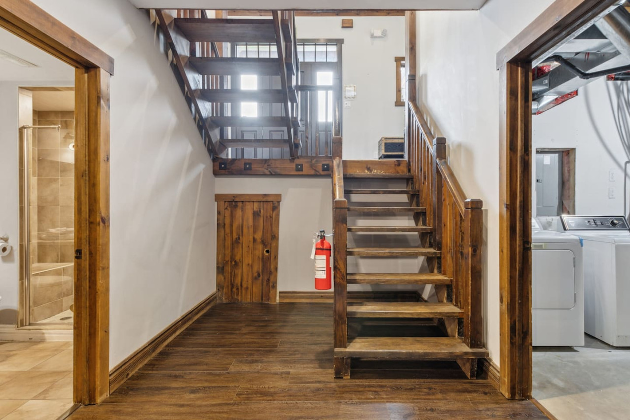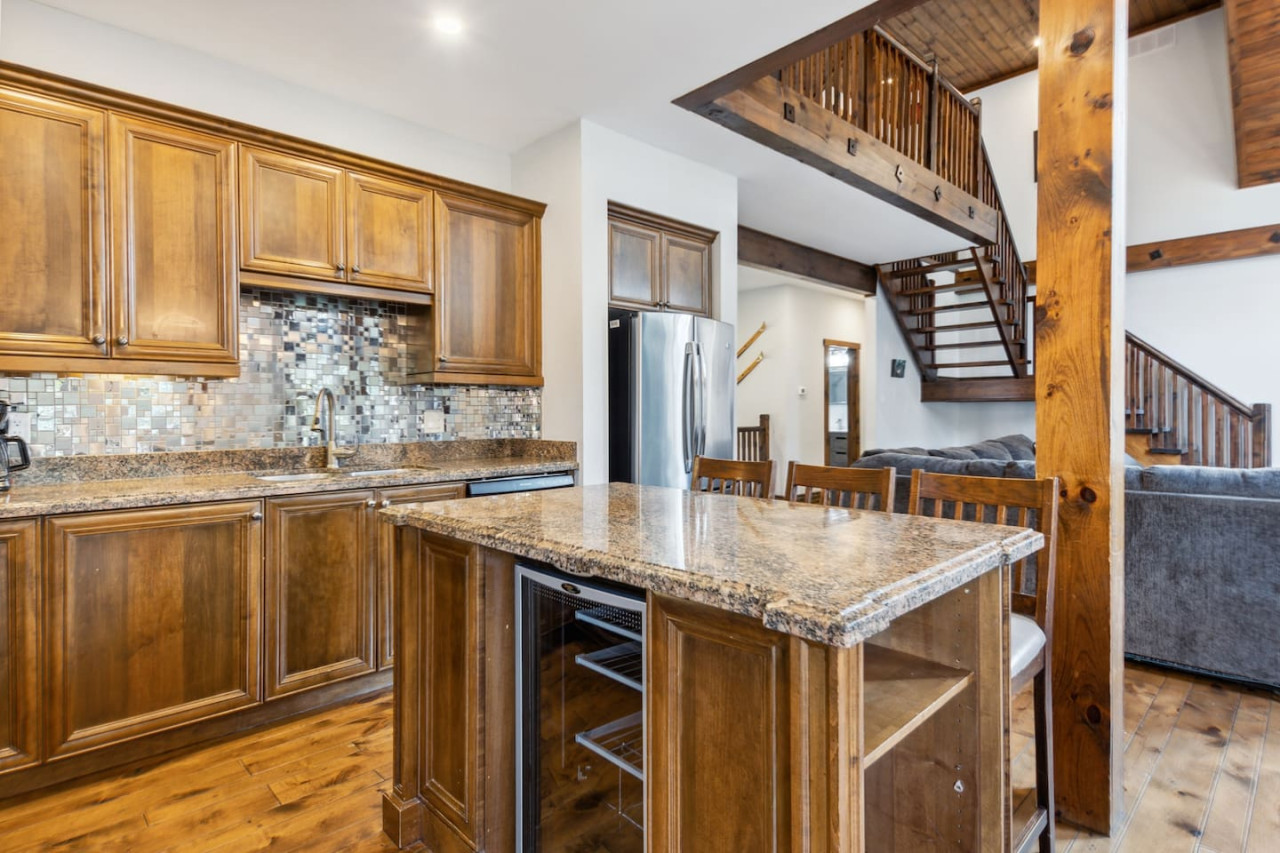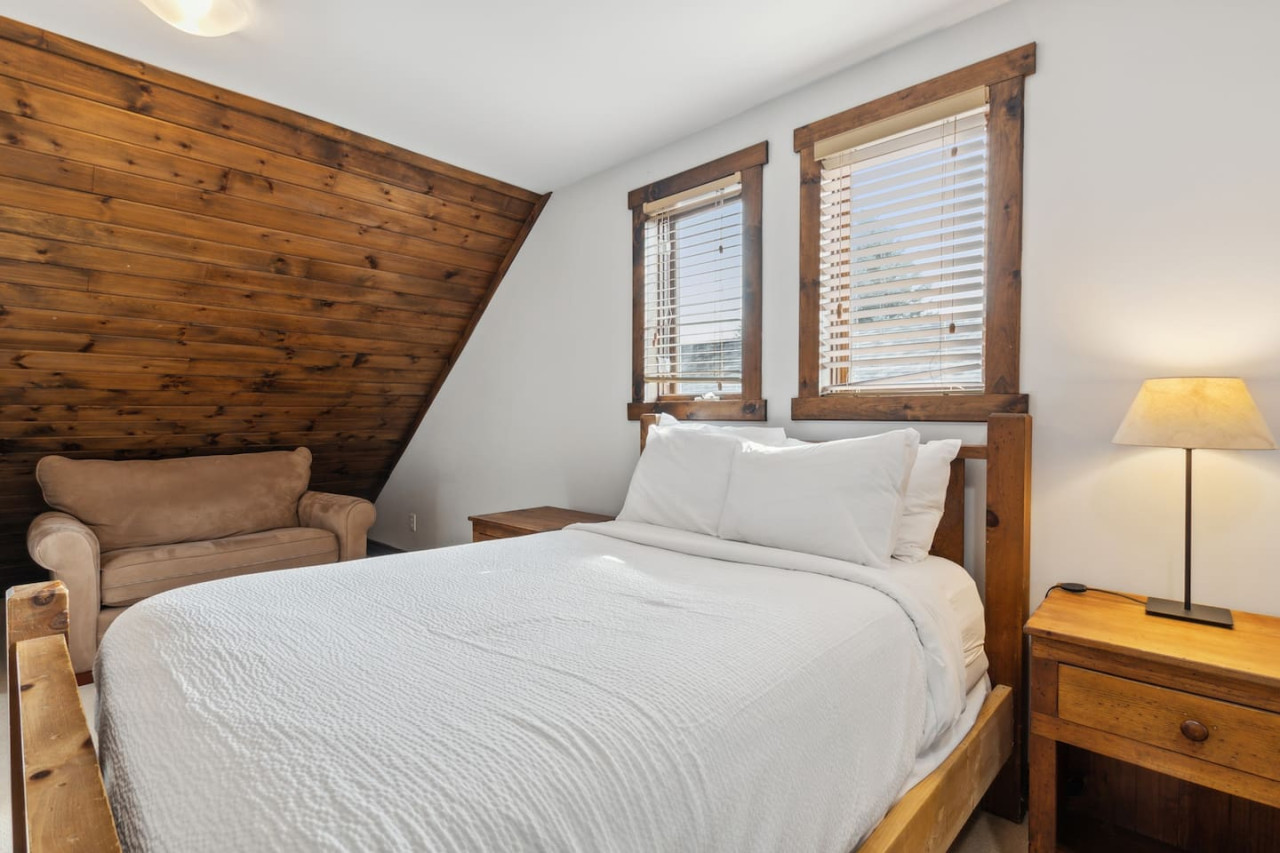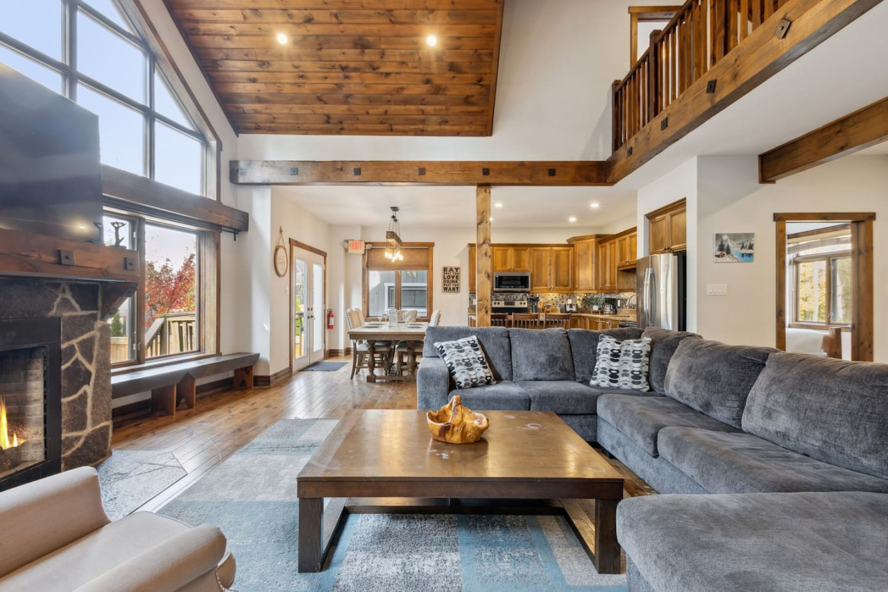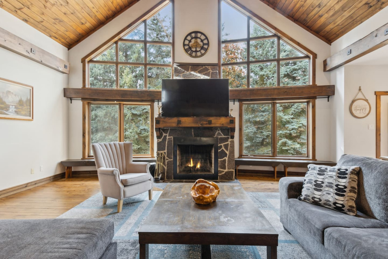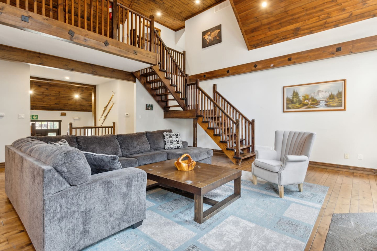 Unwind among the cozy decor, including a gorgeous antler chandelier overlooking the main living area, furnished with a large sectional couch facing 1 of the 2 wood burning fireplaces (bring your own firewood) and a Smart TV. Upstairs, in the loft, you’ll find 2 additional chaise lounges. In the basement living area, you can enjoy the games area with the pool table, foosball, and darts surrounding the bar and second wood burning fireplace.