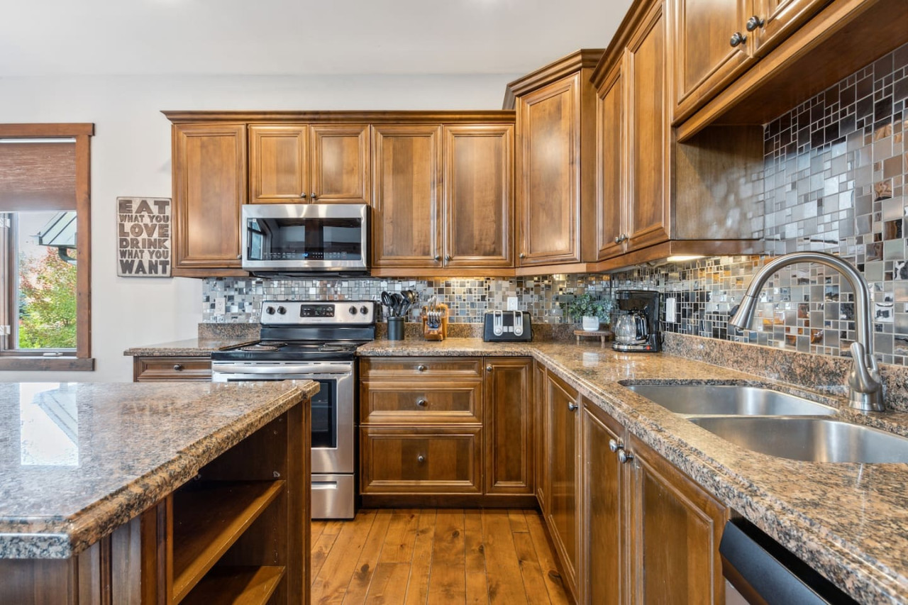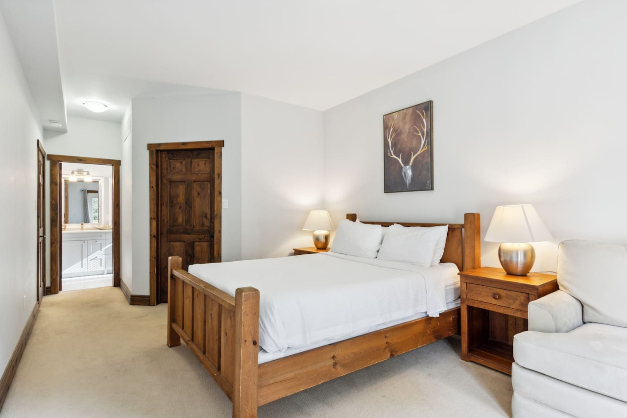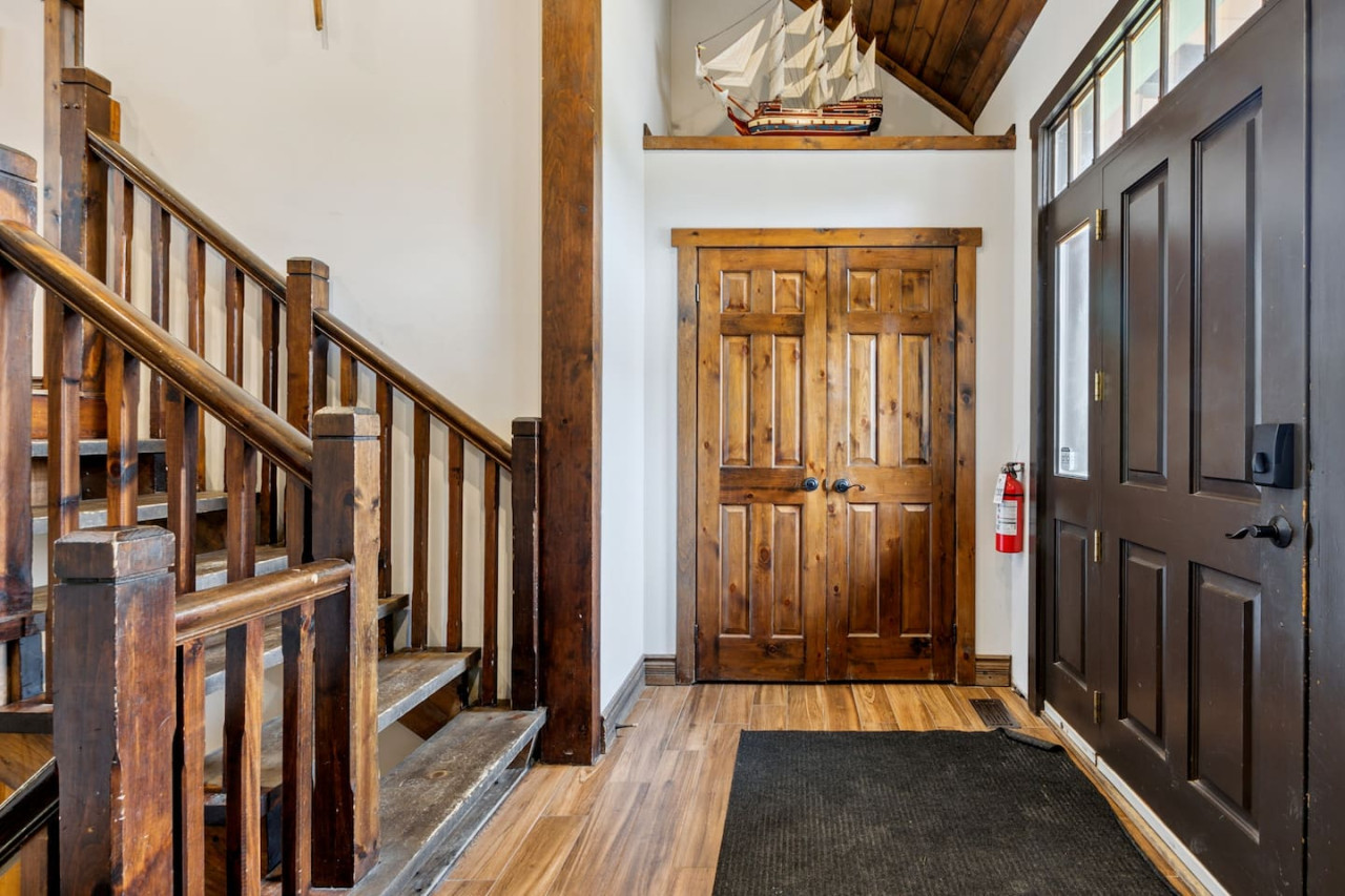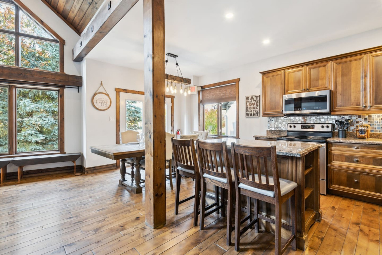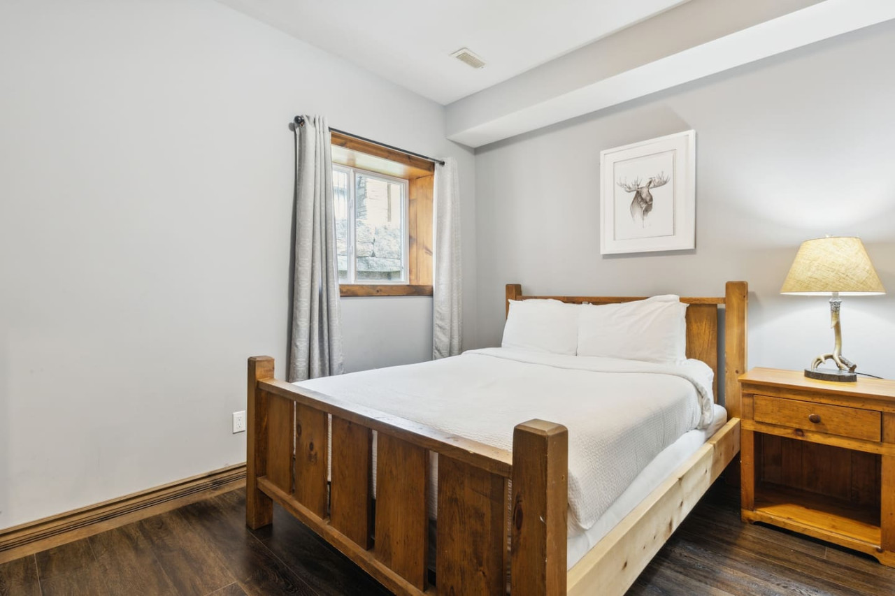 Unwind among the cozy decor, including a gorgeous antler chandelier overlooking the main living area, furnished with a large sectional couch facing 1 of the 2 wood burning fireplaces (bring your own firewood) and a Smart TV. Upstairs, in the loft, you’ll find 2 additional chaise lounges. In the basement living area, you can enjoy the games area with the pool table, foosball, and darts surrounding the bar and second wood burning fireplace.