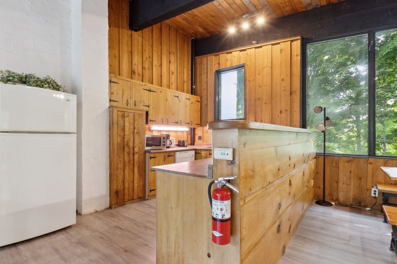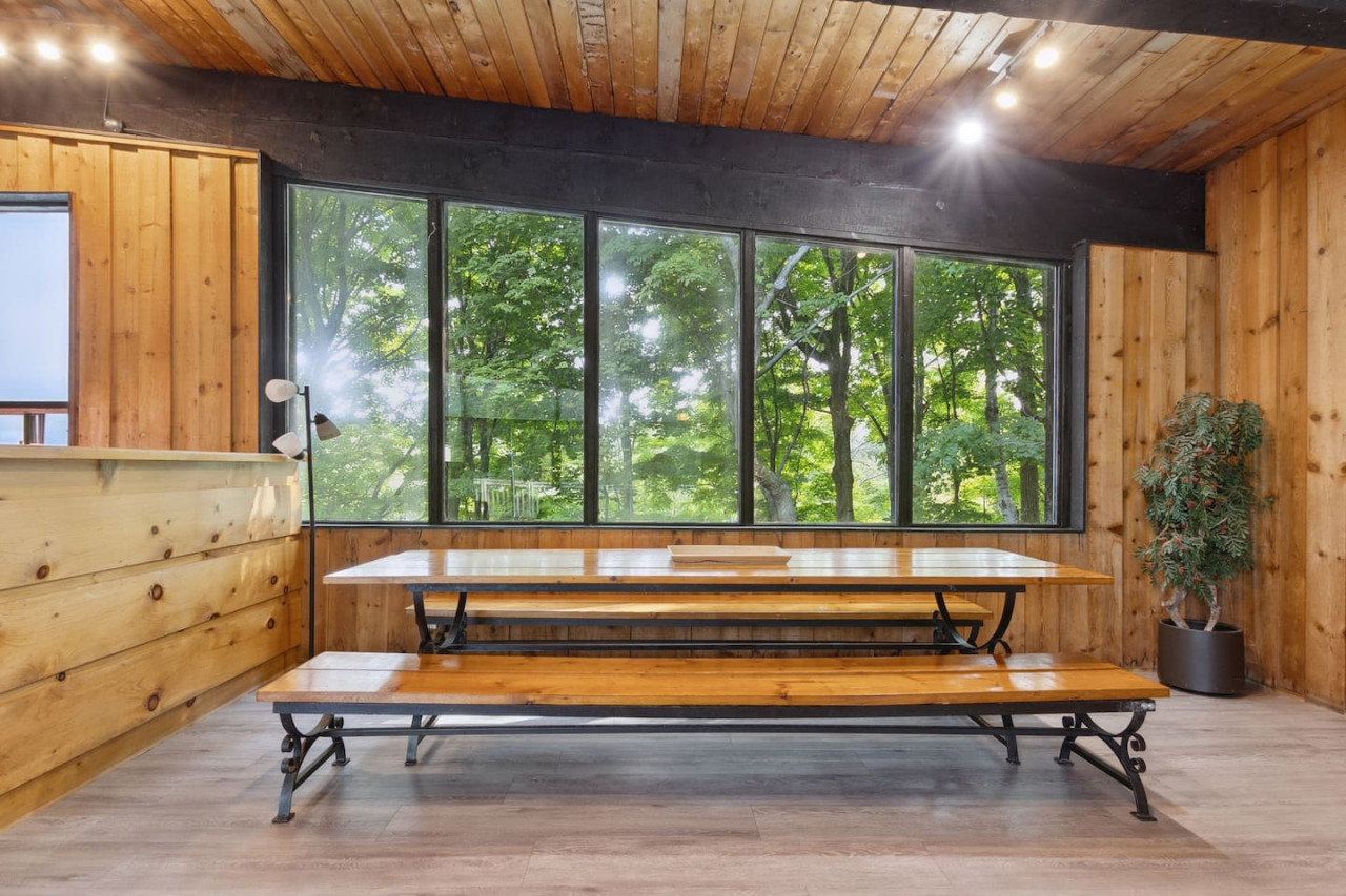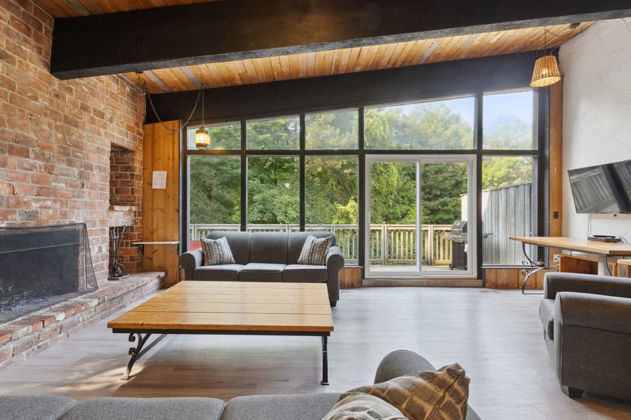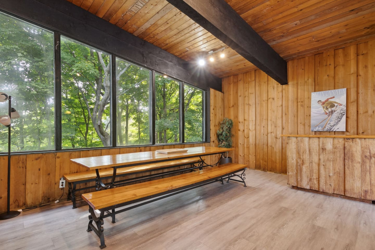 Gather with friends in the great room on the top floor. The big windows allow for lots of natural light, while the surrounding forest maintains privacy. Wood ceilings and beams along with exposed brick make this a rustic chalet-style atmosphere for après ski. On the top floor there’s comfortable seating and a Smart TV along with a wood burning fireplace. Please bring your own firewood if you plan to use the fireplace!