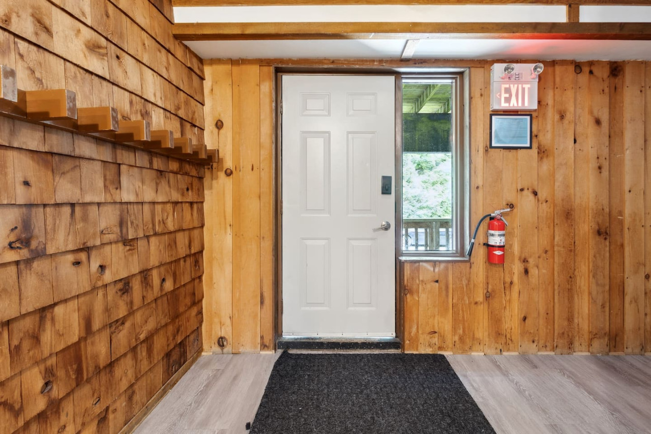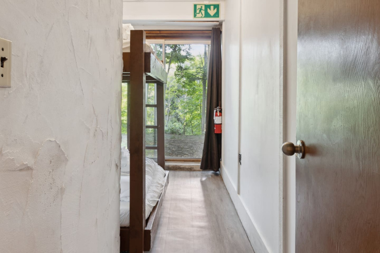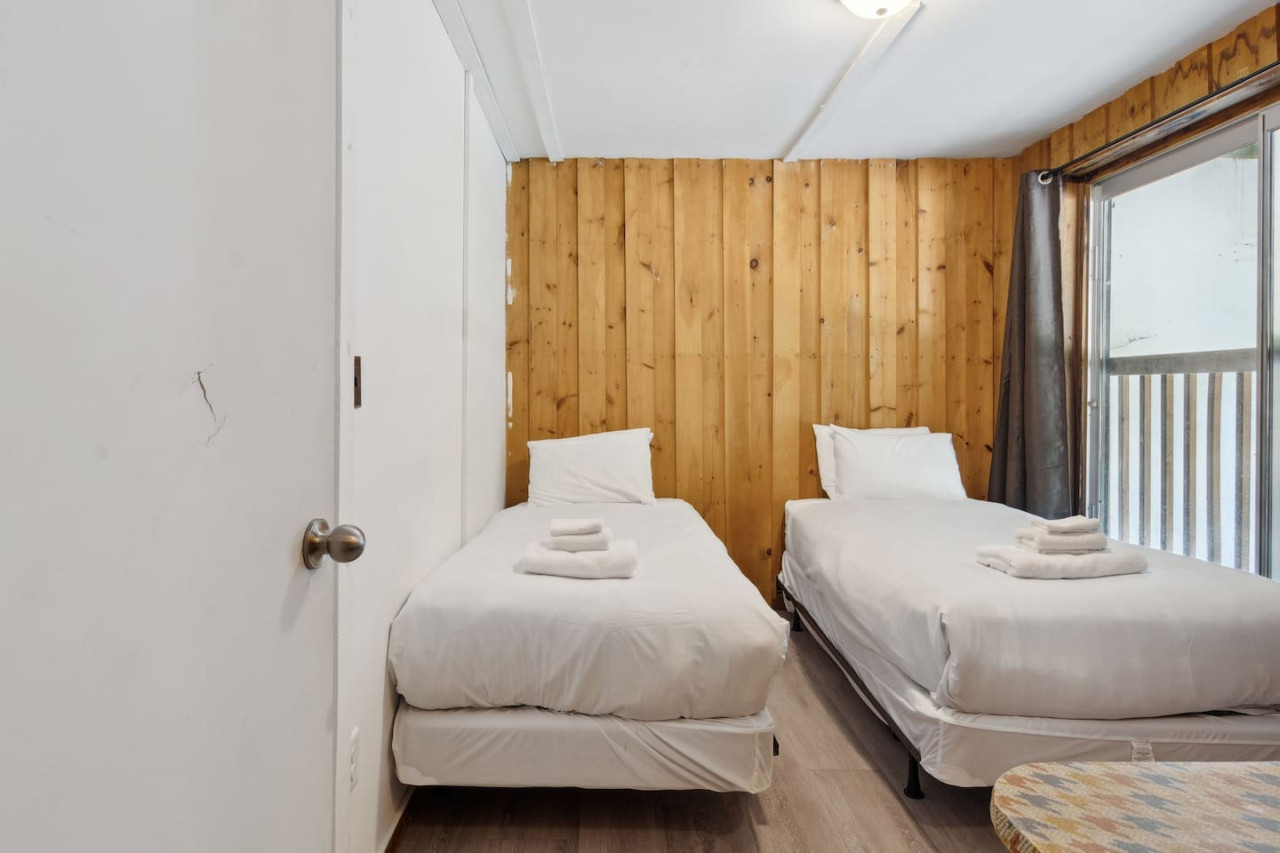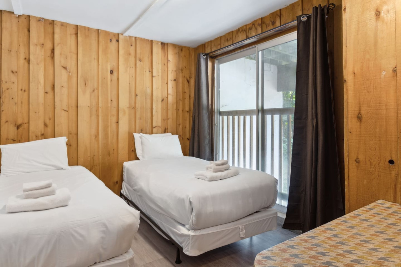Gather with friends in the great room on the top floor. The big windows allow for lots of natural light, while the surrounding forest maintains privacy. Wood ceilings and beams along with exposed brick make this a rustic chalet-style atmosphere for après ski. On the top floor there’s comfortable seating and a Smart TV along with a wood burning fireplace. Please bring your own firewood if you plan to use the fireplace!
