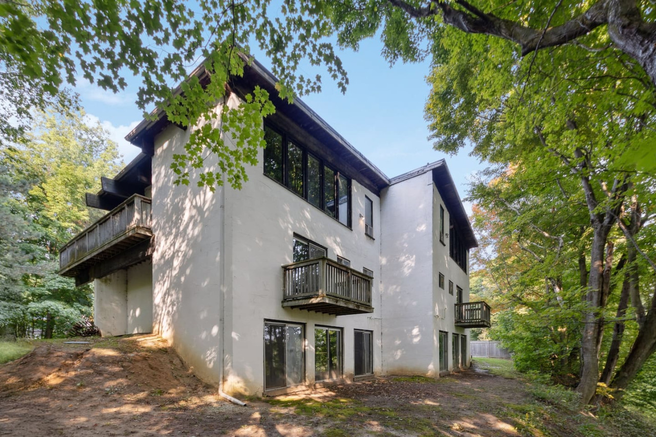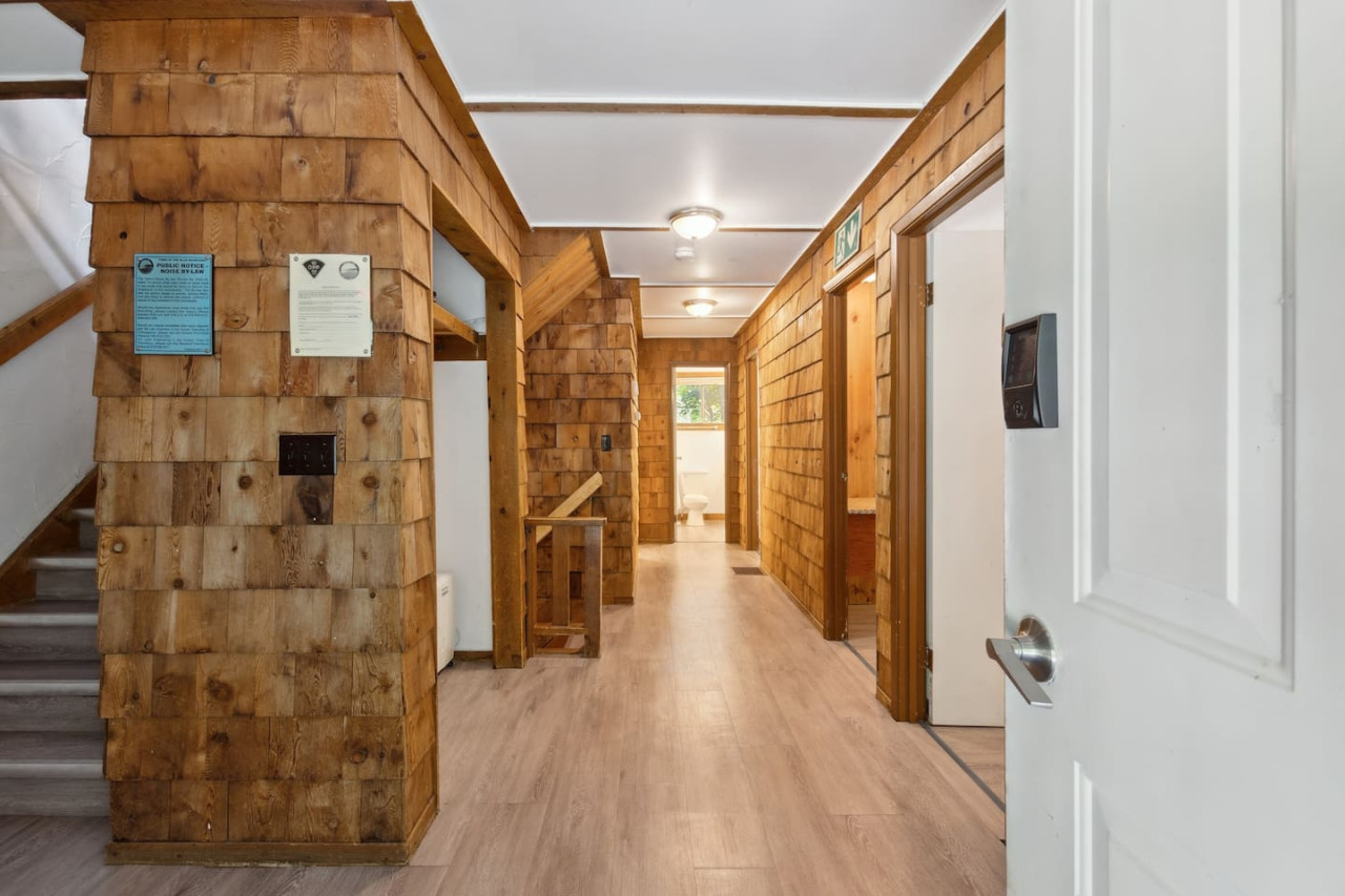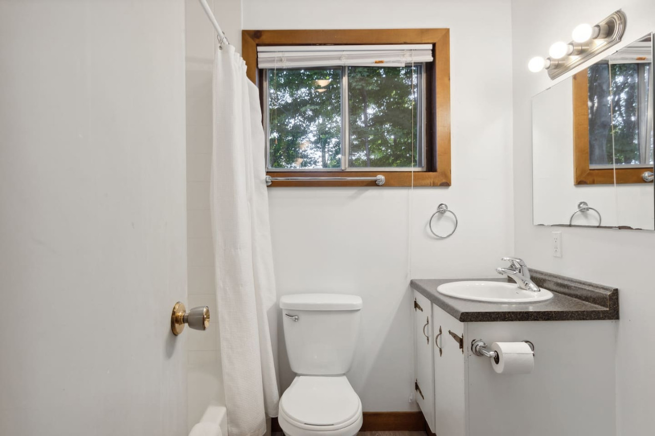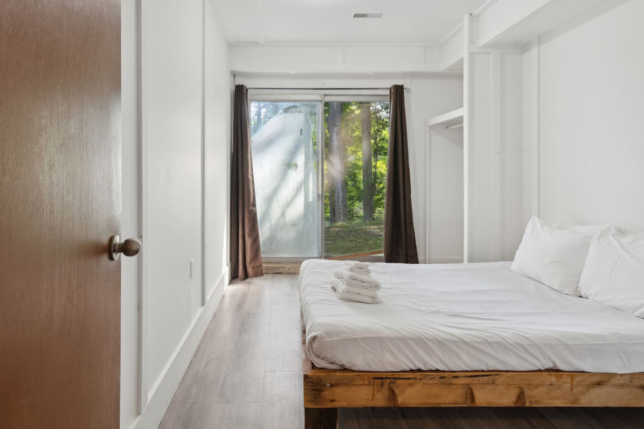 Gather with friends in the great room on the top floor. The big windows allow for lots of natural light, while the surrounding forest maintains privacy. Wood ceilings and beams along with exposed brick make this a rustic chalet-style atmosphere for après ski. On the top floor there’s comfortable seating and a Smart TV along with a wood burning fireplace. Please bring your own firewood if you plan to use the fireplace!