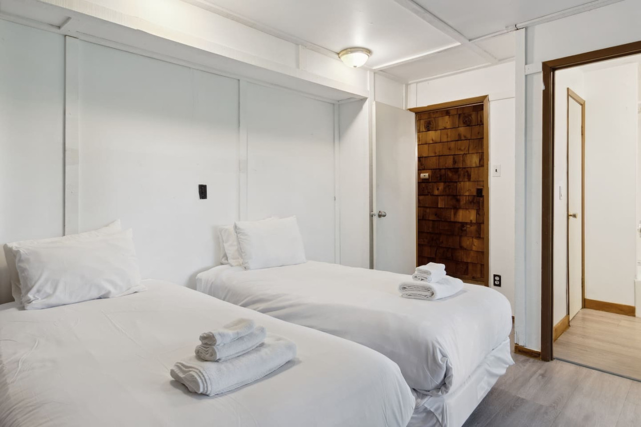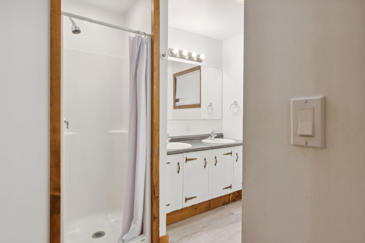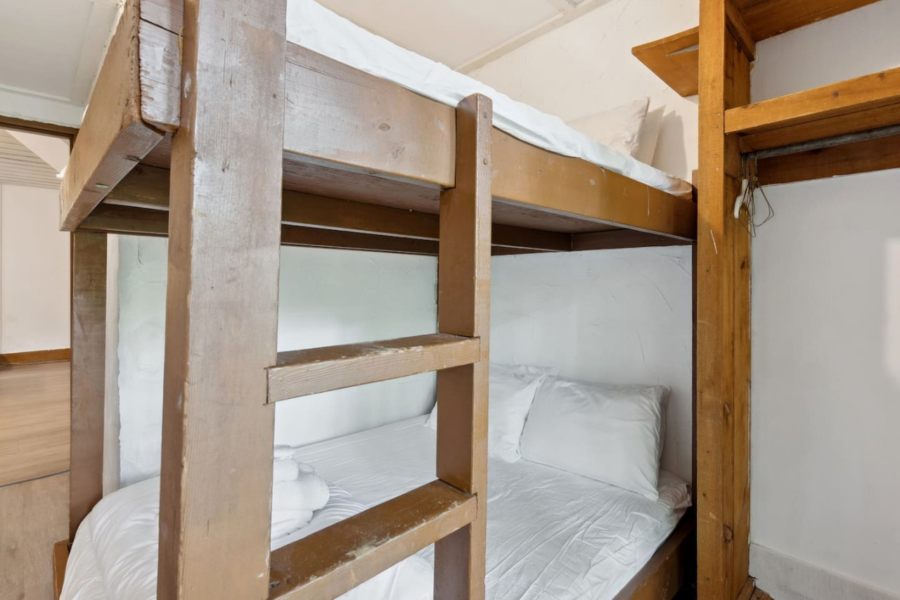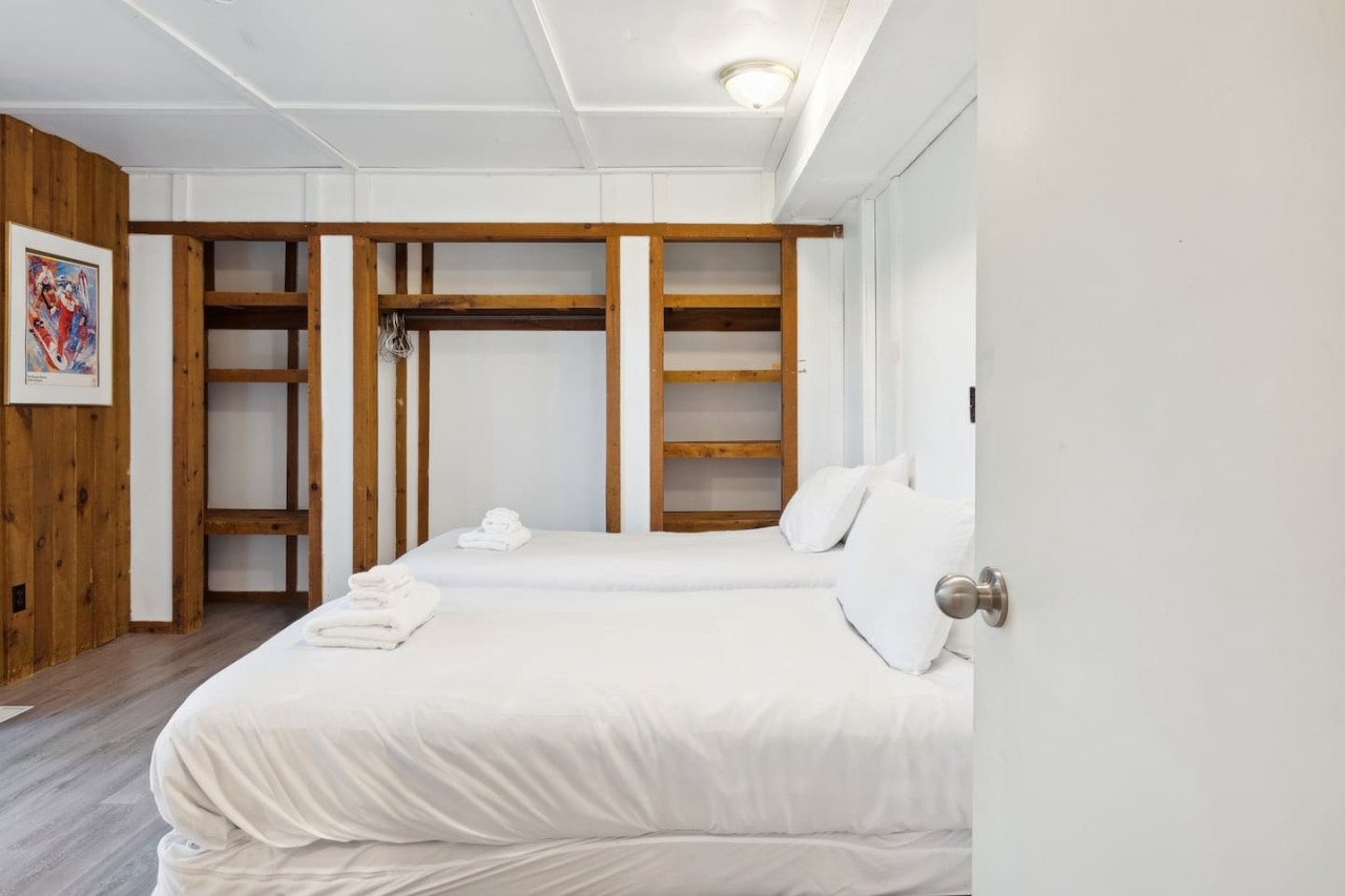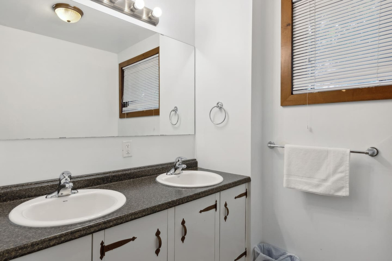 This chalet has 6 bedrooms on the 1st (basement) and 2nd levels of this home. Bedrooms 1-3 each have 2 double beds, bedrooms 4 and 5 each have a double over double bunk bed, and bedroom 6 has one double bed. Please note these bedrooms are standard and do not have closets or dressers for clothing storage. There are 2 full bathrooms in this home, one with a shower and one with a shower-in-tub. We provide all linens, towels and some travel-size toiletries for you during your stay.