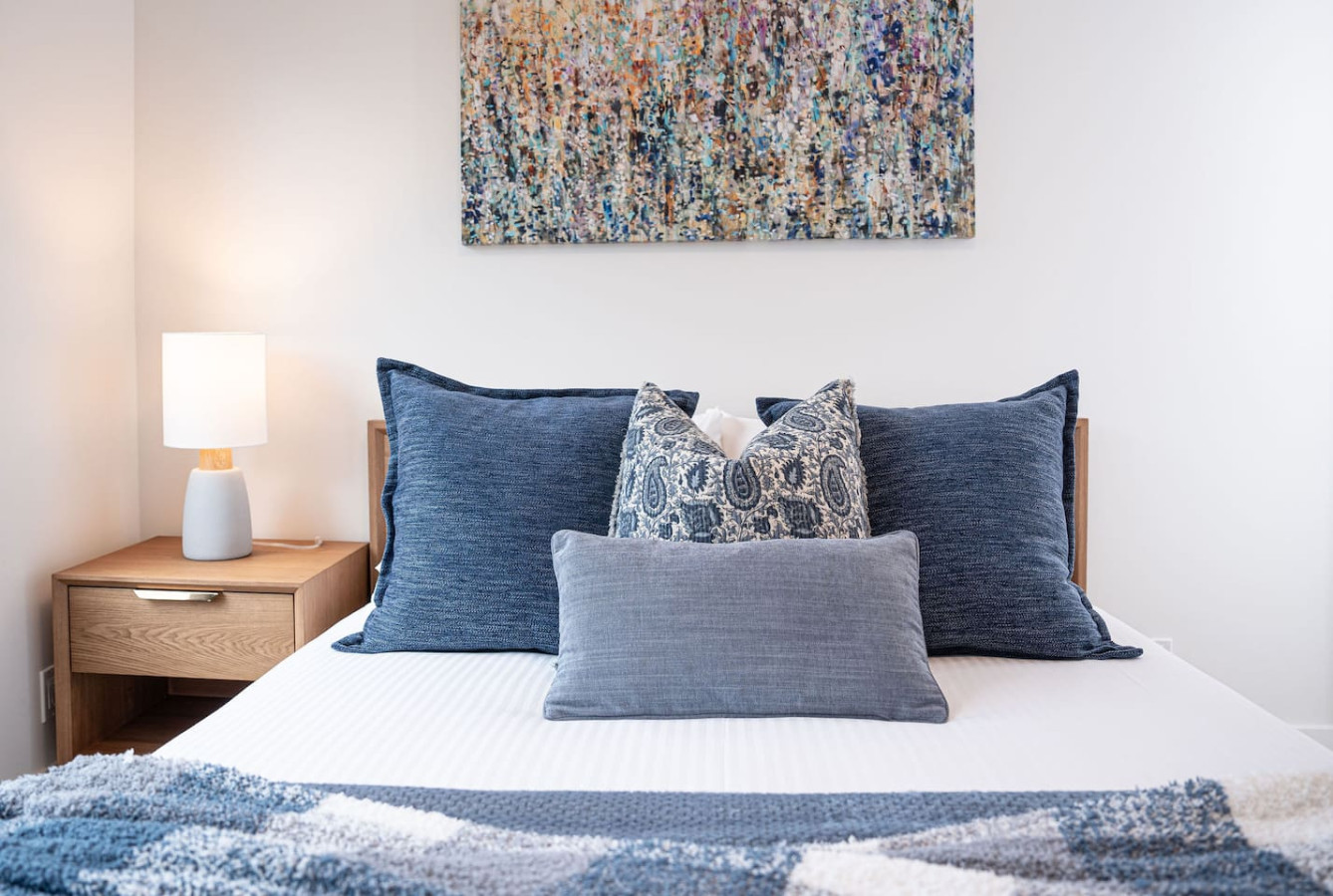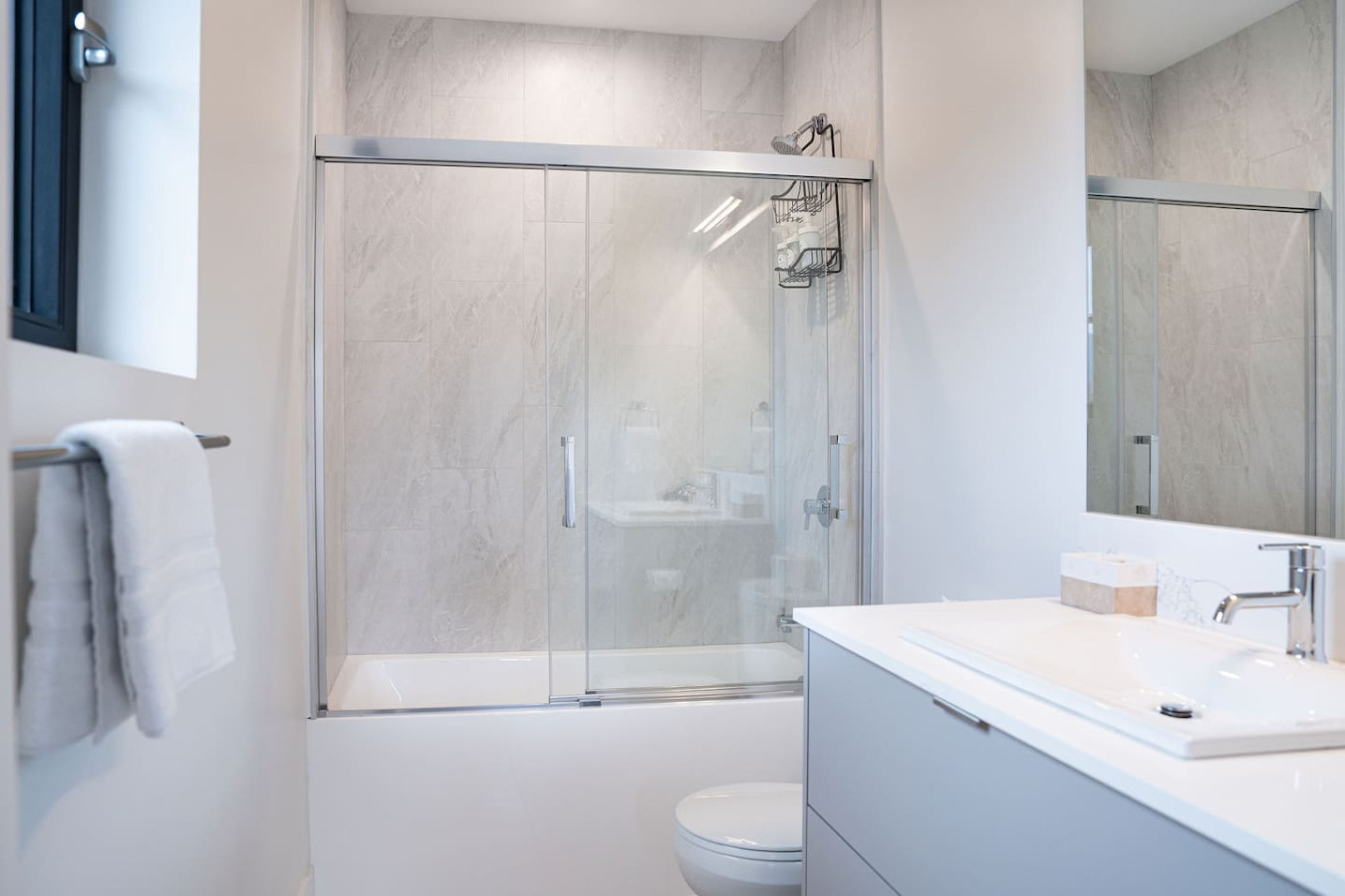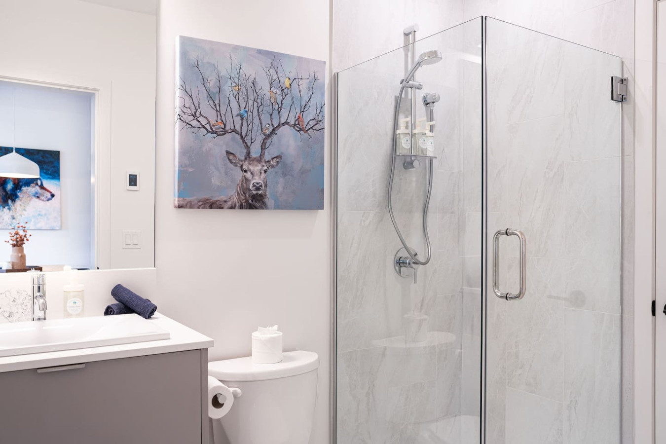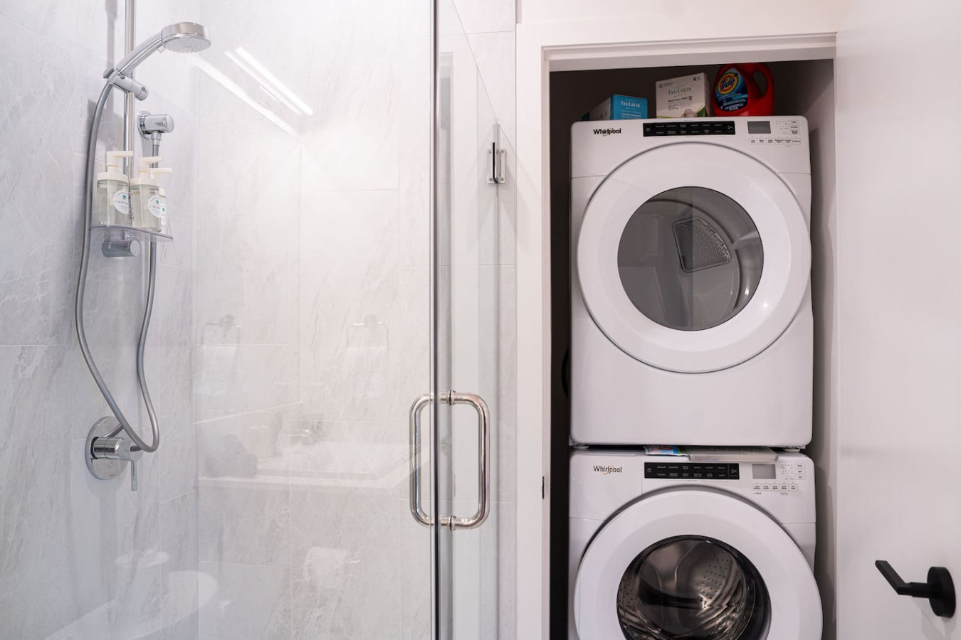 There are 2 full bathrooms in this home, one off the living room and one as the primary bedroom ensuite. Guests can enjoy the convenience of having an in-unit washer and dryer in the second bathroom.