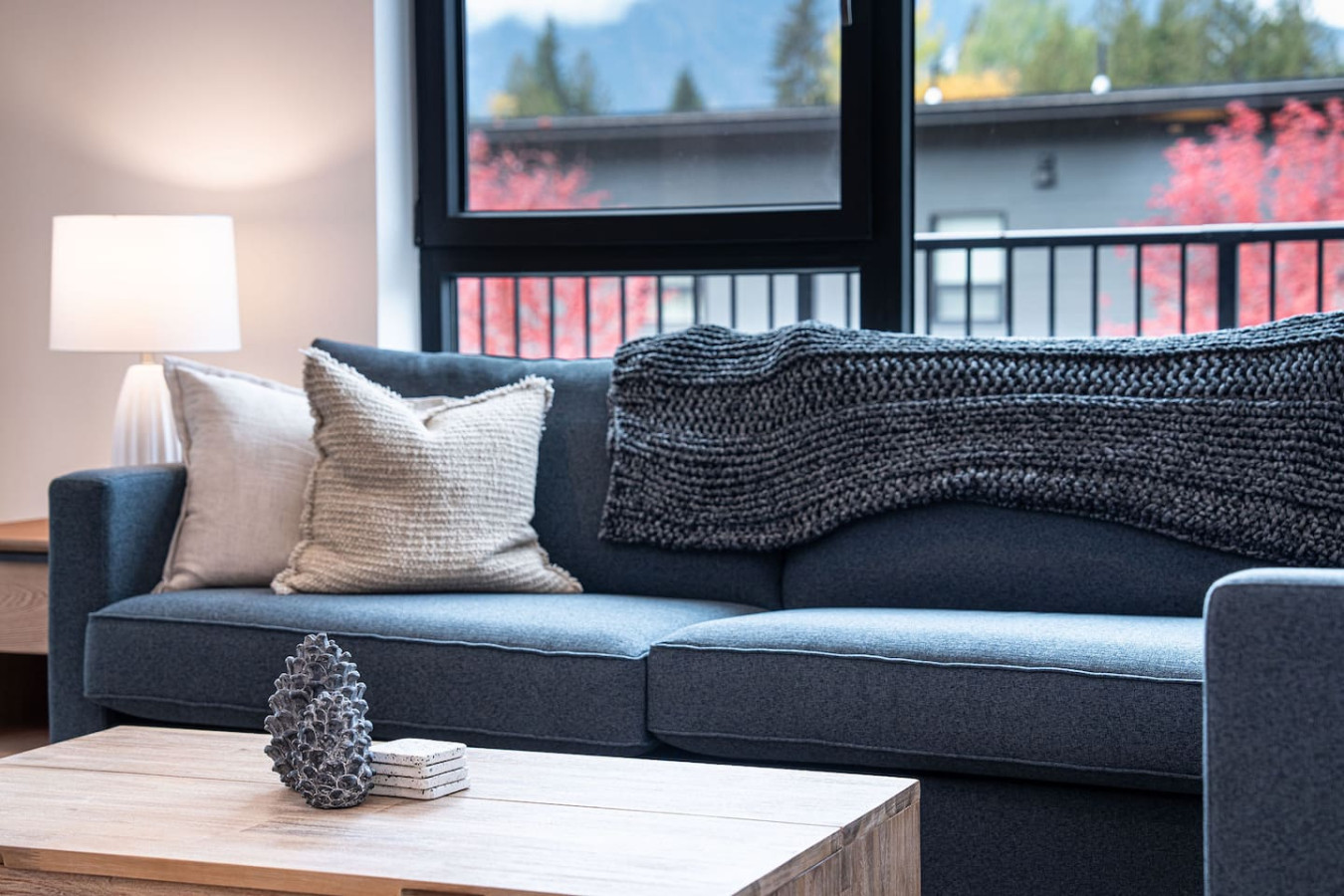 Comfortable seating surrounds the Smart TV, ideal for unwinding after a day of skiing, golfing, hiking, biking, or exploring the village. Step out onto the private balcony with a mountain view hot tub, outdoor dining area, and BBQ for laid-back evenings.