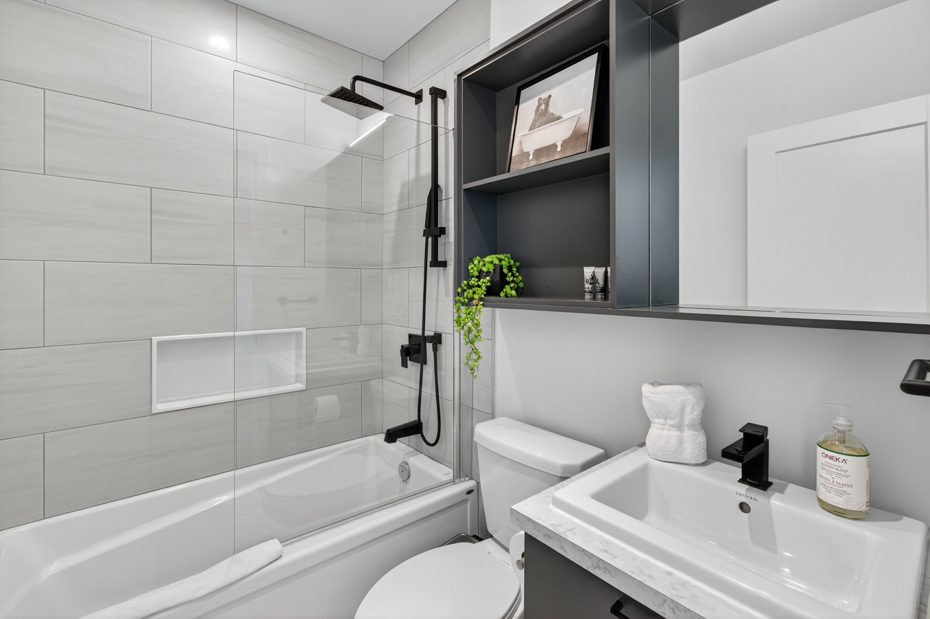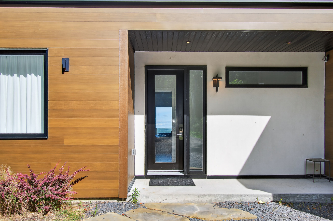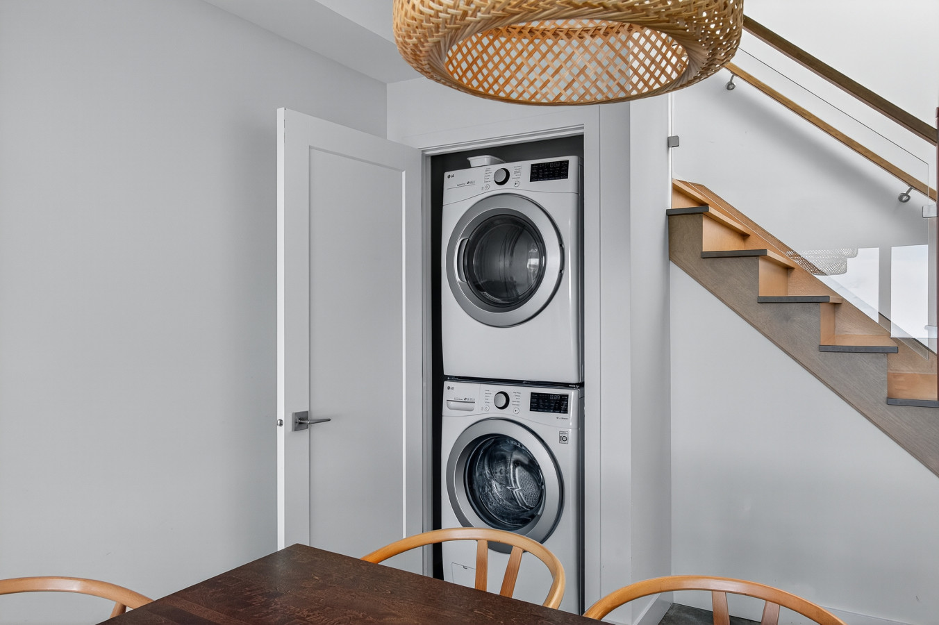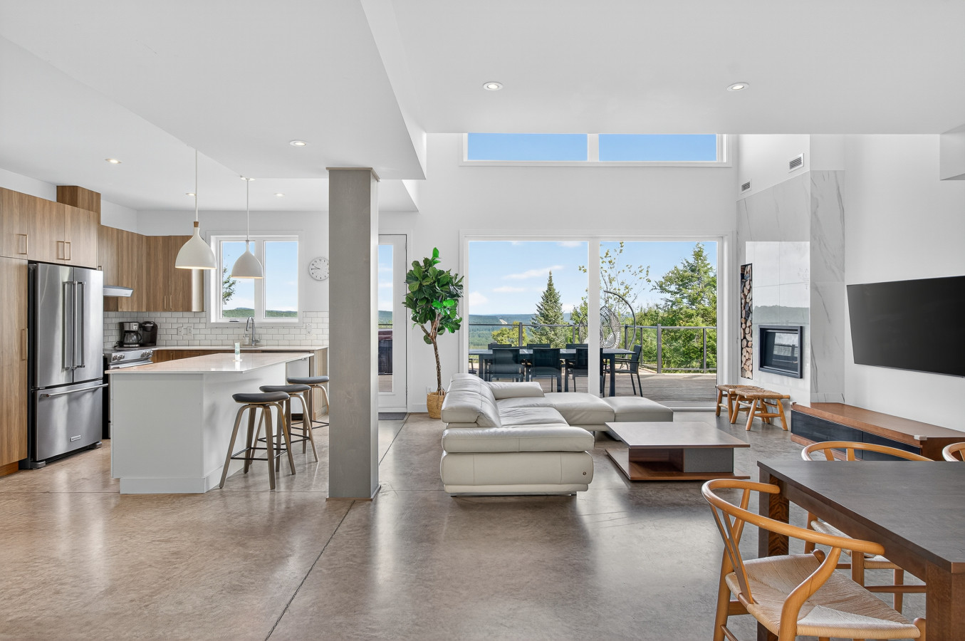 This home has 2 bedrooms with a mezzanine that can sleep up to 10 people. The open-concept living room is modern and cozy with contemporary leather sofas, a large flat screen Smart TV, and a gas fireplace. Large double-height windows fill the room with light and allow you to take full advantage of the natural beauty of the outdoors from every angle.