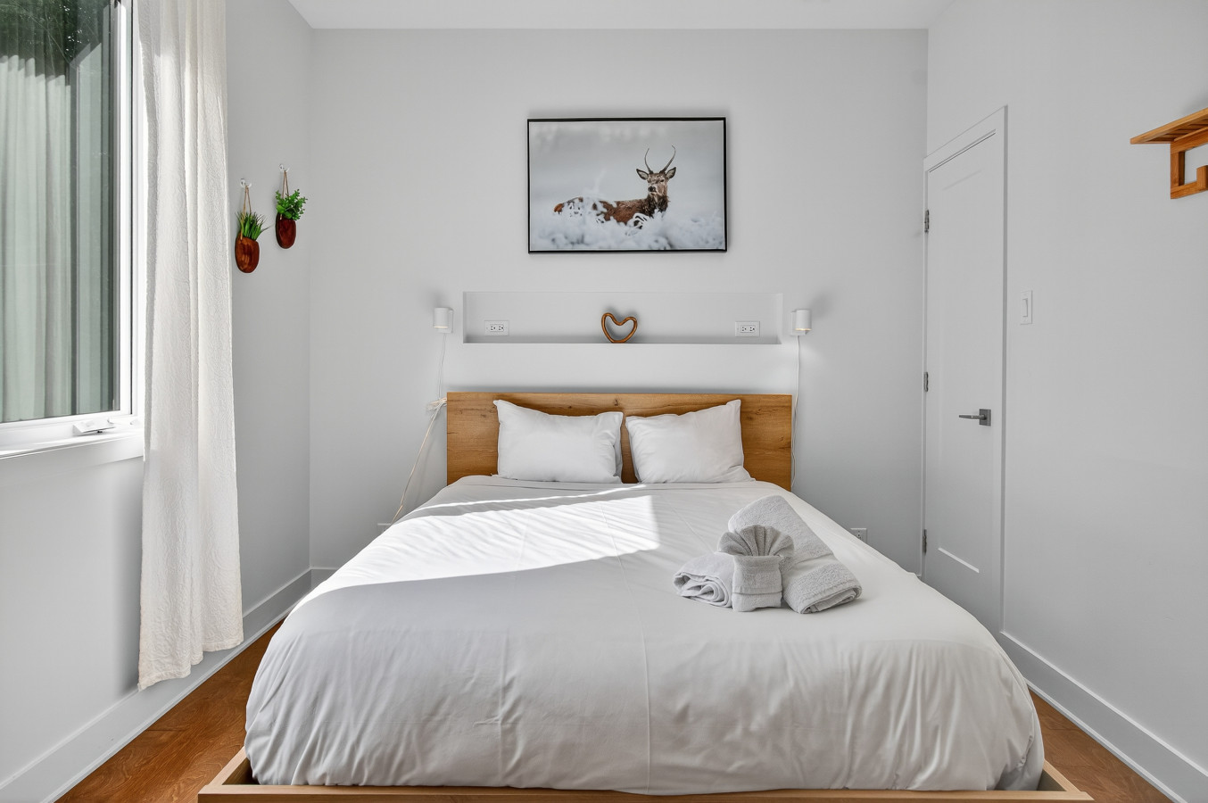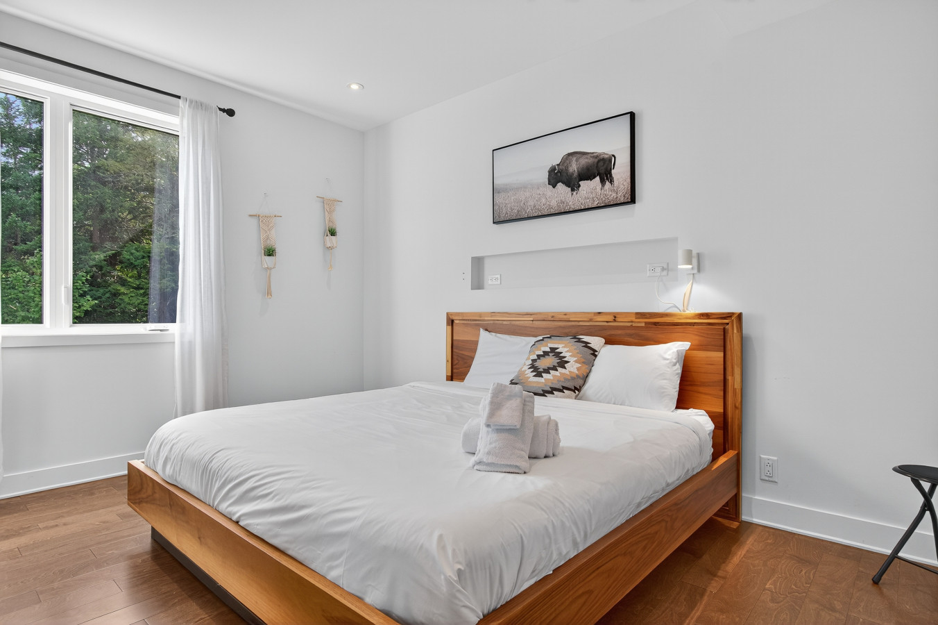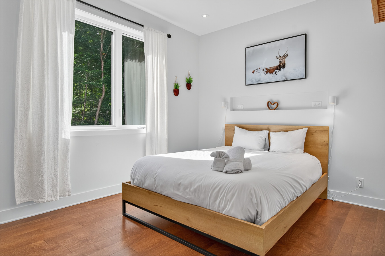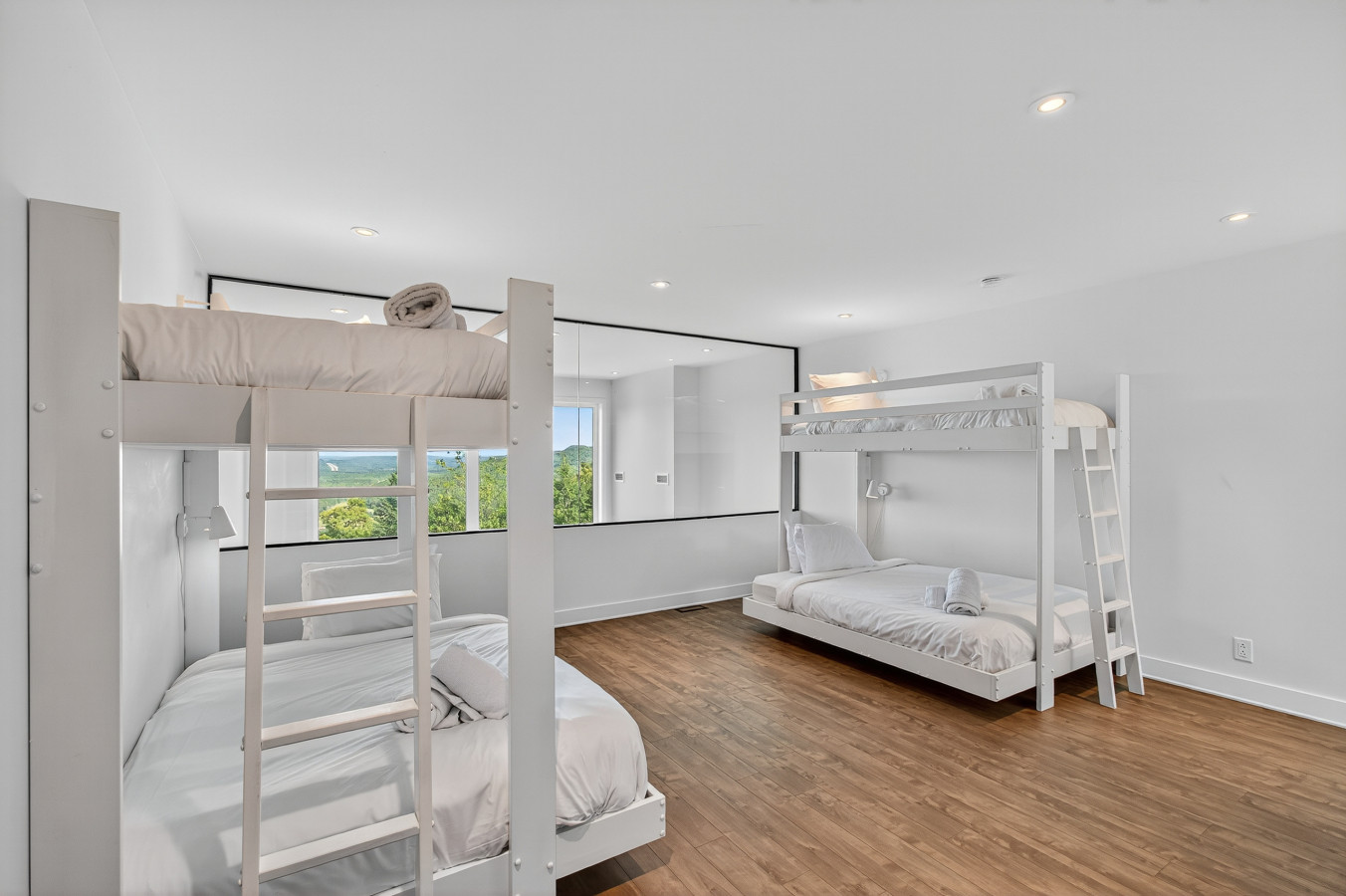 Les deux chambres principales sont situées au rez-de-chaussée et disposent chacune d'un lit King et d'une salle de bains attenante. La chambre 3 dispose d'un lit Queen. La chambre 4 est située au deuxième étage dans la mezzanine et dispose de deux lits superposés simples sur doubles, ainsi que d'une télévision Smart TV à écran plat.