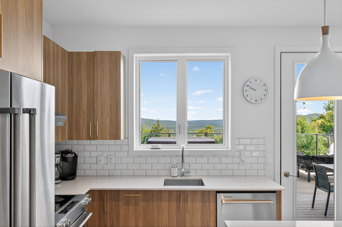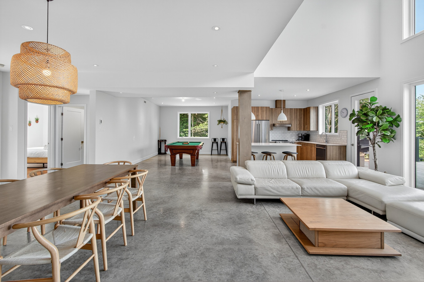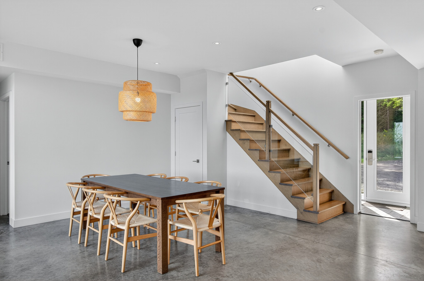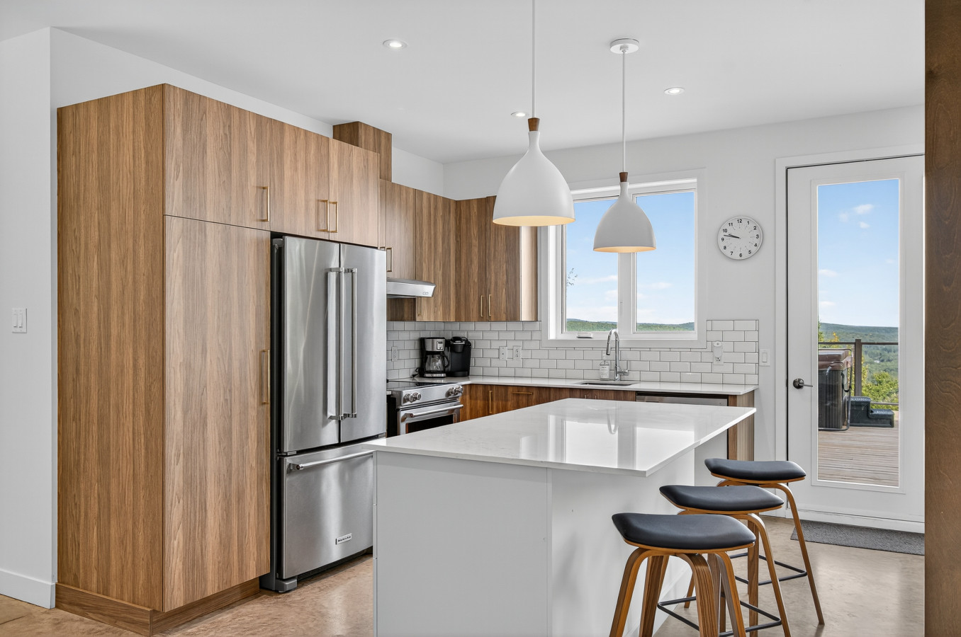 La cuisine entièrement équipée comporte des appareils haut de gamme, notamment un lave-vaisselle, une machine Keurig et une cuisinière. Le coin repas, avec sa table et ses chaises en bois moderne, offre une vue sur l'extérieur.