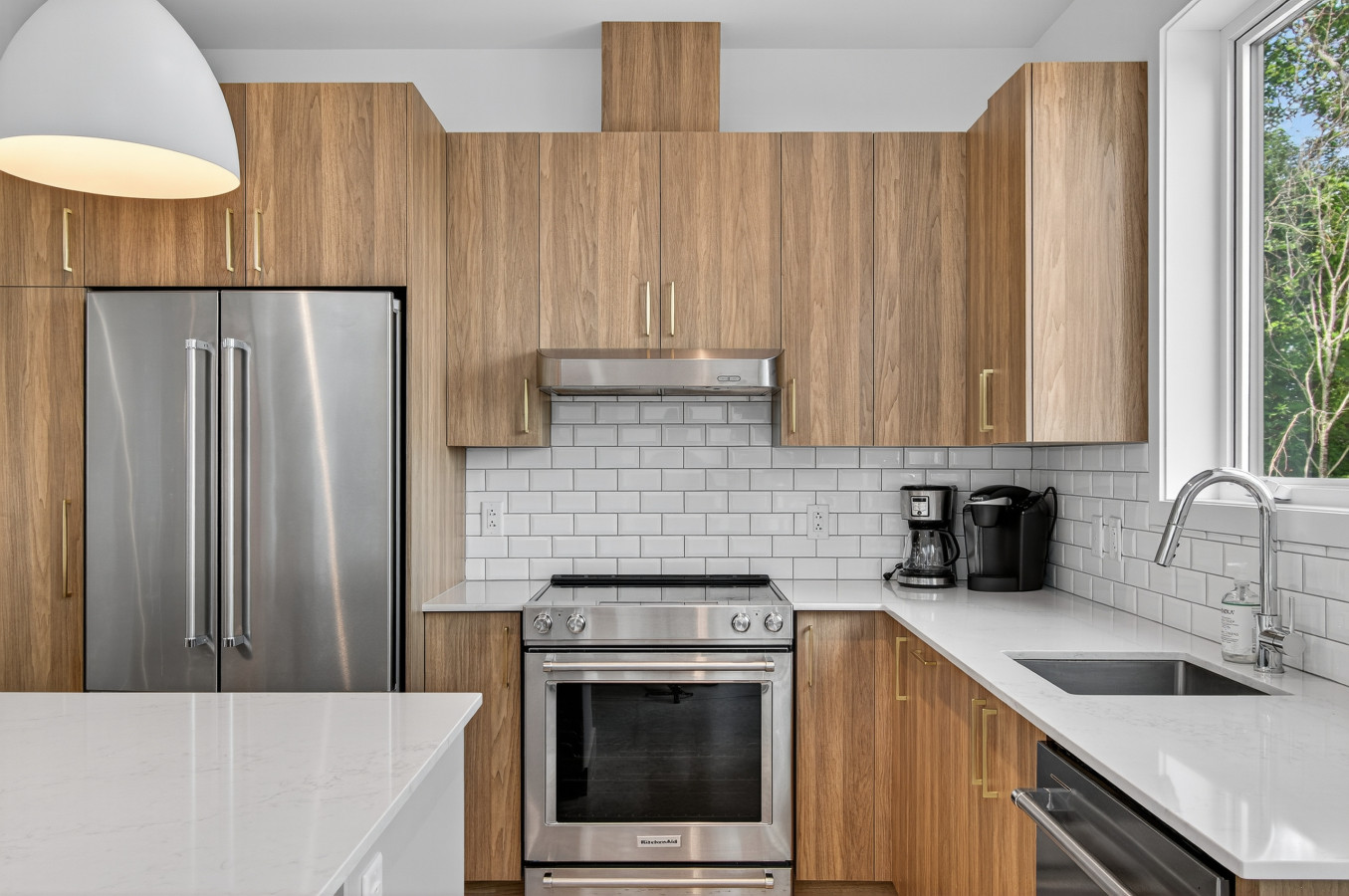 The fully equipped kitchen has high-end appliances including a dishwasher, Keurig Machine and cook-top stove. The dining area with a modern wood table and chairs offers the view of the outdoors.
