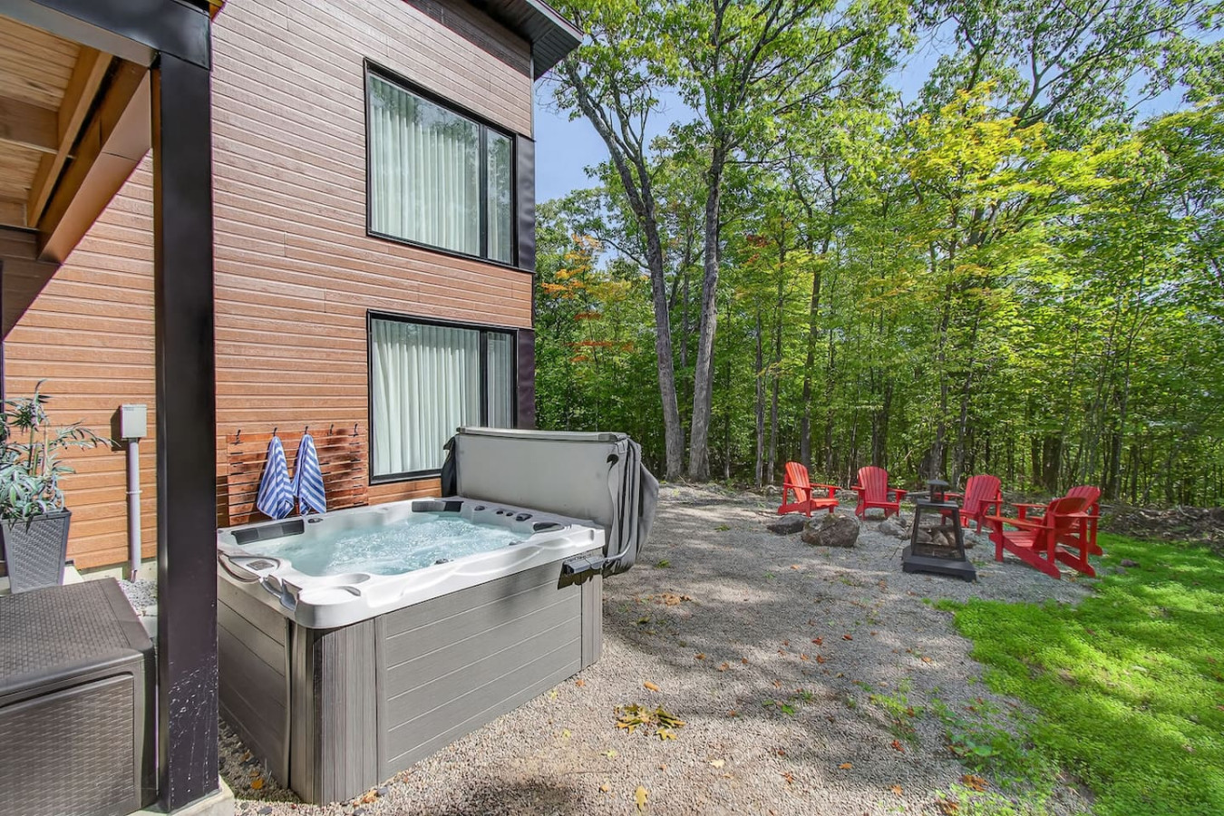 Profitez du barbecue et du salon extérieur, détendez-vous dans le jacuzzi privé ou réunissez-vous autour du foyer extérieur (bois de chauffage vendu localement).