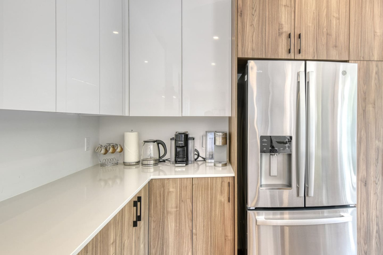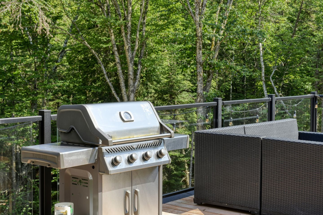 La grande cuisine est équipée de tous les éléments de base pour la préparation et la cuisson des plats, ainsi que d'appareils tels qu'une bouilloire, une cafetière Keurig, une machine à café Nespresso Vertuo, un grille-pain, un lave-vaisselle et un mixeur. Le patio extérieur est également équipé d'un barbecue tout au long de l'année. Il vous suffit d'apporter votre nourriture, votre café, et vos épices ! La salle à manger intérieure donne sur le patio et offre une vue sur la forêt. Une chaise haute est également disponible dans la maison pour votre enfant.