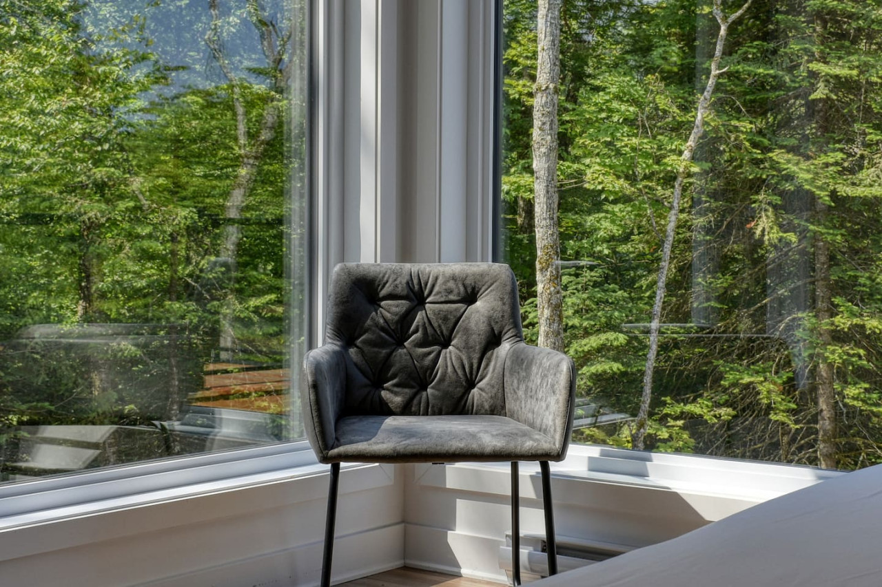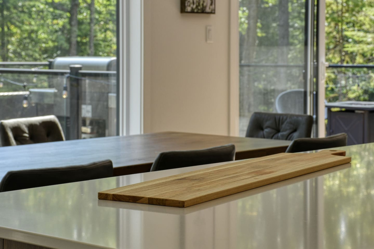The large kitchen is equipped with all cooking and baking basics, and appliances such as a kettle, Keurig, Nespresso Vertuo, toaster, dishwasher, and blender. The outdoor patio also offers a BBQ year-round for your convenience. All you need to bring is your food, coffee, and spices! The indoor dining area overlooks the patio with forest views. A high chair is also available in the home for your little one.
