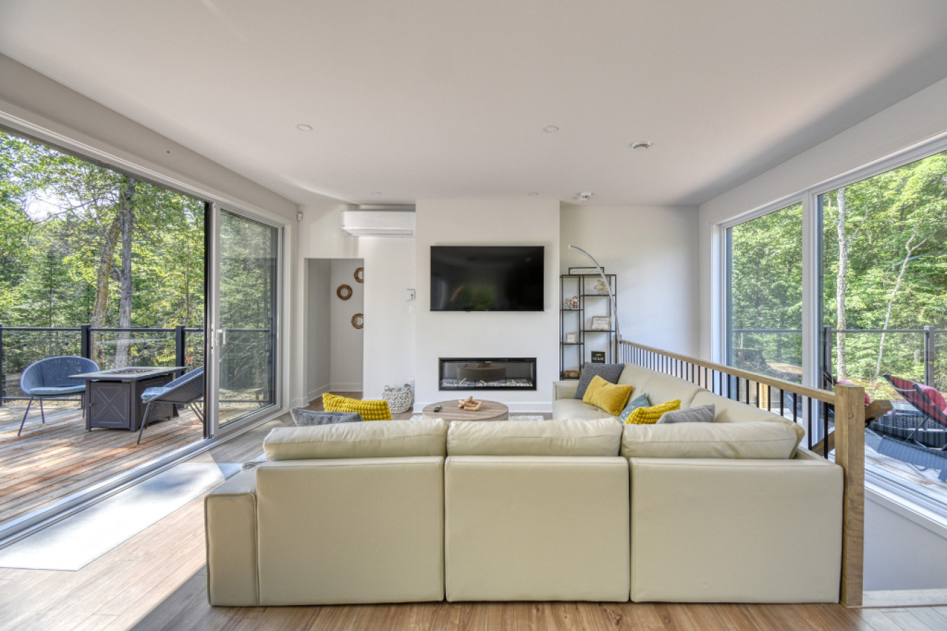 En entrant dans le salon principal, vous serez accueilli par un grand canapé sectionnel, un foyer au gaz et une télévision intelligente. Le niveau inférieur de la maison offre un salon secondaire avec un canapé et une Smart TV, à côté des portes-fenêtres coulissantes donnant accès au foyer.