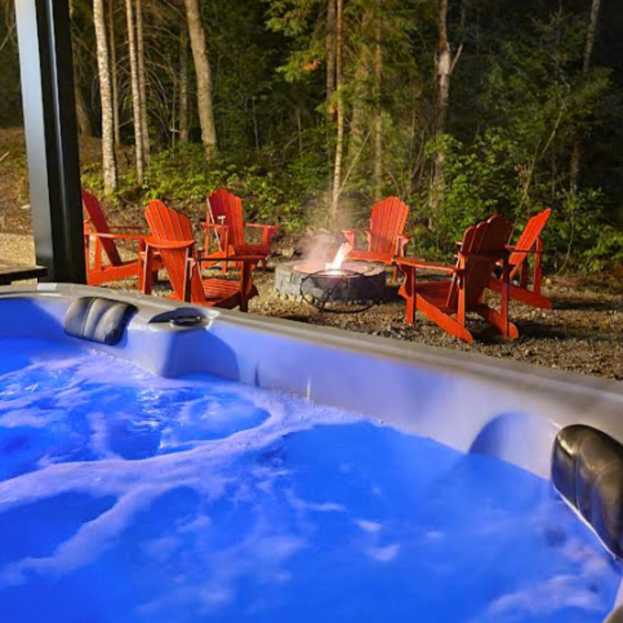 Our Bel Air Retreat has an abundance of outdoor amenities for you to enjoy during your stay, such as the BBQ, sun loungers, fire pit, muskoka chairs, gas fireplace, and a private hot tub.
