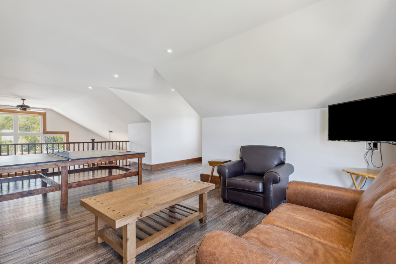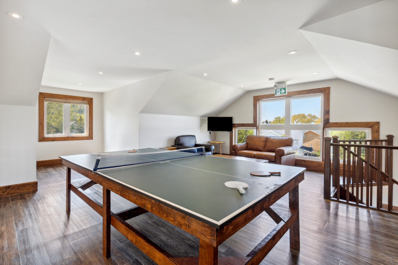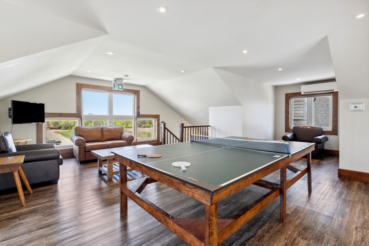 For your entertainment, the loft area offers a games zone with a ping pong table and another TV. Or, you can easily turn this into your yoga zen space with a group.