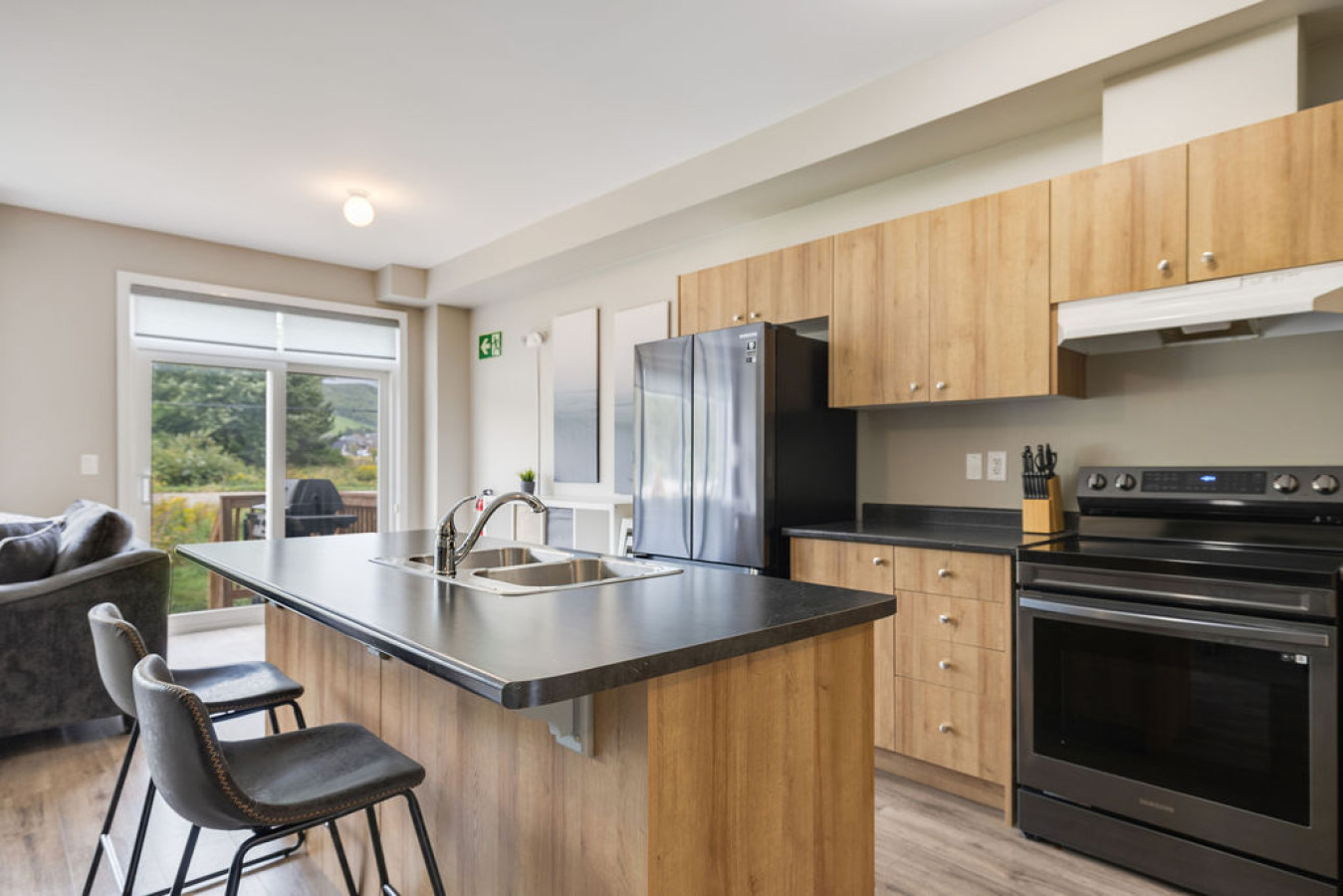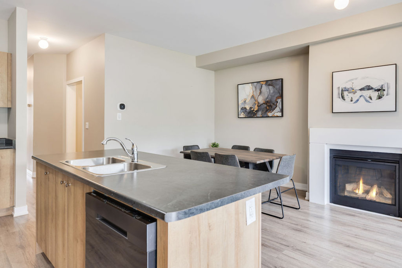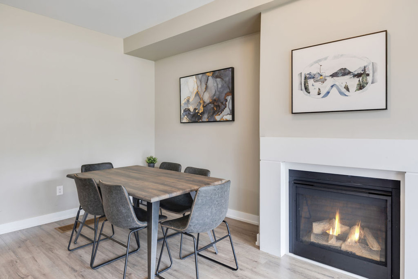 The kitchen features contemporary appliances and an adjacent dining area. Whether you prefer preparing meals at home or enjoying local cuisine from Blue Mountain or Collingwood, you'll find all the amenities needed for flexibility and convenience during your stay. All you need to bring is your food, spices, and Keurig pods!