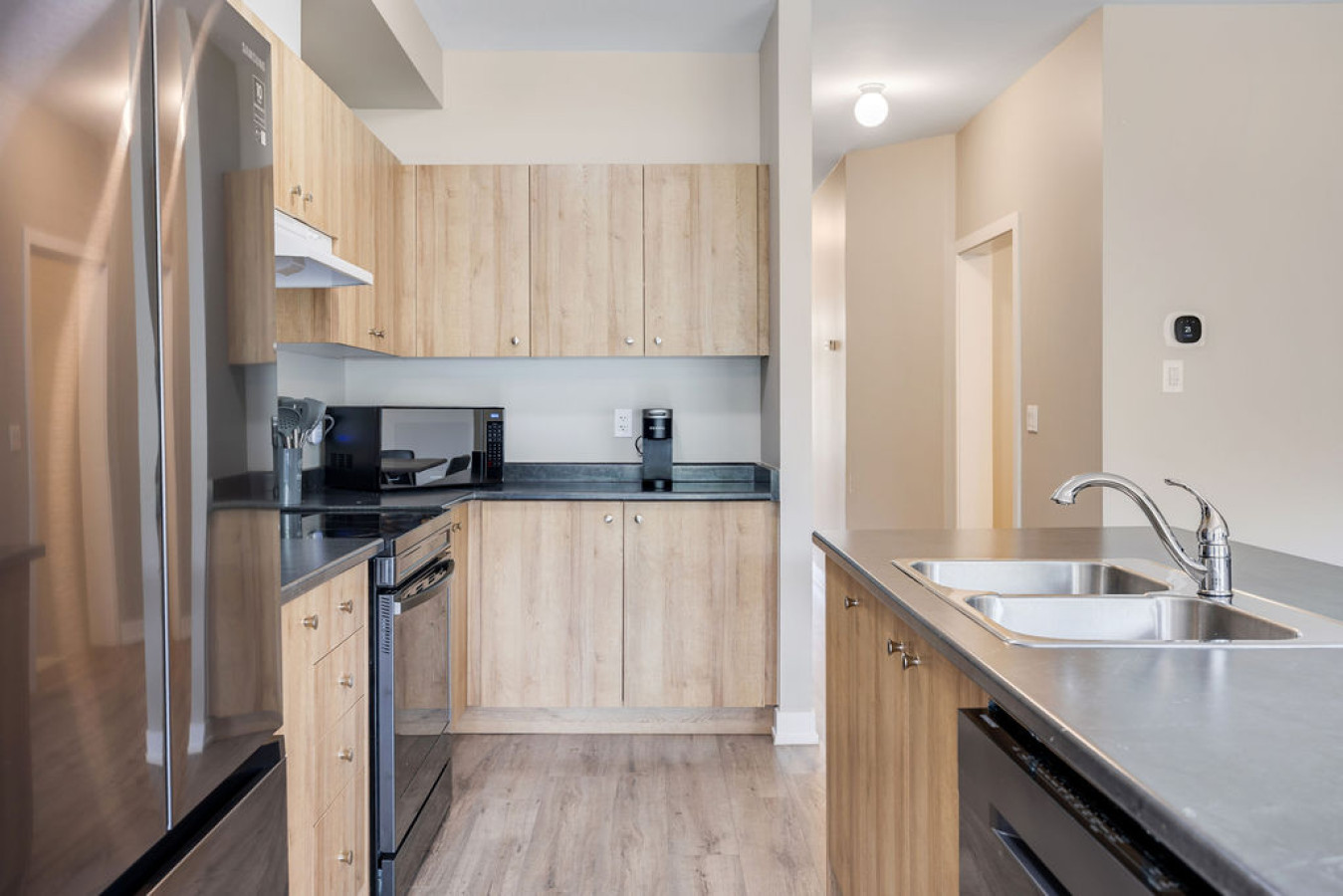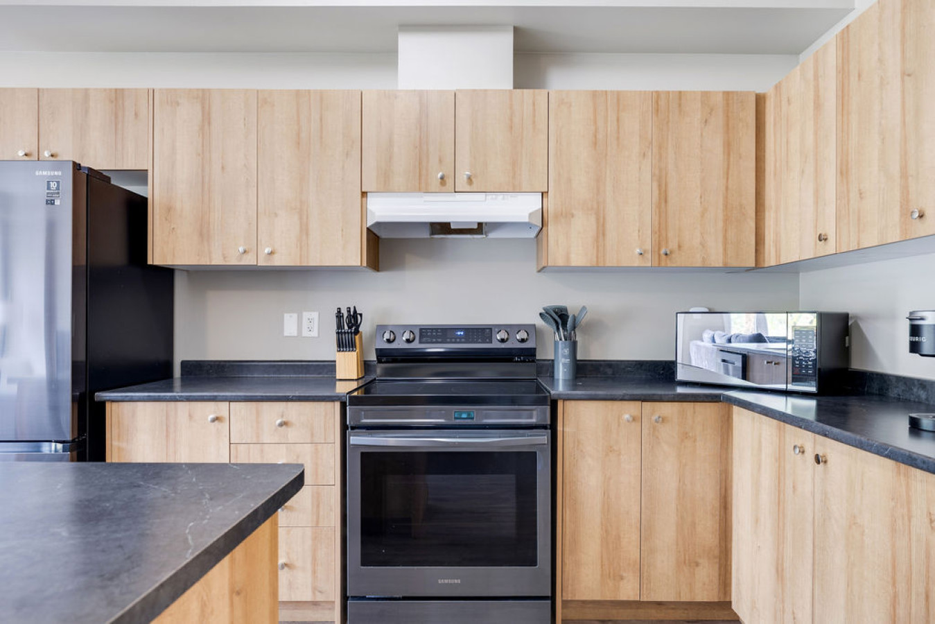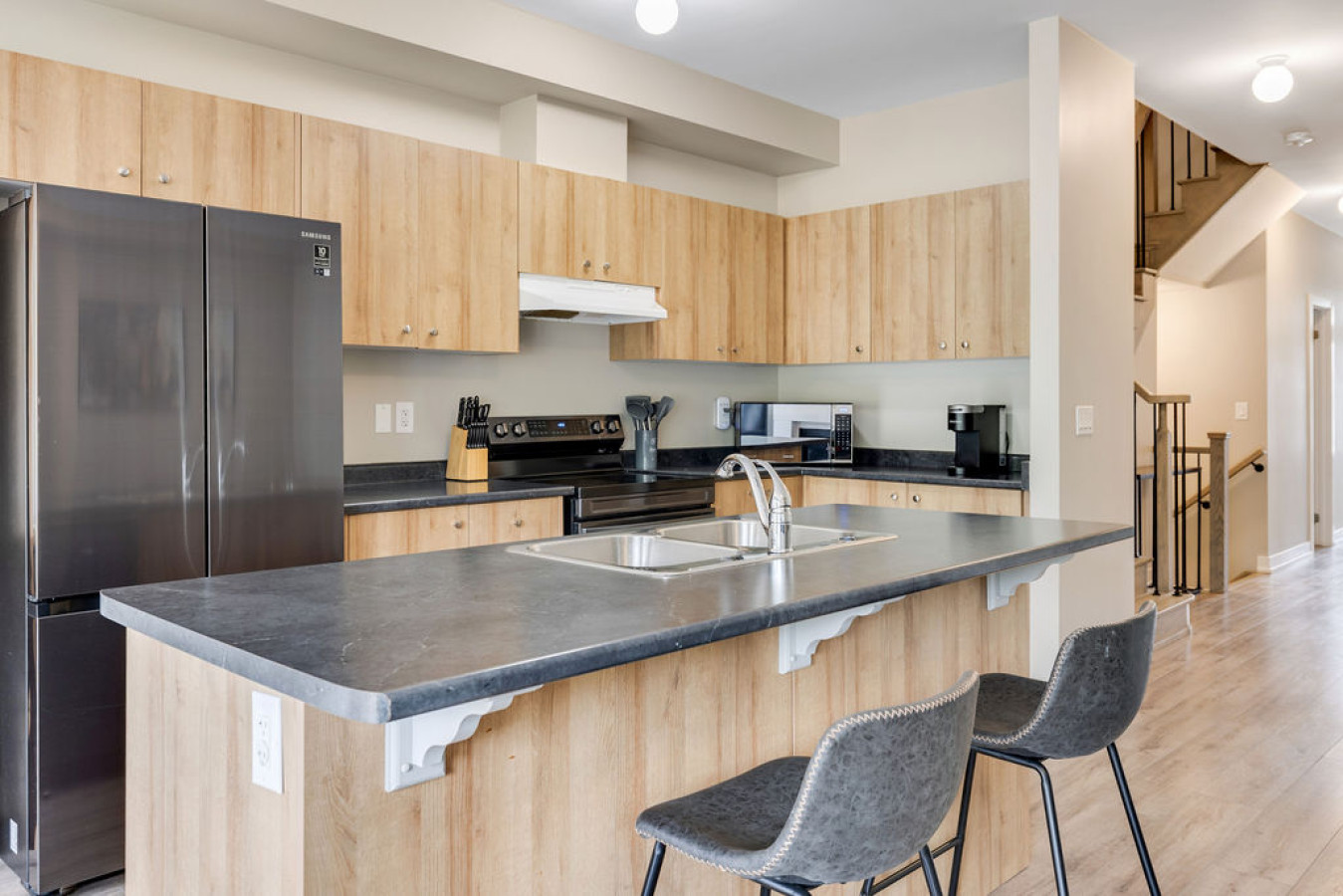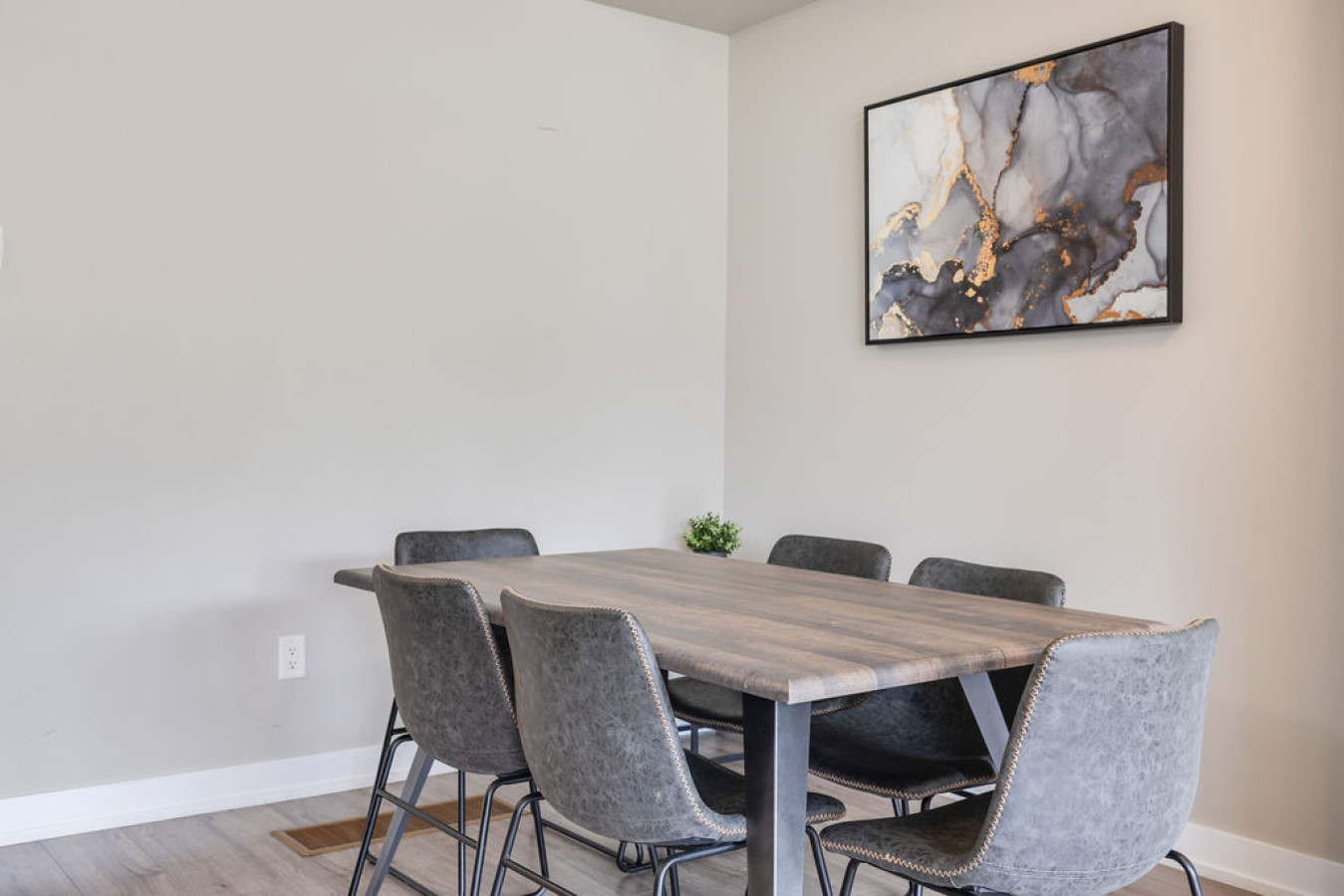 The kitchen features contemporary appliances and an adjacent dining area. Whether you prefer preparing meals at home or enjoying local cuisine from Blue Mountain or Collingwood, you'll find all the amenities needed for flexibility and convenience during your stay. All you need to bring is your food, spices, and Keurig pods!