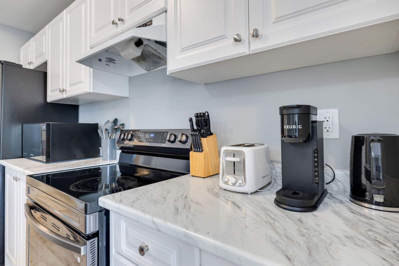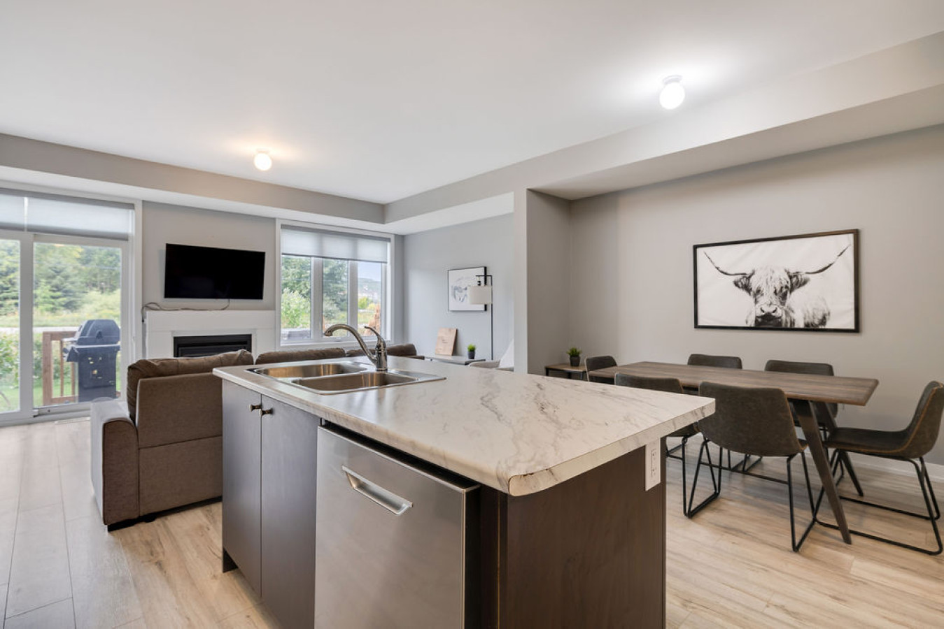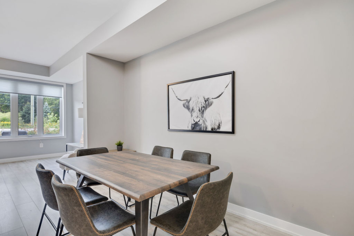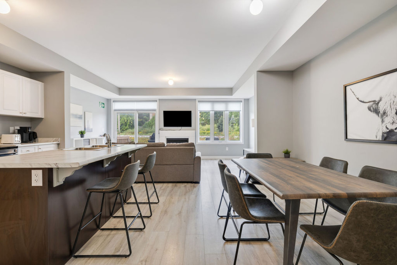The kitchen features contemporary appliances and an adjacent dining area. Whether you prefer preparing meals at home or enjoying local cuisine from Blue Mountain or Collingwood, you'll find all the amenities needed for flexibility and convenience during your stay. All you need to bring is your food, spices, and Keurig pods!