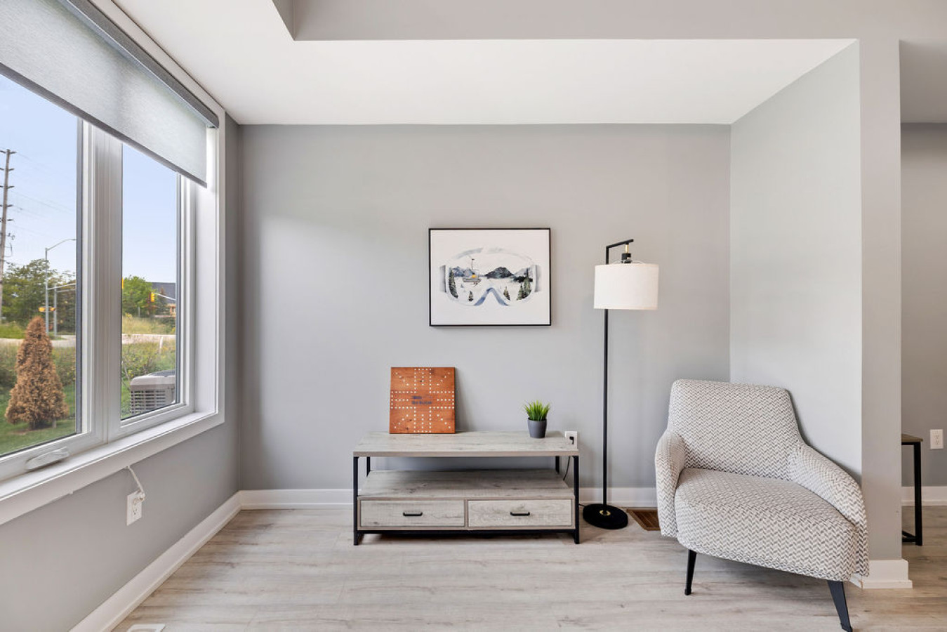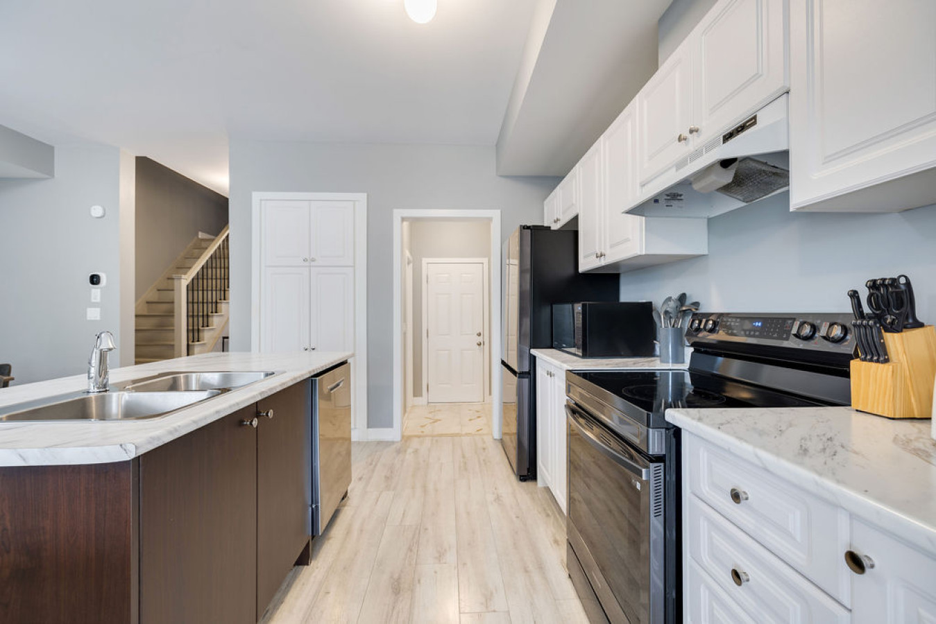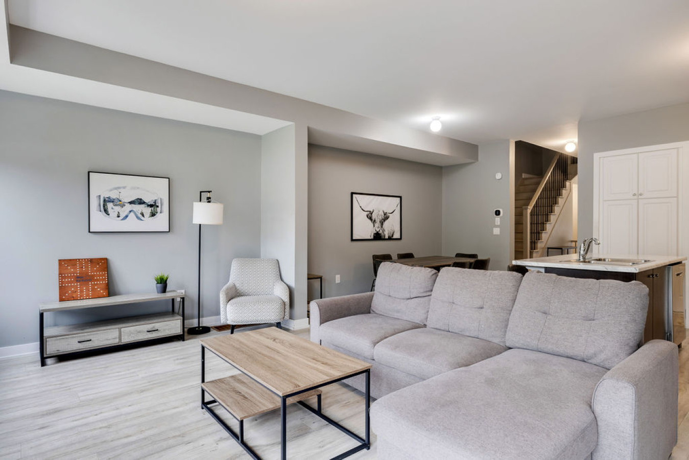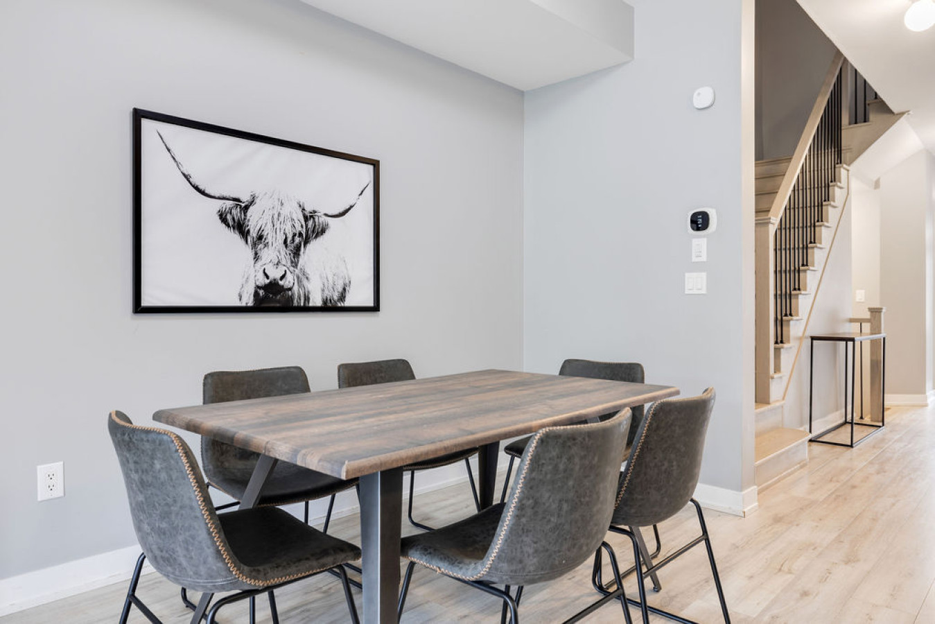 The kitchen features contemporary appliances and an adjacent dining area. Whether you prefer preparing meals at home or enjoying local cuisine from Blue Mountain or Collingwood, you'll find all the amenities needed for flexibility and convenience during your stay. All you need to bring is your food, spices, and Keurig pods!