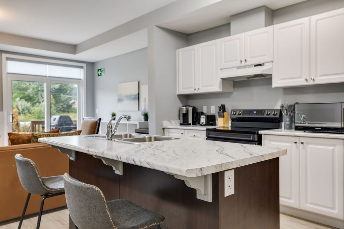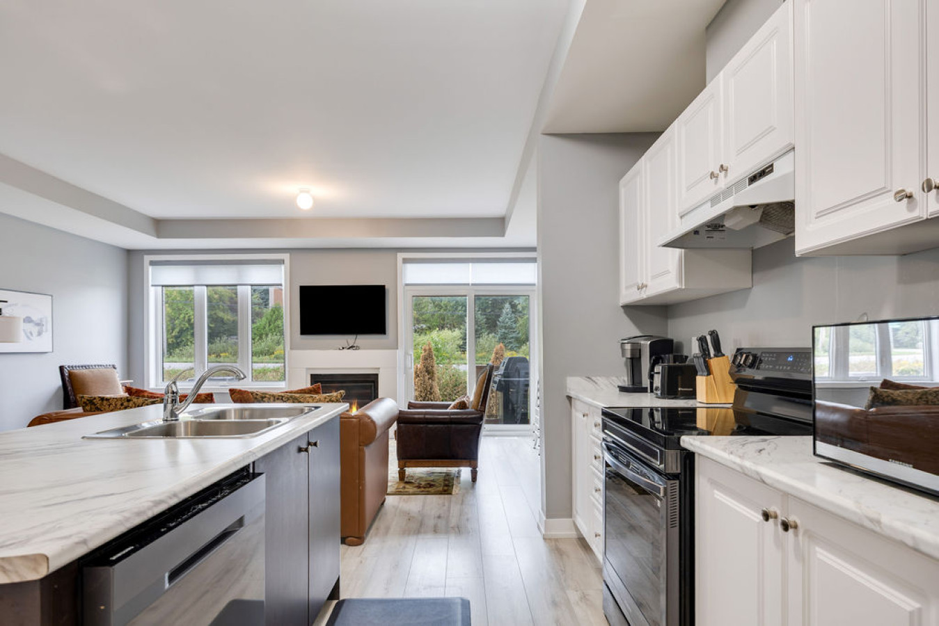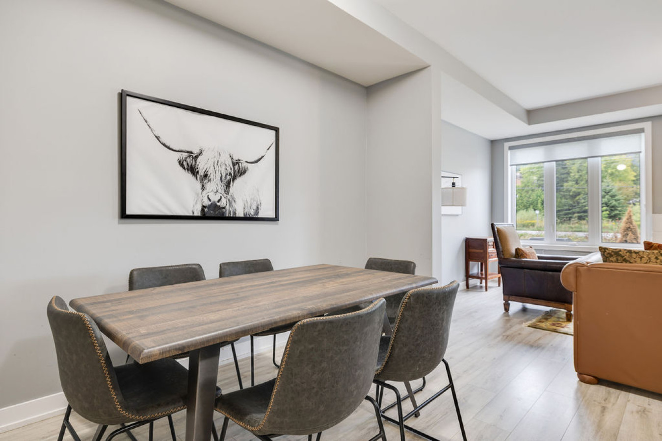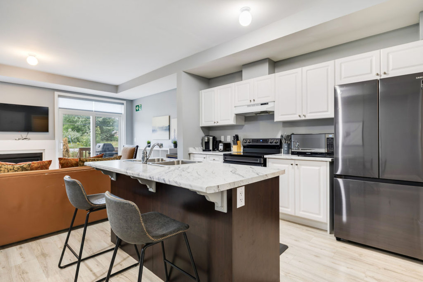 The kitchen features contemporary appliances and an adjacent dining area. Whether you prefer preparing meals at home or enjoying local cuisine from Blue Mountain or Collingwood, you'll find all the amenities needed for flexibility and convenience during your stay. All you need to bring is your food, spices, and Keurig pods!