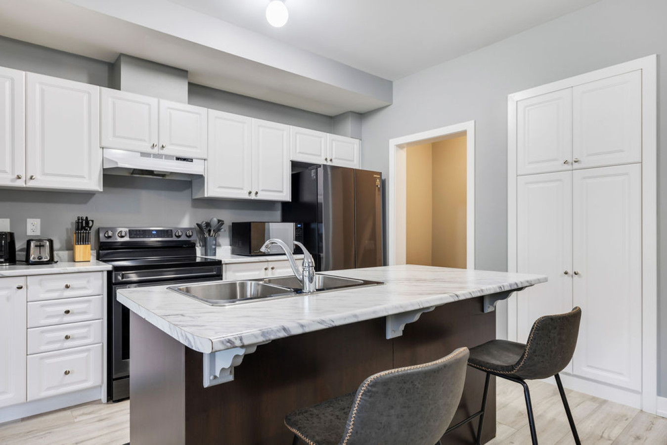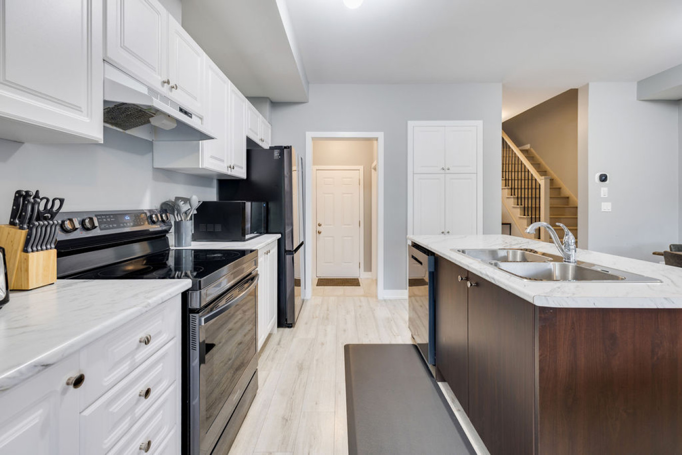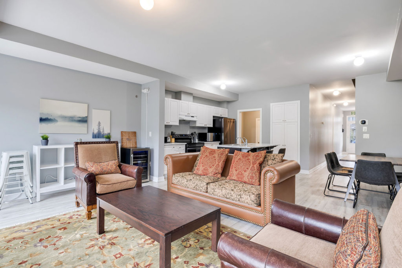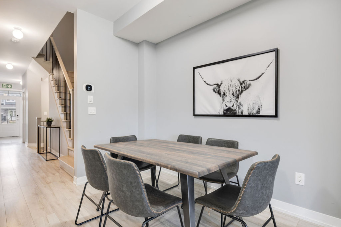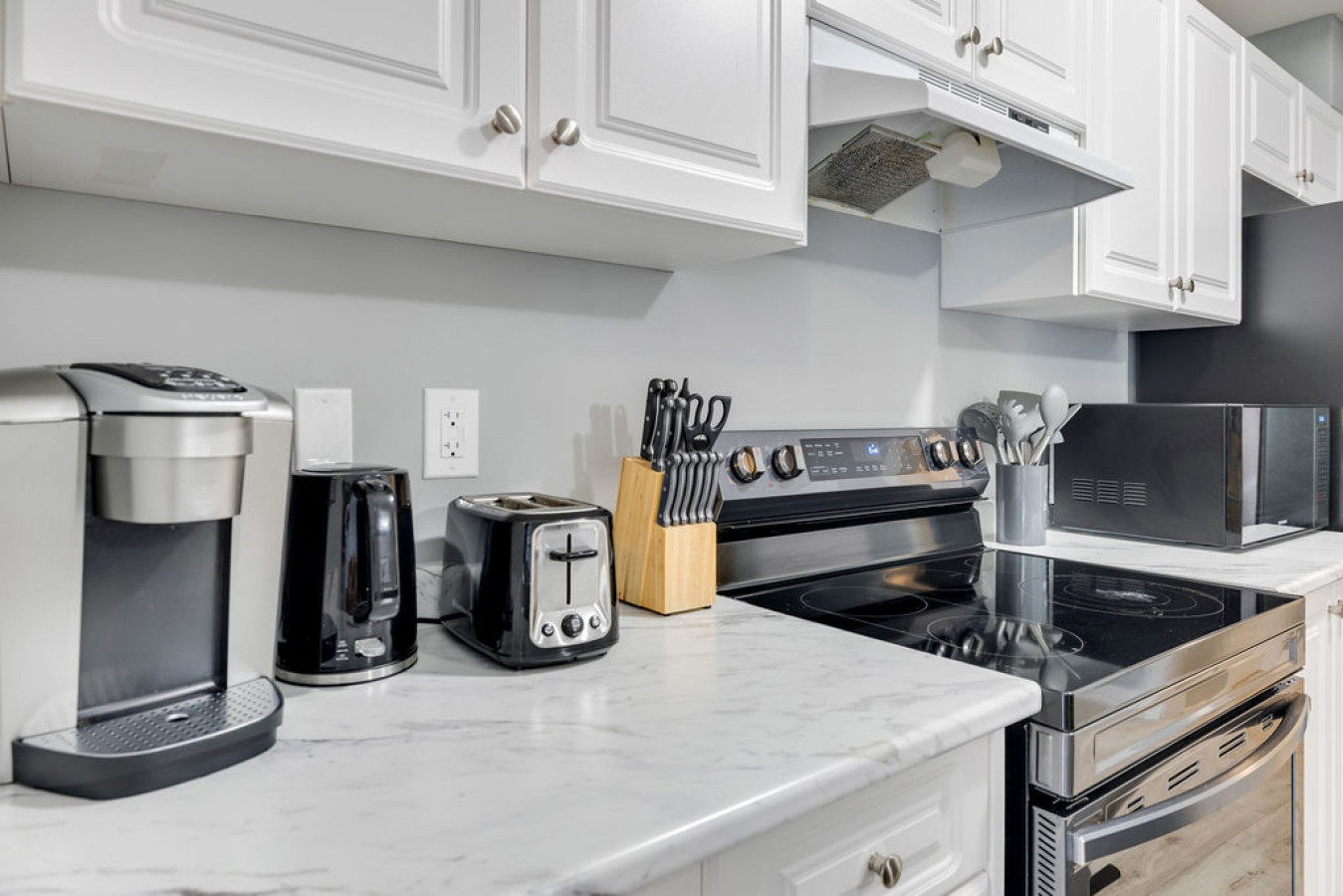 The kitchen features contemporary appliances and an adjacent dining area. Whether you prefer preparing meals at home or enjoying local cuisine from Blue Mountain or Collingwood, you'll find all the amenities needed for flexibility and convenience during your stay. All you need to bring is your food, spices, and Keurig pods!