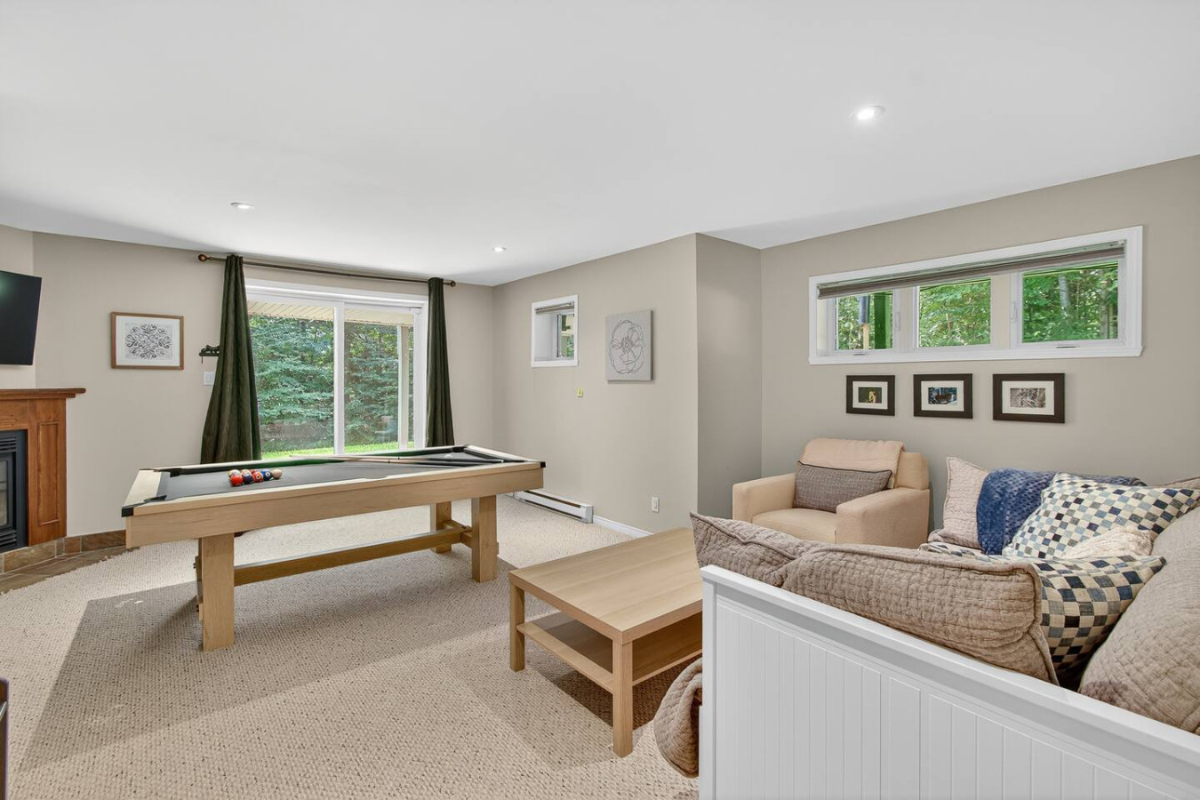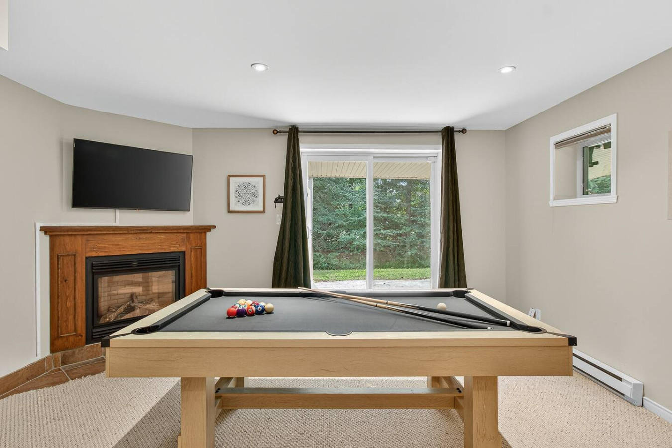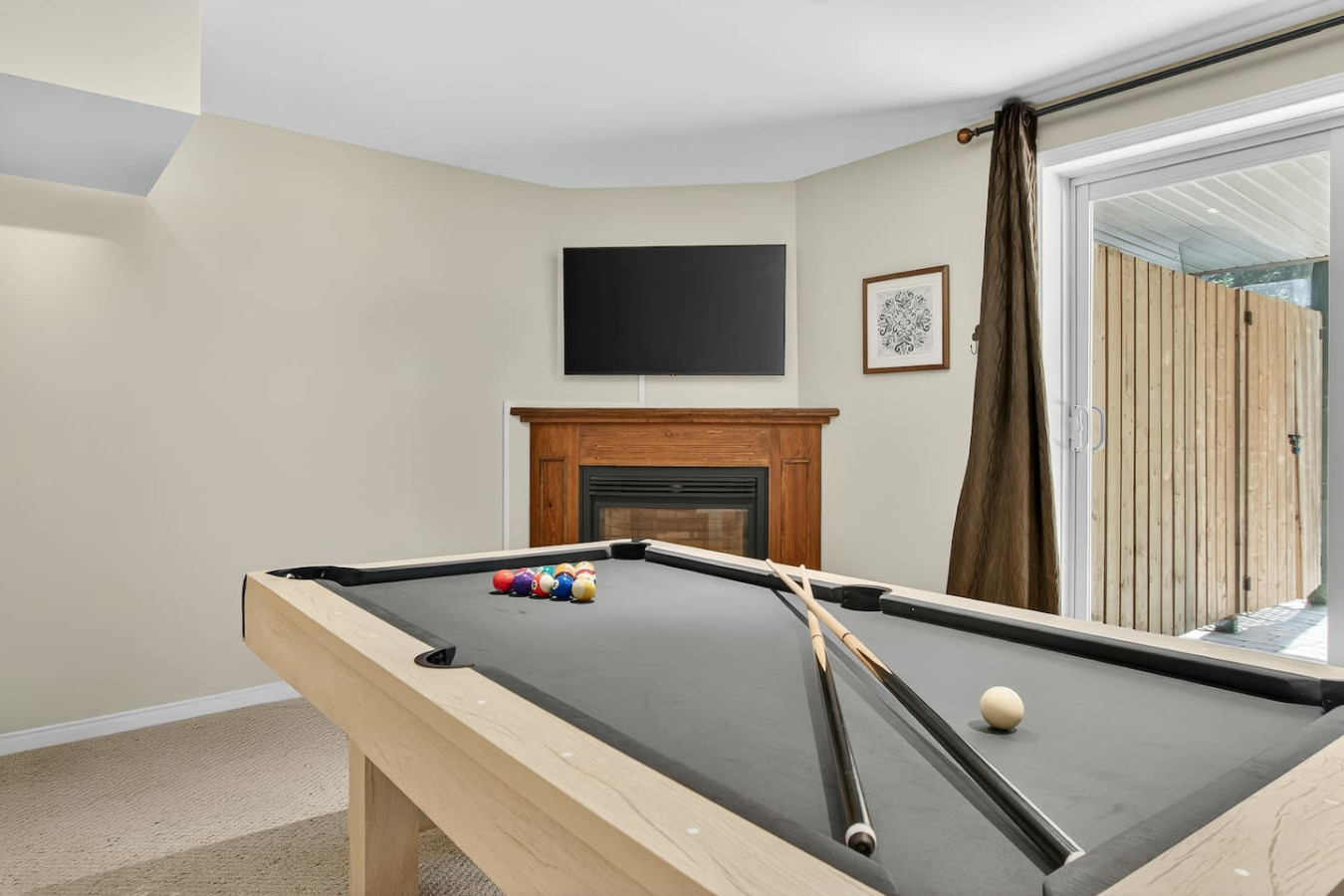 The garden level floor features a cozy den with another Smart TV, a gas fireplace, a pool table for games night and a brand new spa just outside, ready for deep relaxation.