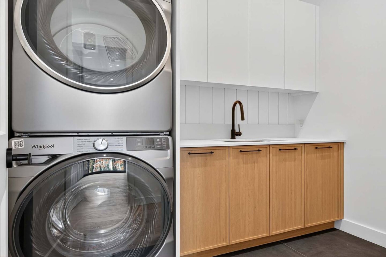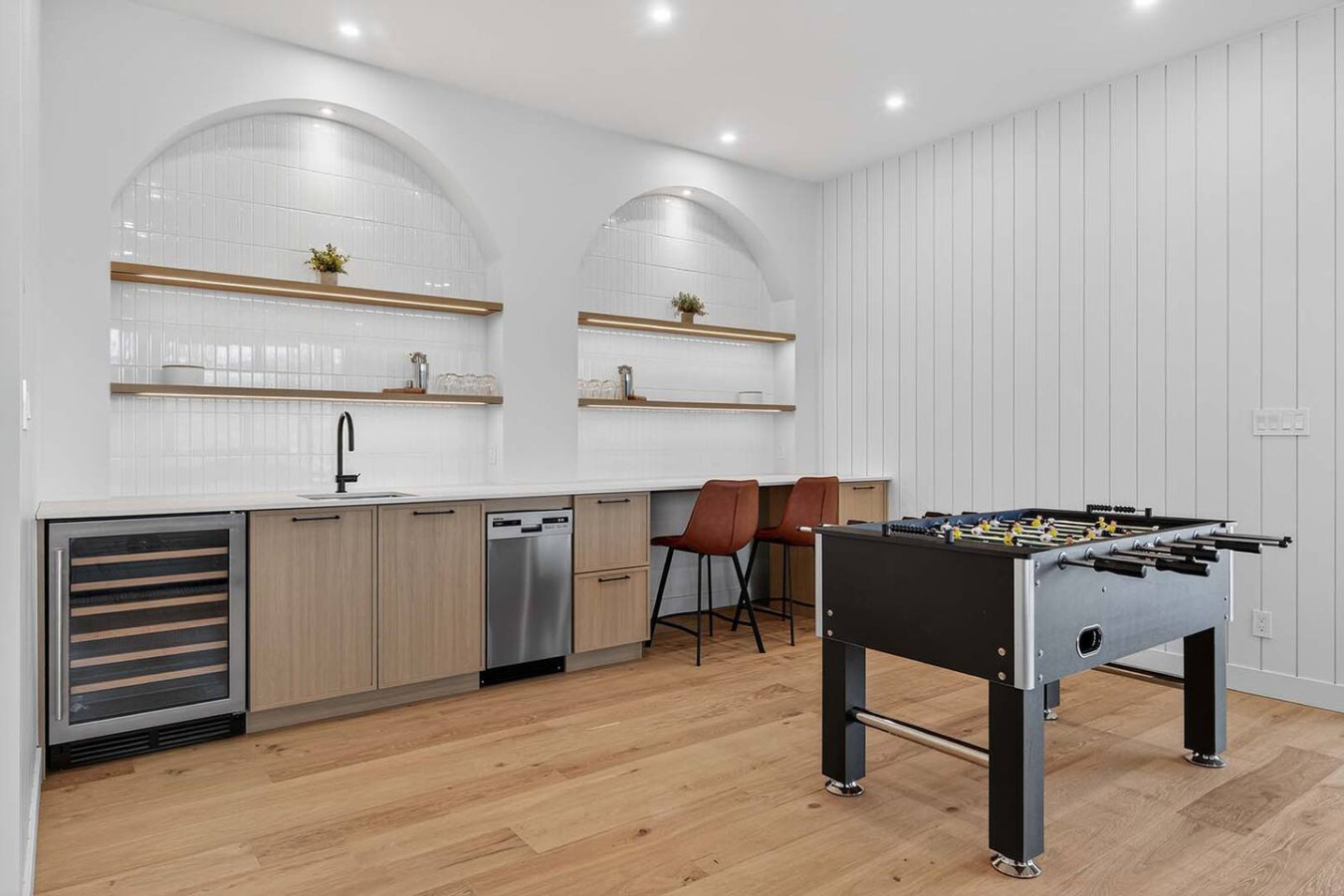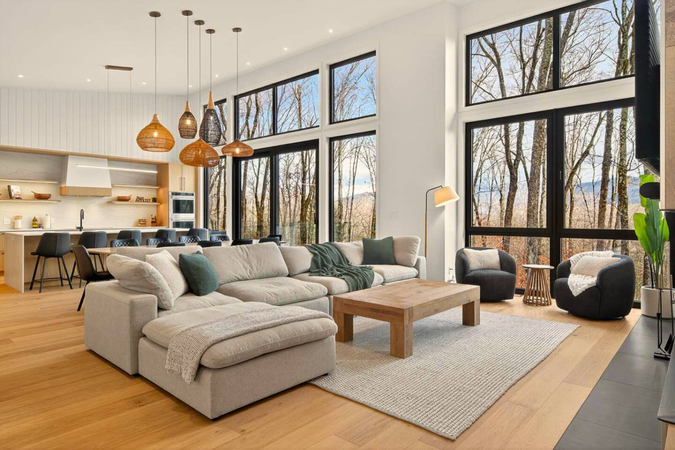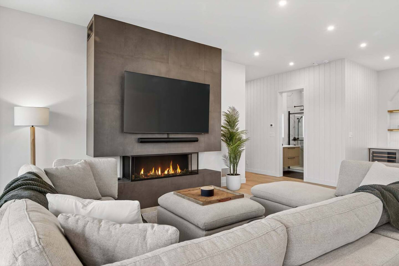 Large floor to ceiling windows let natural light fill the main living space. Upstairs, guests can relax in the main living room with the fireplace and Smart TV, curl up with a book in the second living area. Downstairs is the entertainment hub with a third living area, games, and a kitchenette.