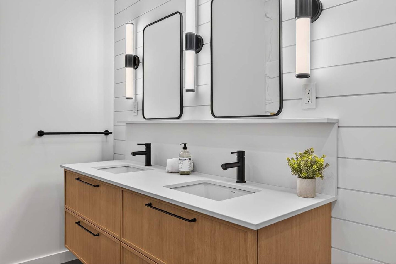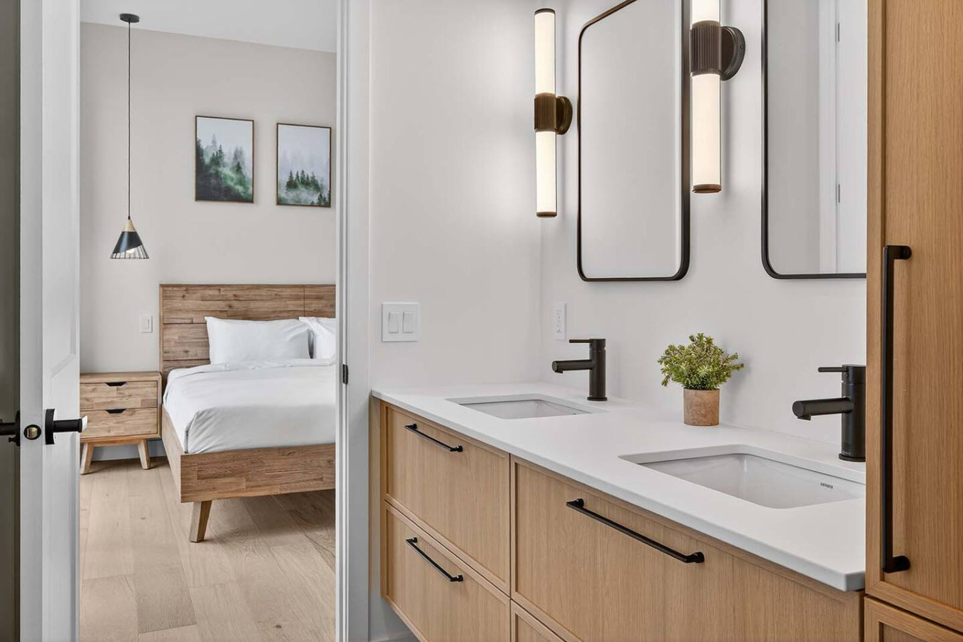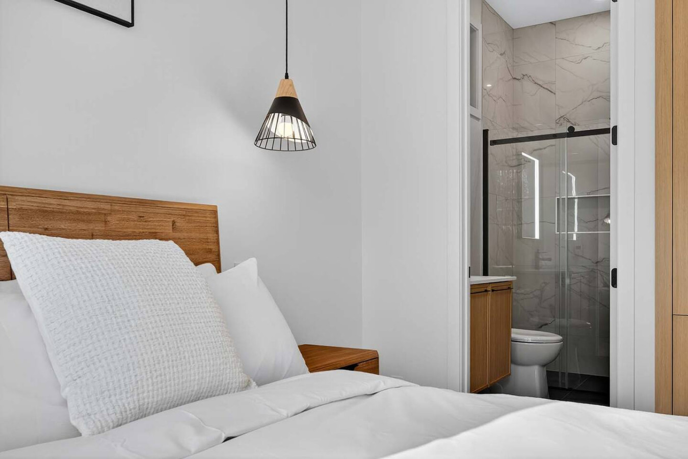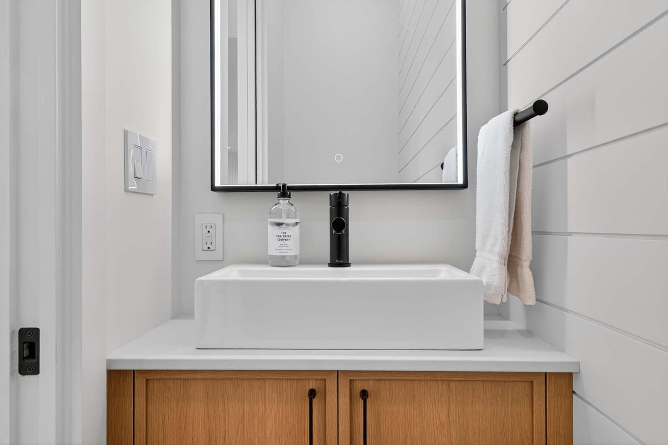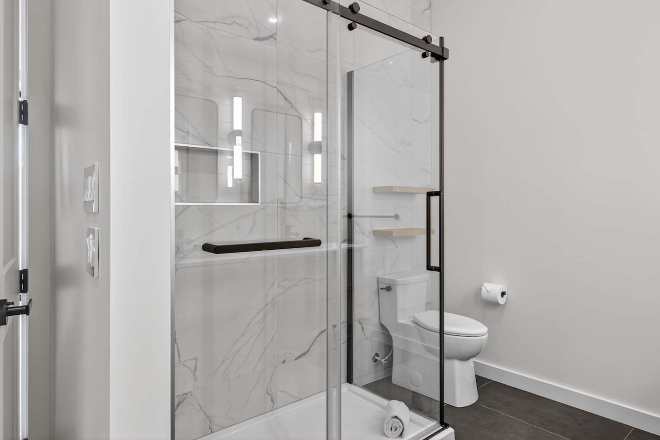 Large floor to ceiling windows let natural light fill the main living space. Upstairs, guests can relax in the main living room with the fireplace and Smart TV, curl up with a book in the second living area. Downstairs is the entertainment hub with a third living area, games, and a kitchenette.