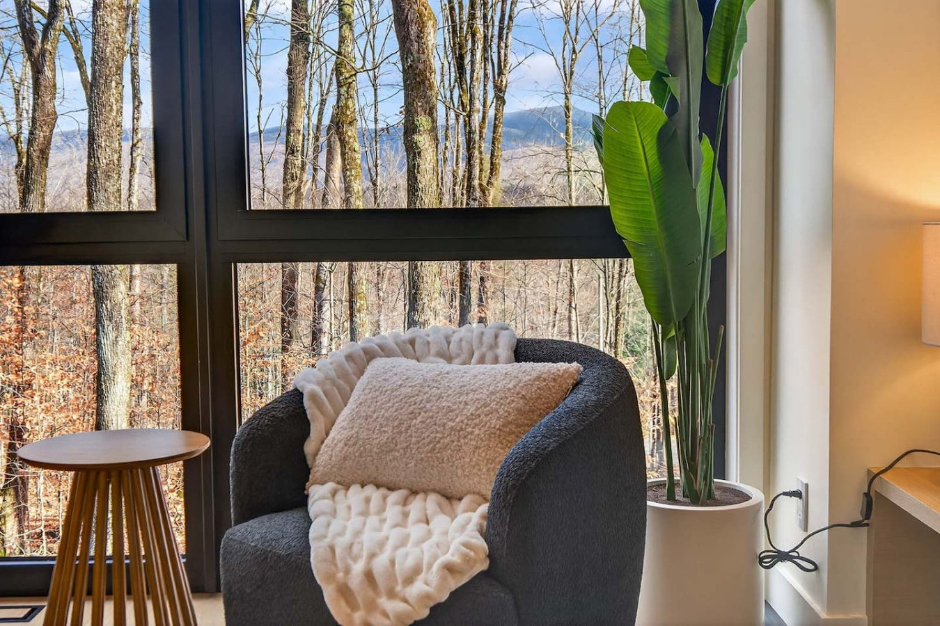 À l'extérieur, vous pourrez vous détendre dans le jacuzzi privé ou faire griller des marshmallows près du foyer extérieur. De grands arbres entourent la propriété et offrent une grande intimité.