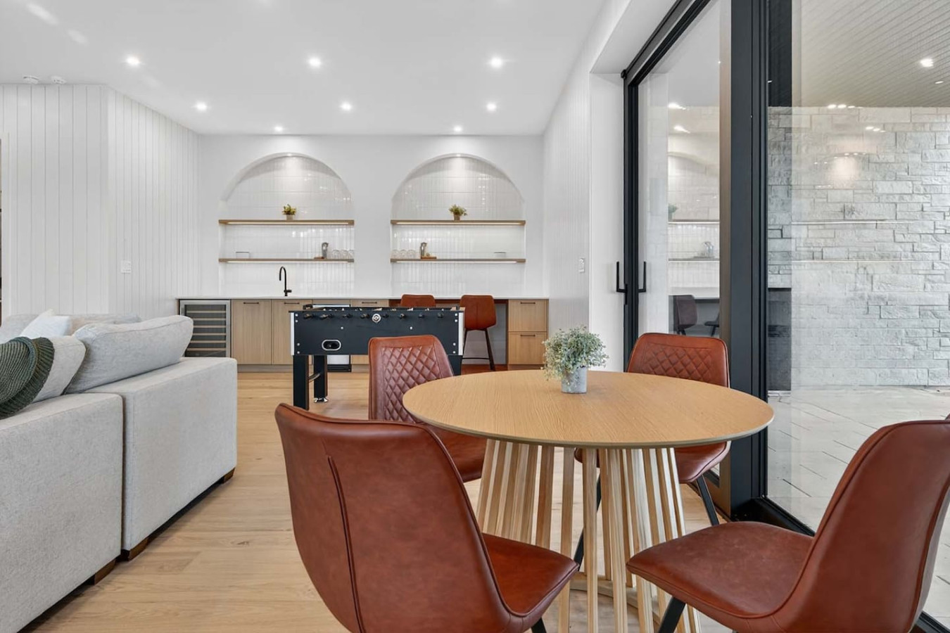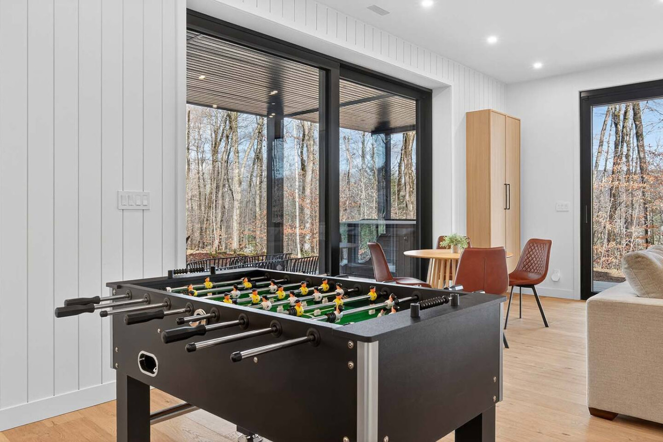 De grandes baies vitrées laissent entrer la lumière naturelle dans l'espace de vie principal. À l'étage, les clients peuvent se détendre dans le salon principal avec cheminée et Smart TV, ou se blottir avec un livre dans le deuxième salon. Au rez-de-chaussée se trouve l'espace de divertissement avec un troisième salon, des jeux et une kitchenette.