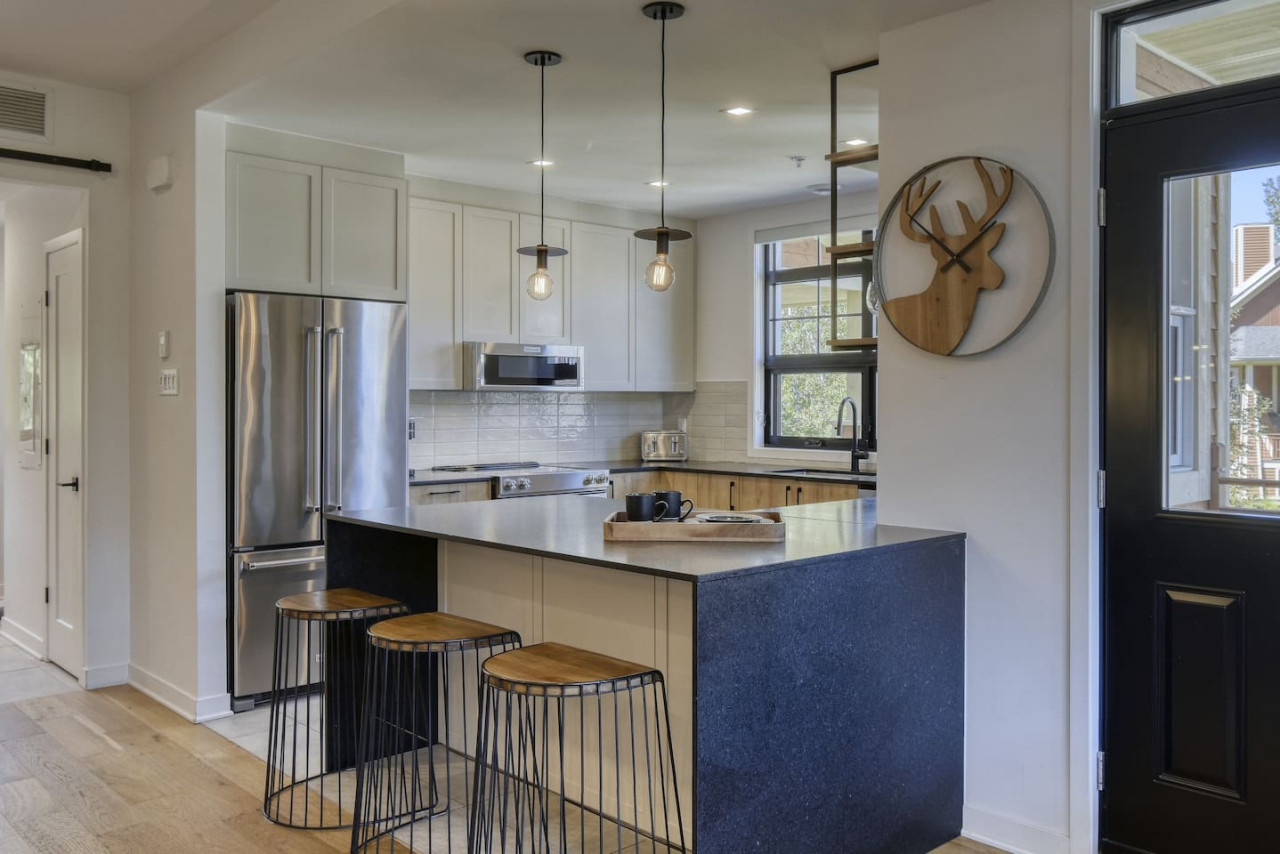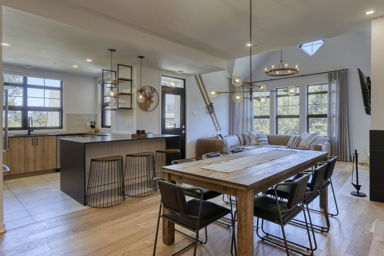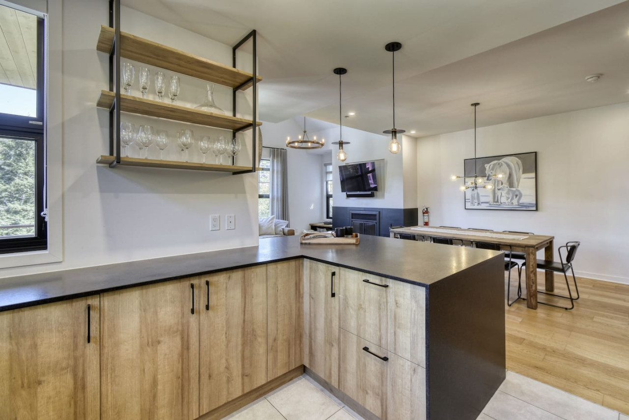 La cuisine est entièrement équipée de tout le nécessaire : ustensiles de cuisine, ustensiles de cuisson, couverts, vaisselle, machine à café Keurig et cafetière goutte à goutte. Il vous suffit de vous fournir en nourriture et en épices ! La salle à manger peut accueillir 8 personnes, ce qui permet à tout le monde de se réunir les soirs où vous ne mangez pas dans l'un des restaurants locaux de Tremblant. Des portes coulissantes en verre permettent d'accéder facilement au balcon privé, équipé d'un barbecue et de sièges extérieurs.