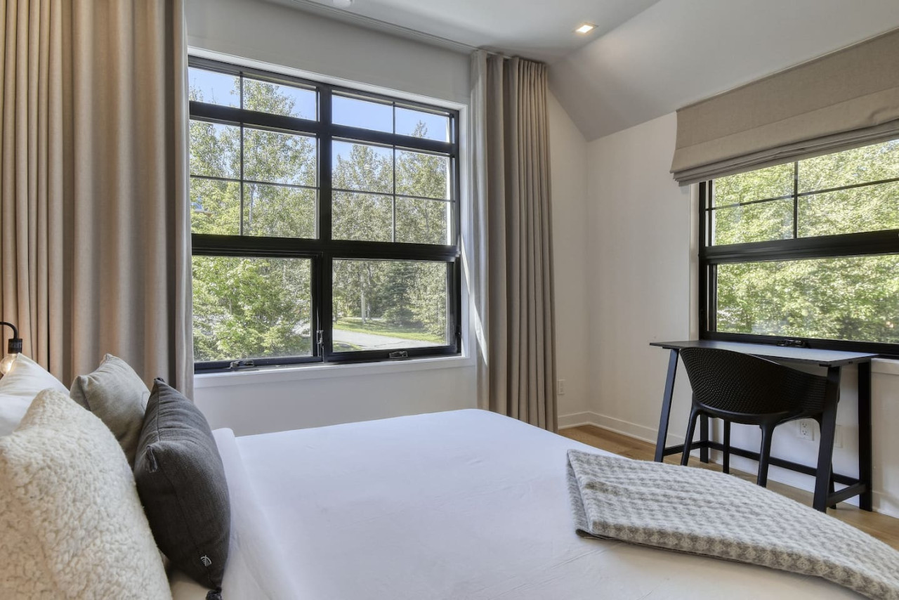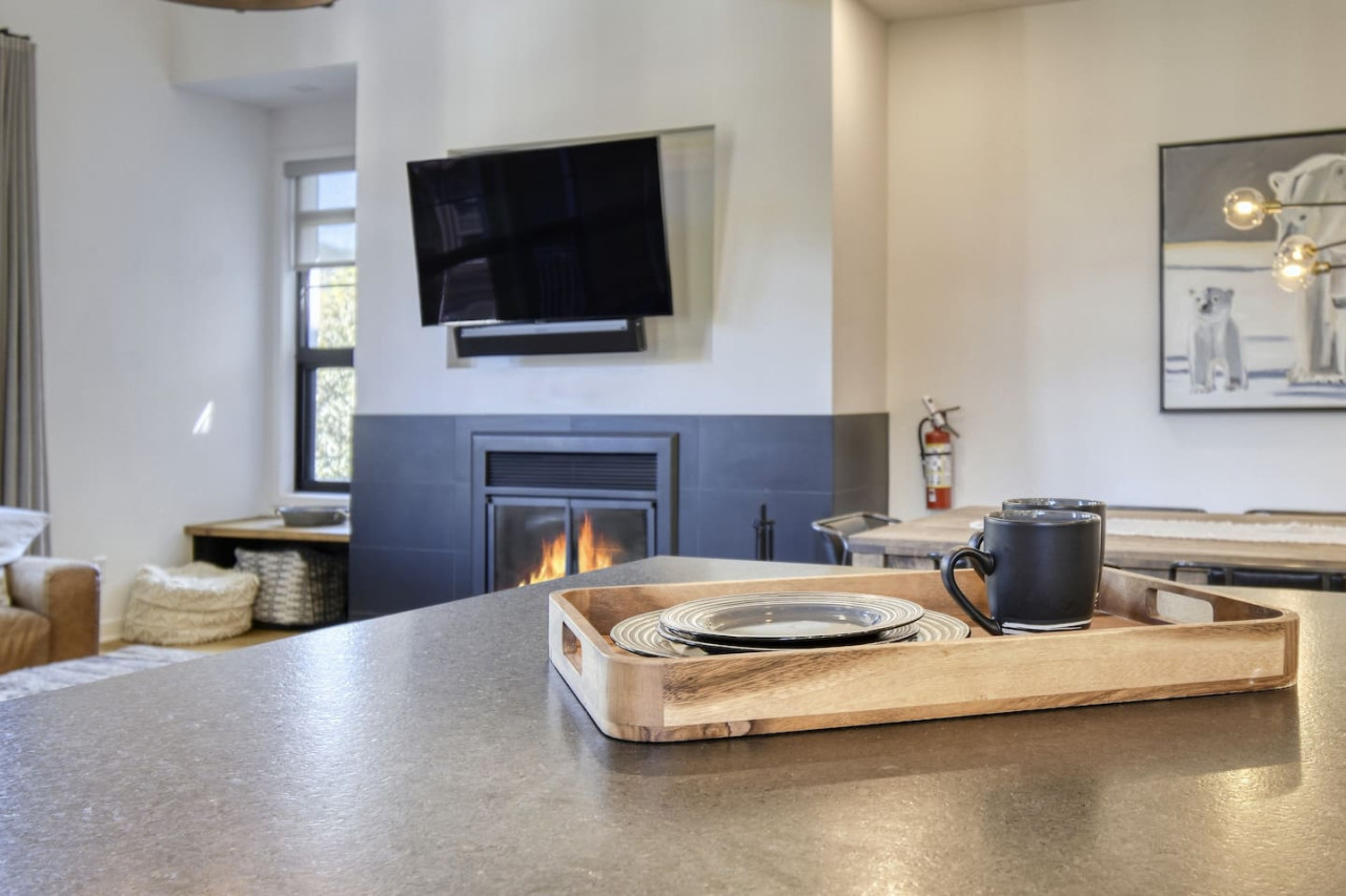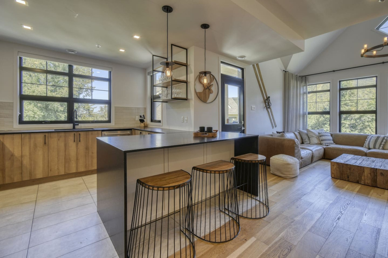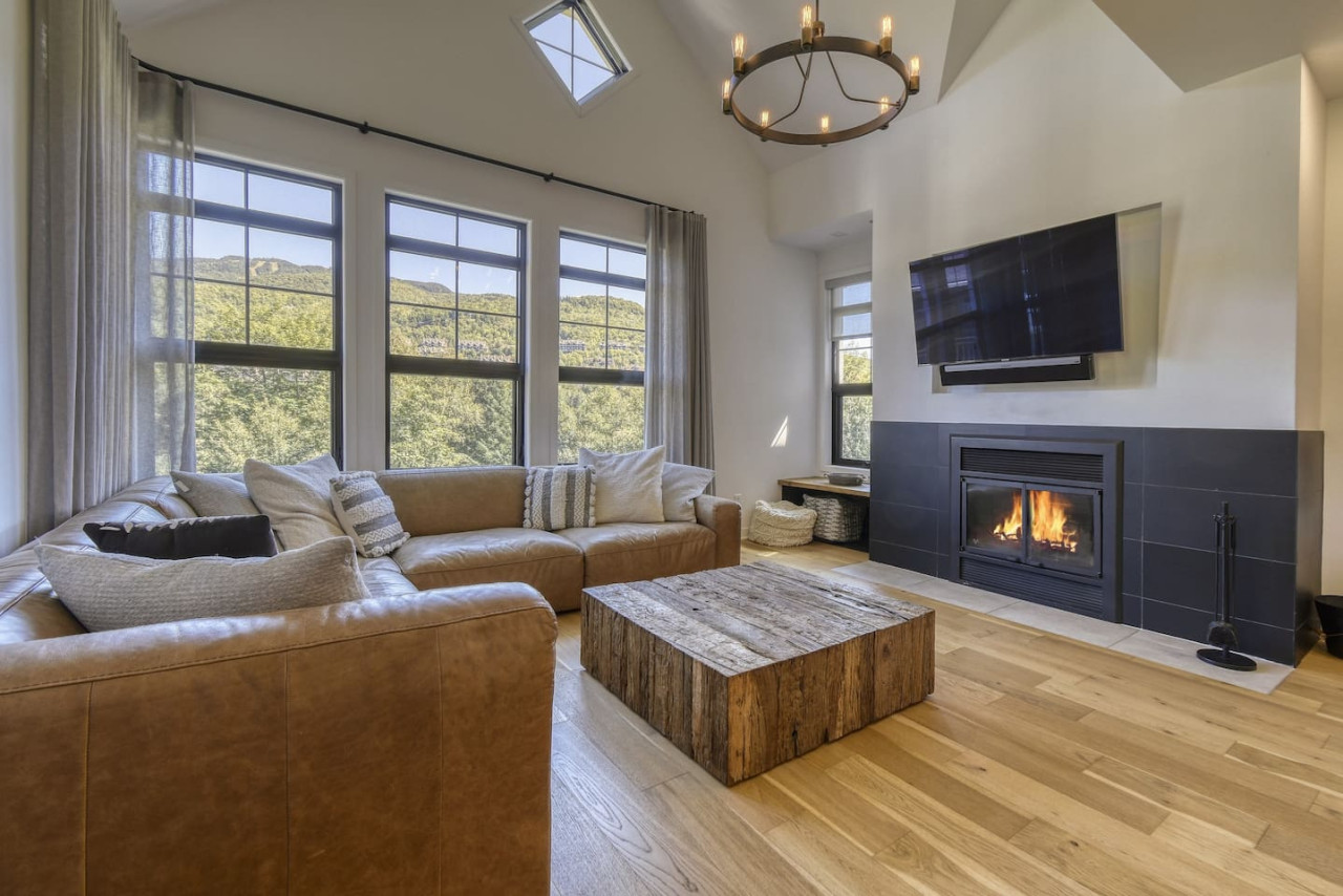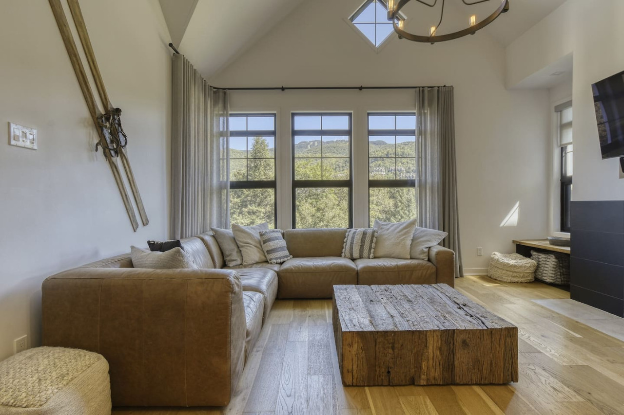 Dès que vous passez la porte, vous entrez dans un espace de vie ouvert, avec un grand canapé en cuir face à la cheminée à bois et à la télévision par câble. Les grandes fenêtres offrent une lumière naturelle et une vue sur les montagnes.