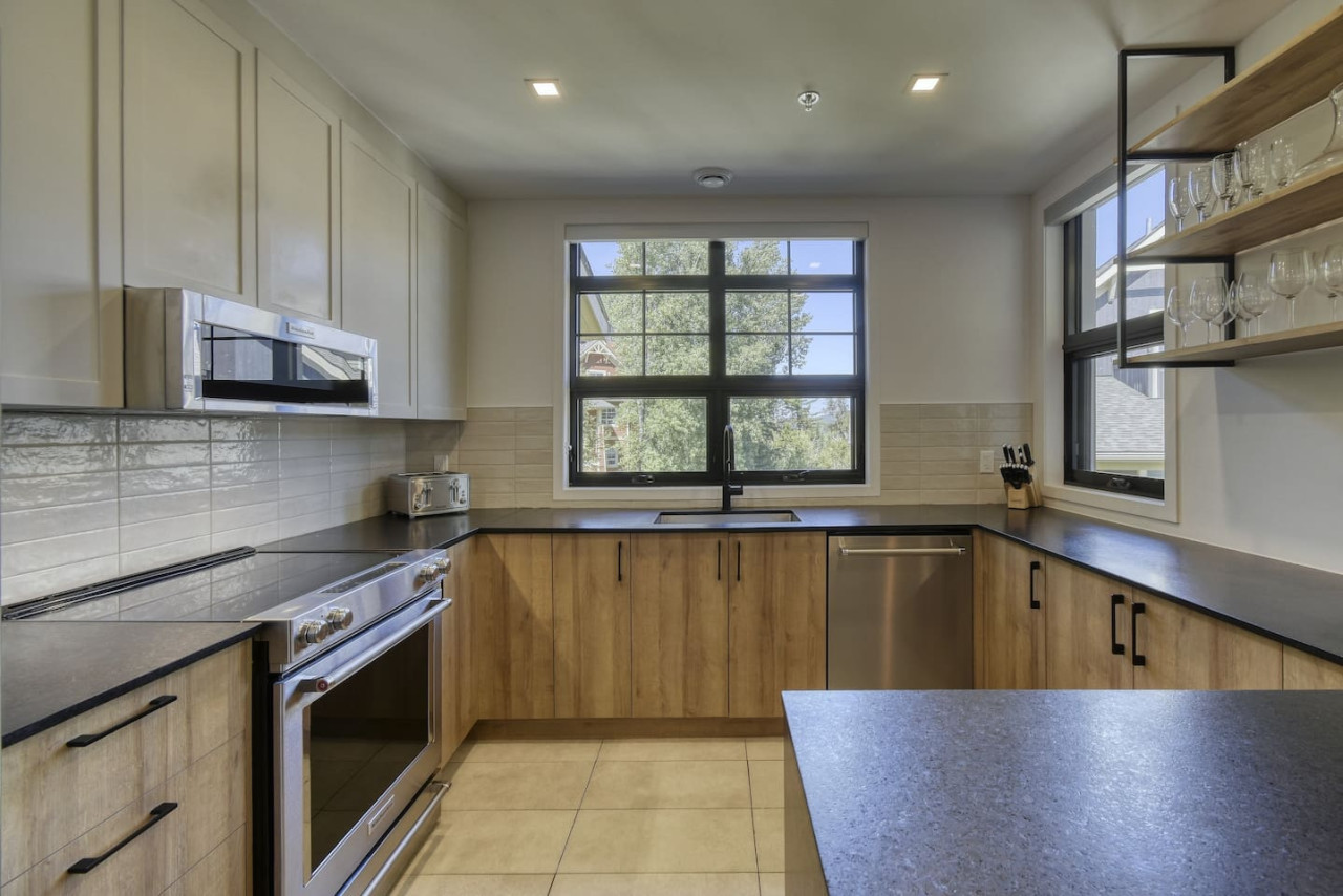 As you walk through the door, you'll enter the open concept living area with a large leather sofa facing the wood burning fireplace and cable TV. The large windows provide bright natural light and mountain views.