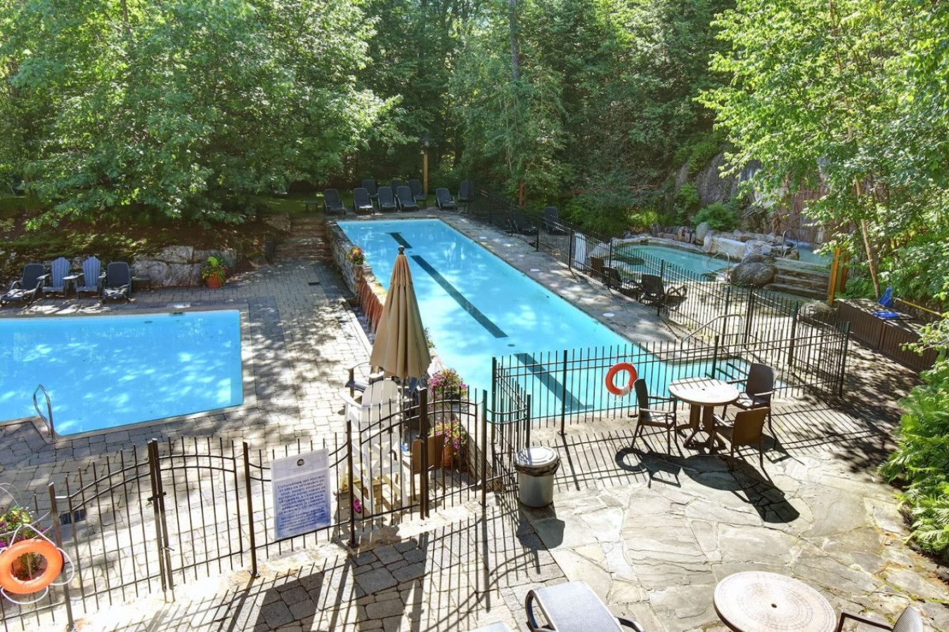 The Les Eaux community has a shared aquatic facility including a seasonal pool and a year-round hot tub.