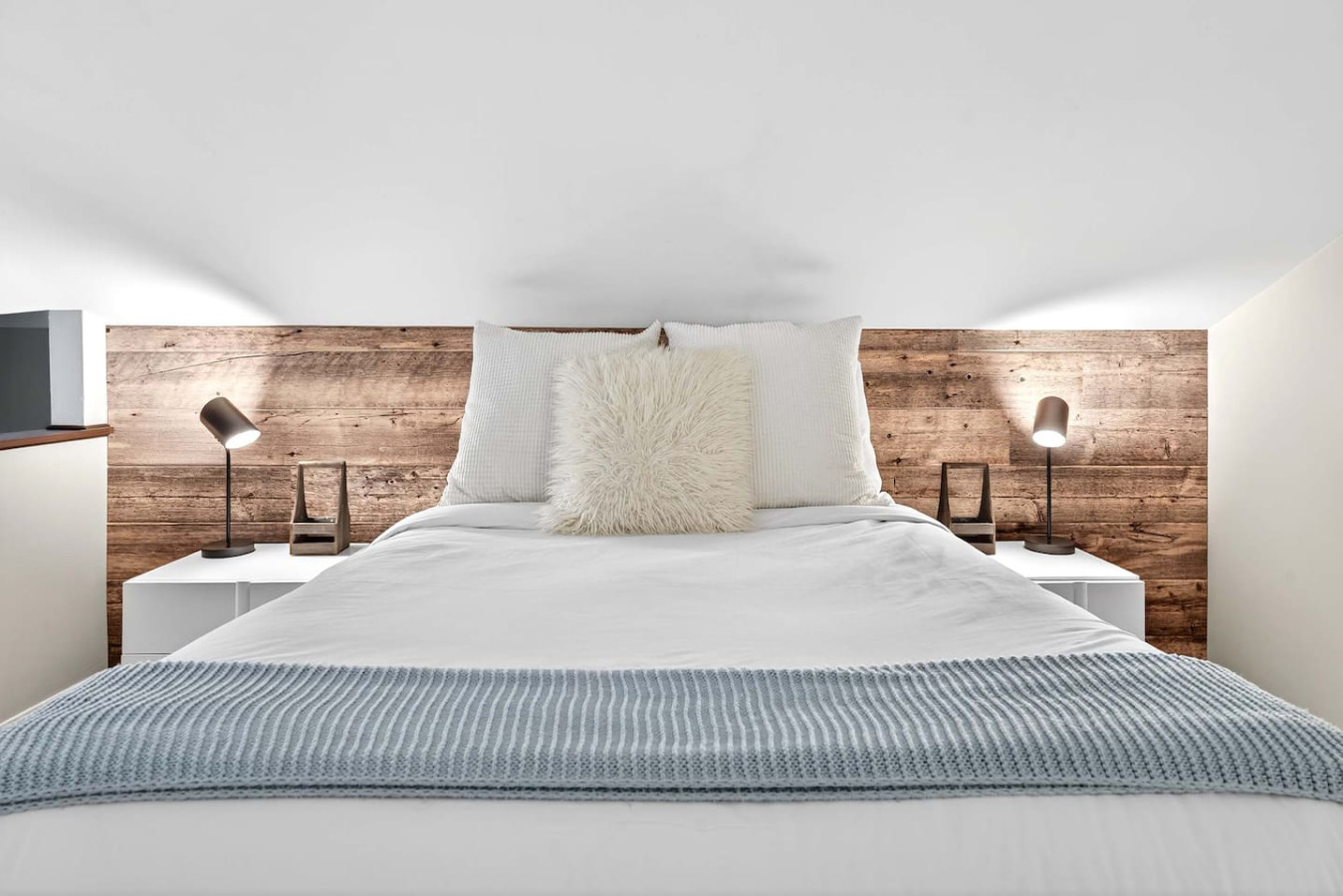 Chambre 2 (mezzanine) : lit queen size, ouverte sur le salon