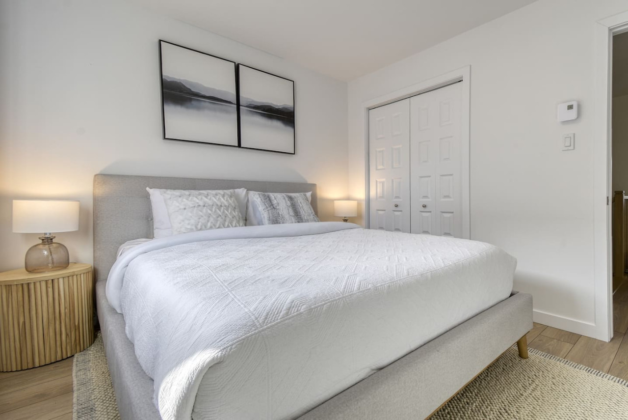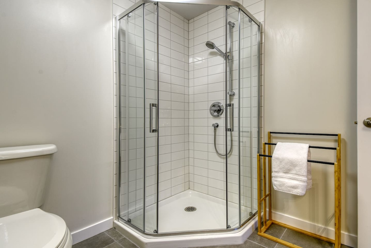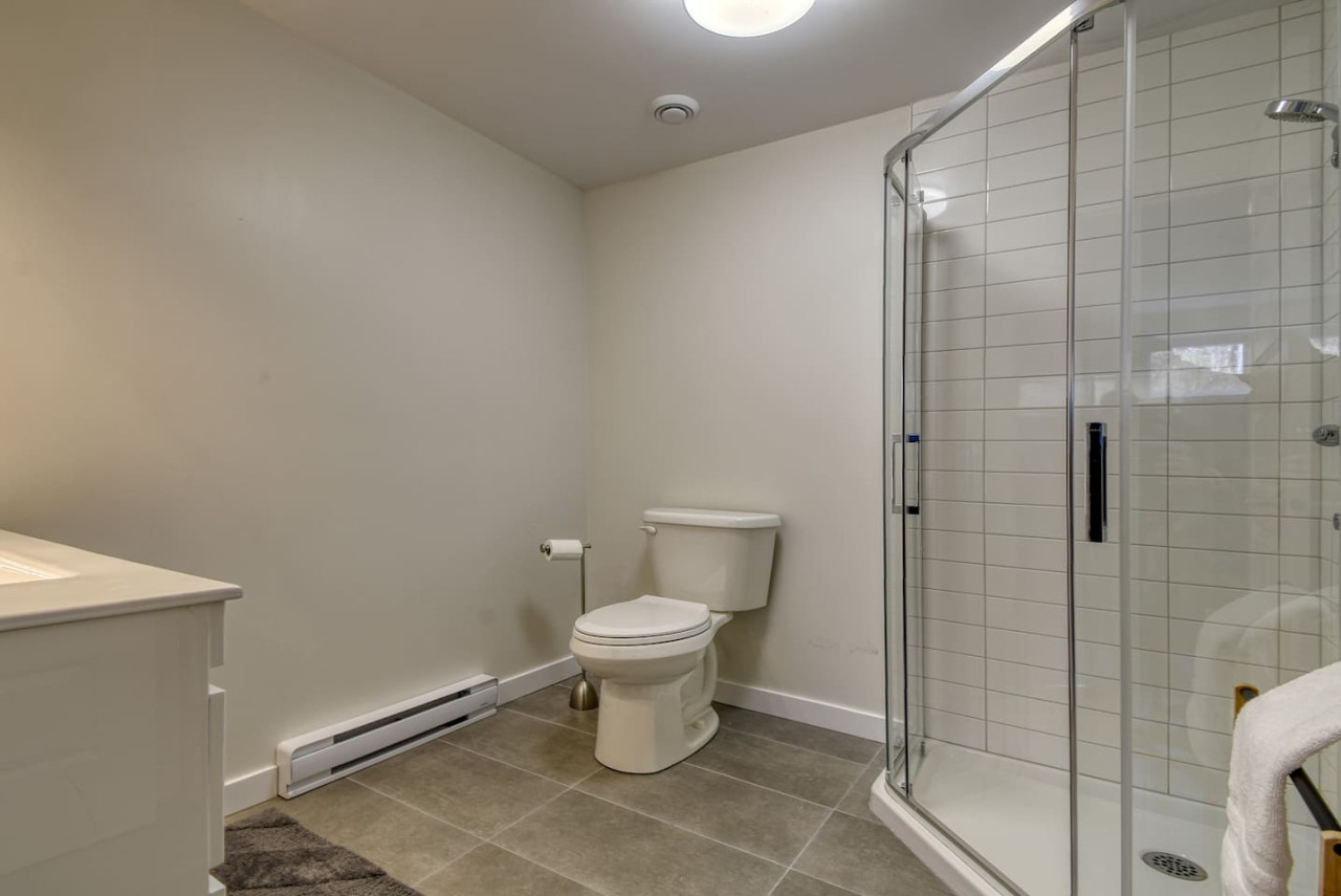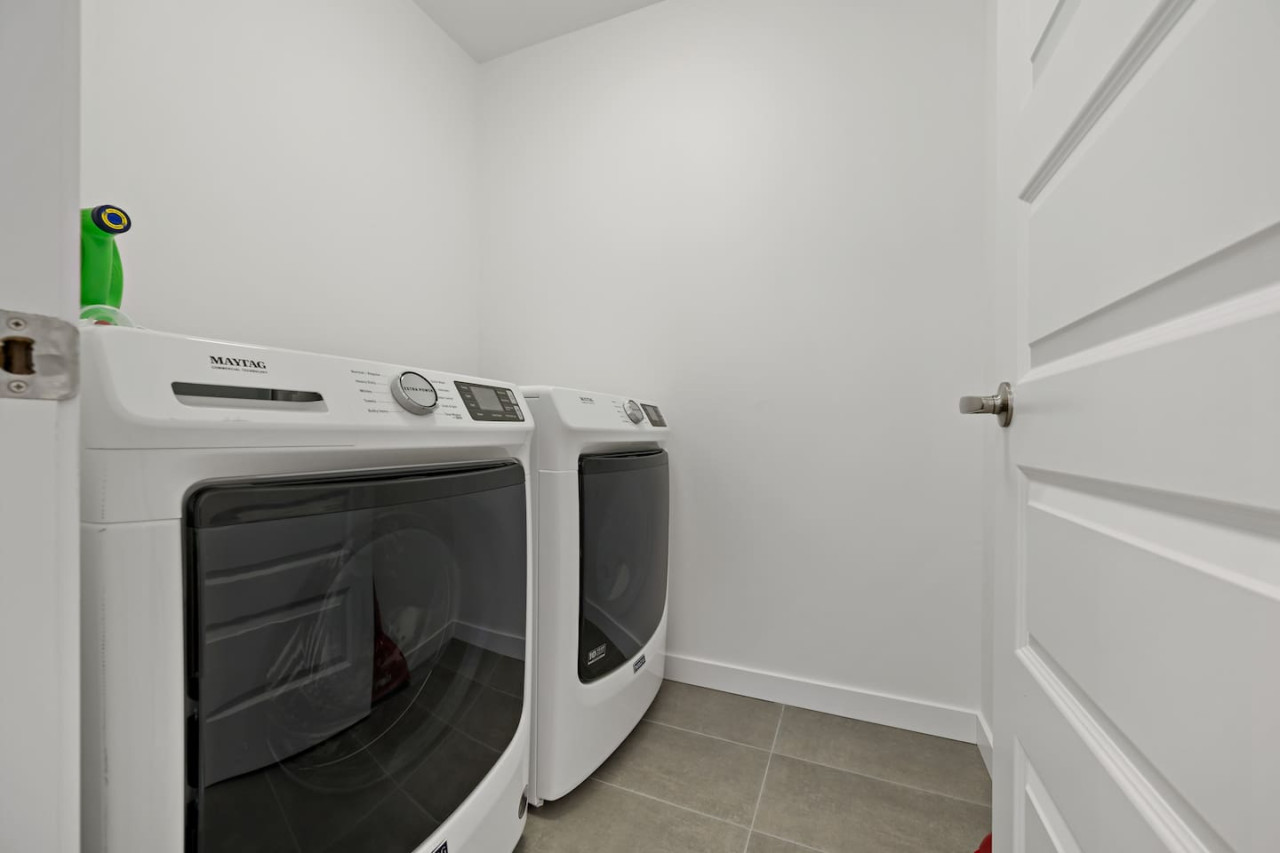 There are 4 bedrooms in this home, 3 upstairs and one in the basement. Bedroom #1, the primary, has a King size bed, workspace, and closet, and full ensuite. Bedrooms #2 and #3 are upstairs and each have a queen size bed. In the basement, you’ll find bedroom #4 with two twin over double bunk beds. There are 3.5 bathrooms in total including the primary bedroom ensuite.
