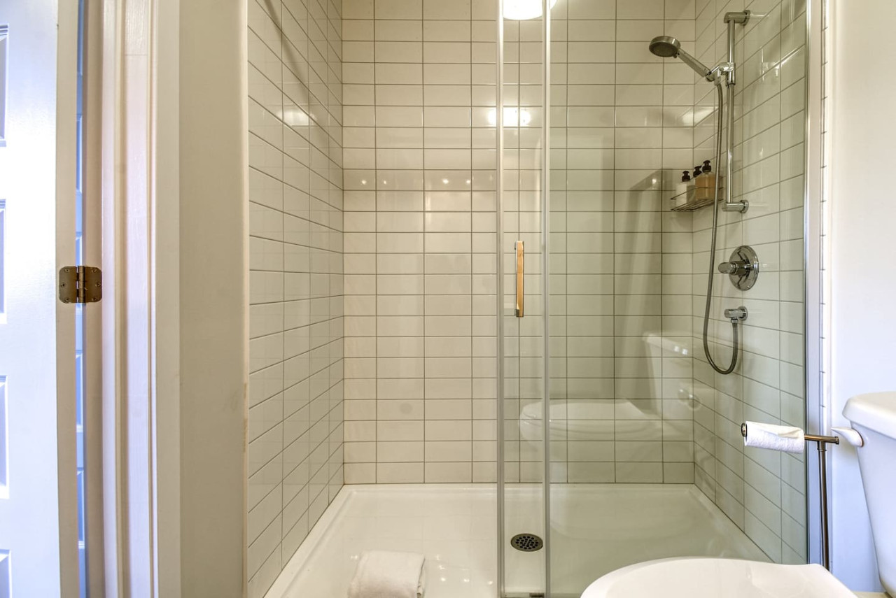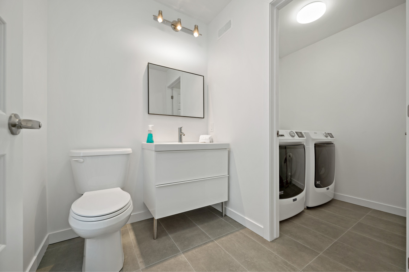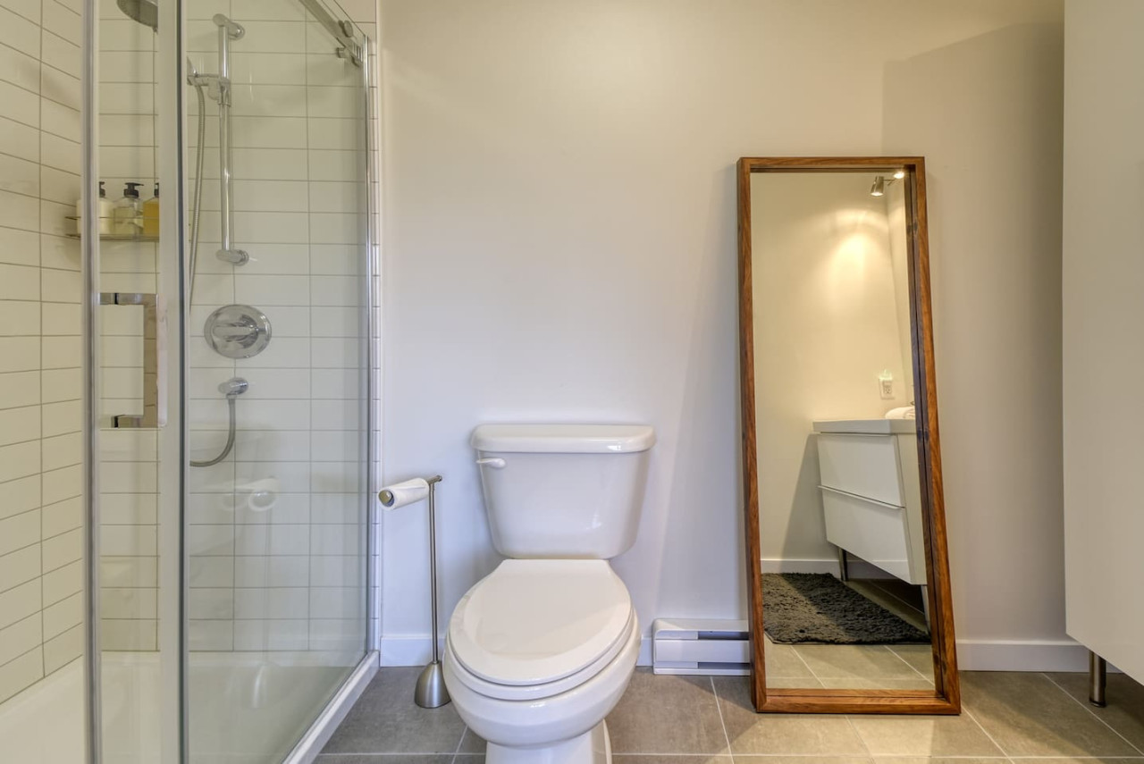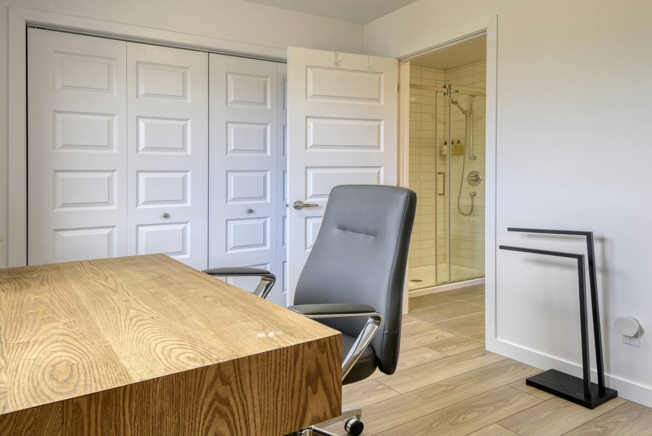 There are 4 bedrooms in this home, 3 upstairs and one in the basement. Bedroom #1, the primary, has a King size bed, workspace, and closet, and full ensuite. Bedrooms #2 and #3 are upstairs and each have a queen size bed. In the basement, you’ll find bedroom #4 with two twin over double bunk beds. There are 3.5 bathrooms in total including the primary bedroom ensuite.